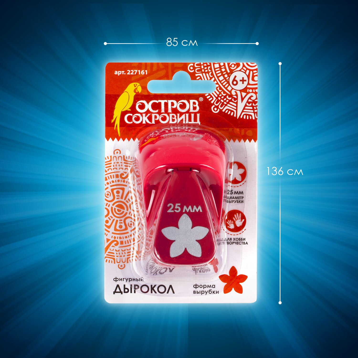 Дырокол компактный и удобный в применении, размер - 6,7х8,5х13,6 см. Диаметр пробиваемого отверстия - 25 мм, форма вырубки - цветок. Выполнен в красном цвете. Режущие части, изготовленные из высококачественного металла, защищены пластмассовым корпусом, что делает дыроколы ОСТРОВ СОКРОВИЩ безопасными для детей.
