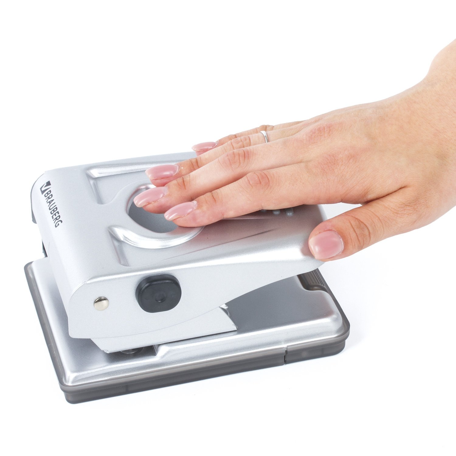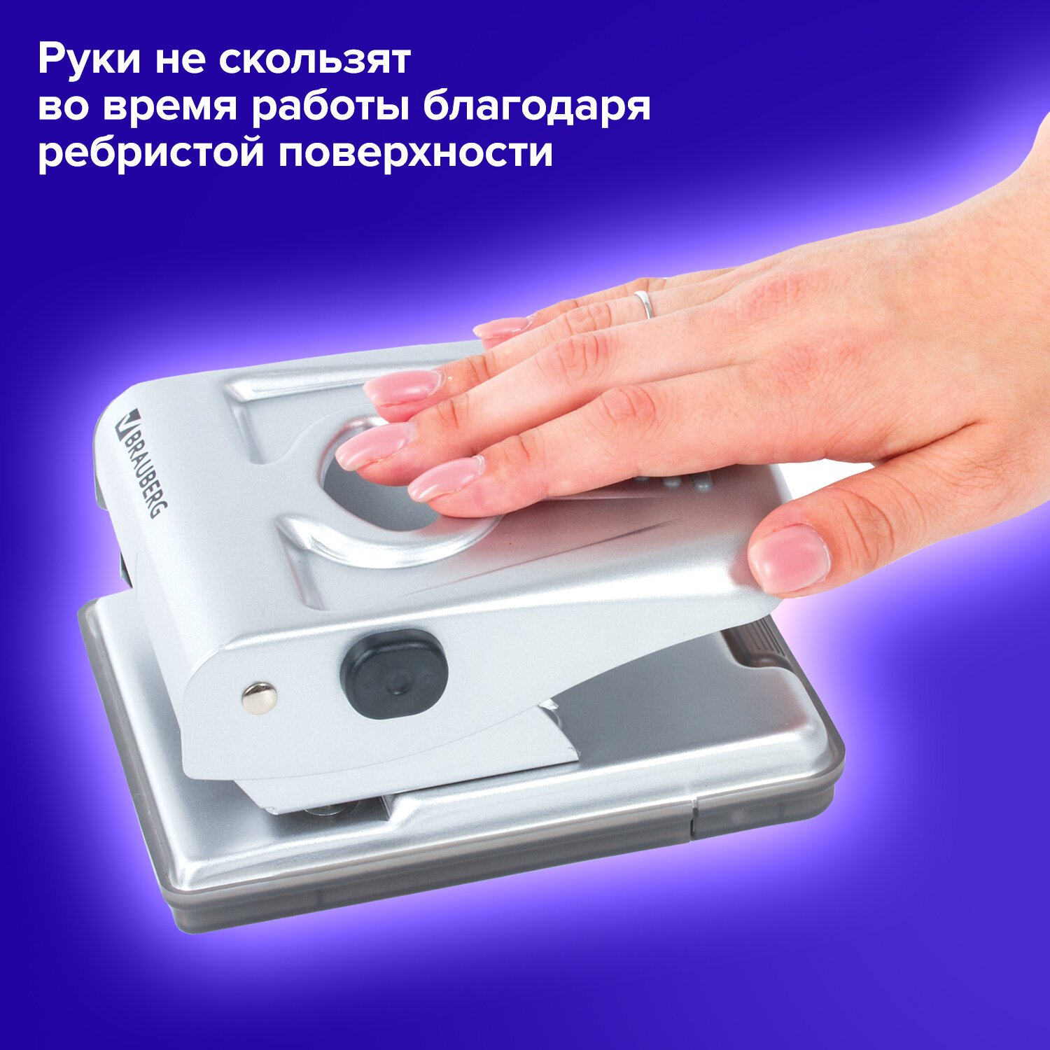 Дырокол BRAUBERG "Metallic" – это необходимый офисный предмет, с помощью которого можно аккуратно пробивать отверстия в бумаге и затем подшивать документы в папку.