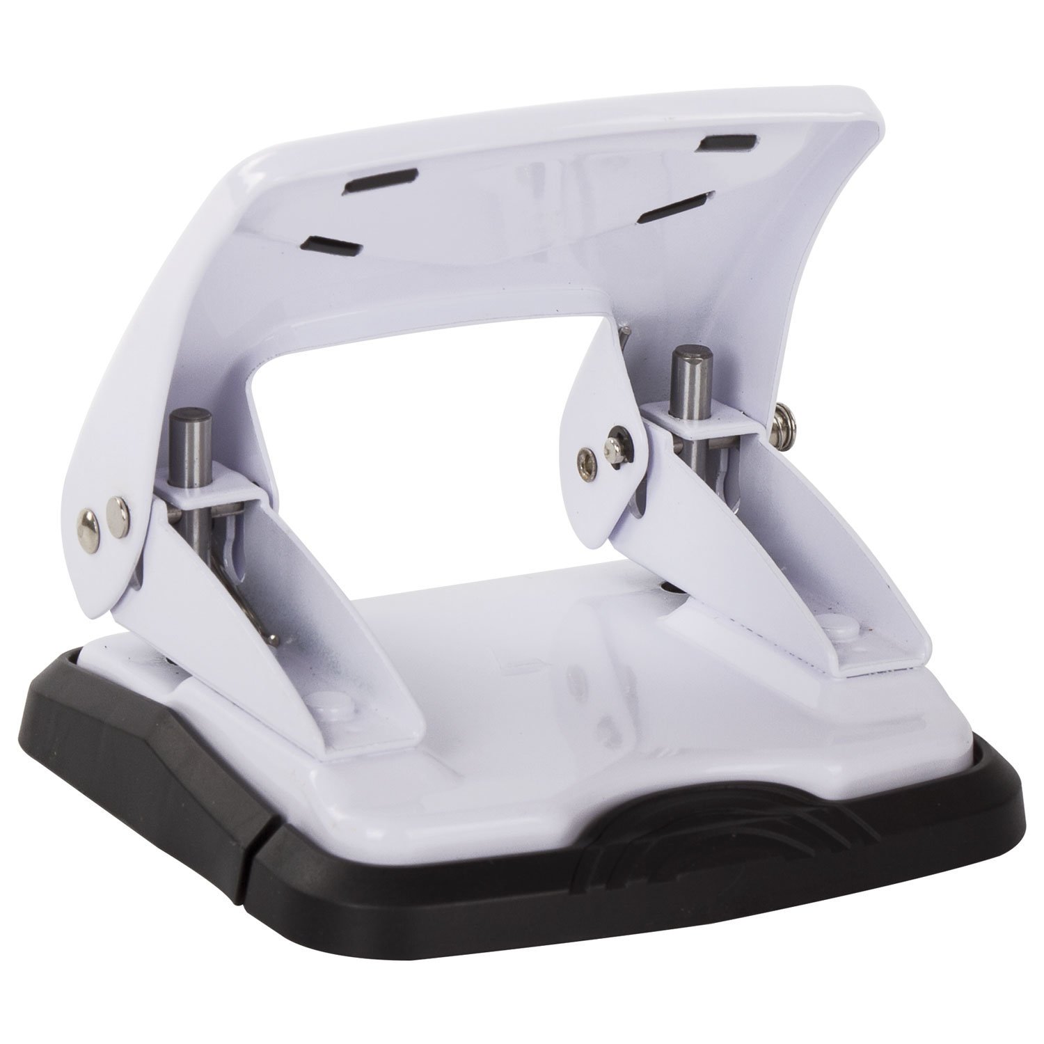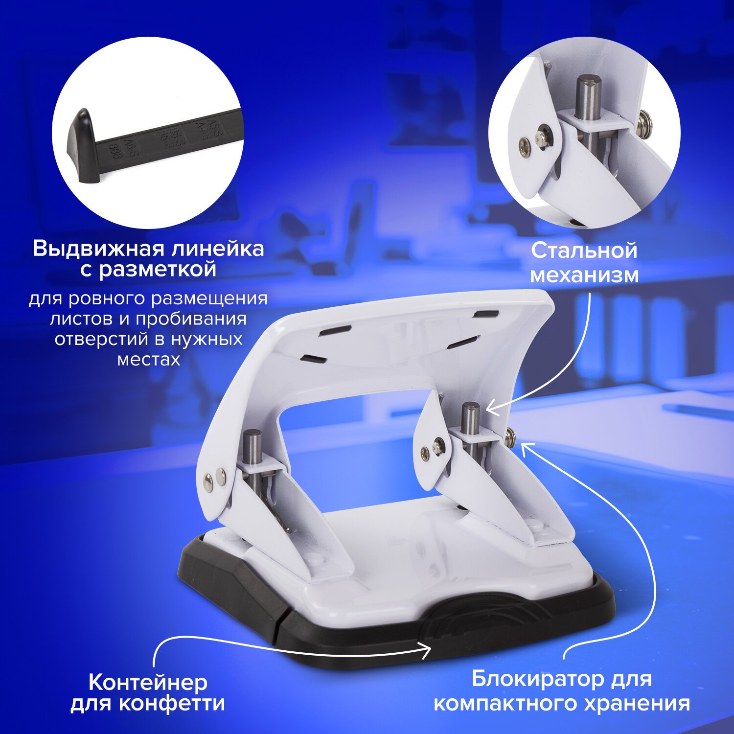 Способен пробить за один раз 35 листов бумаги. Стандартное количество пробиваемых отверстий - 2, диаметр каждого - 6 мм. Благодаря расстоянию между отверстиями в 8 см проколотые дыроколом листы могут храниться в папке идеально ровно и не мяться. Когда будет завершен отчетный период, они обычно сшиваются ниткой и снимаются с металлических колец. Метка центрирования поможет ровно разместить листы. Наличие ограничительной линейки позволяет пробить отверстия в нужном месте, что делает возможным сложить документы в папку ровной стопкой. Дырокол оснащен блокиратором для компактного хранения. Основная задача контейнера для конфетти состоит в сборе мусора, благодаря чему не будет постоянно загрязняться рабочее пространство. Малые размеры делового аксессуара помогут с легкостью разместить на рабочем столе, а классический белый в сочетании с черным цветом отлично впишется в любой интерьер.