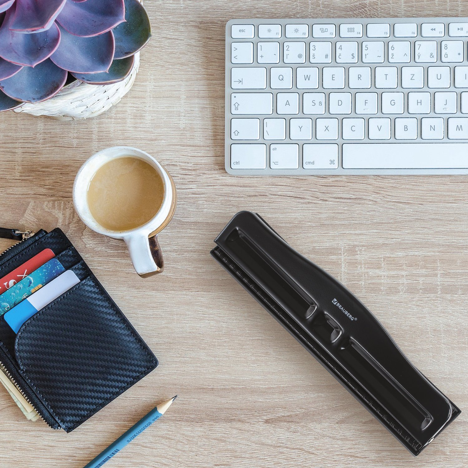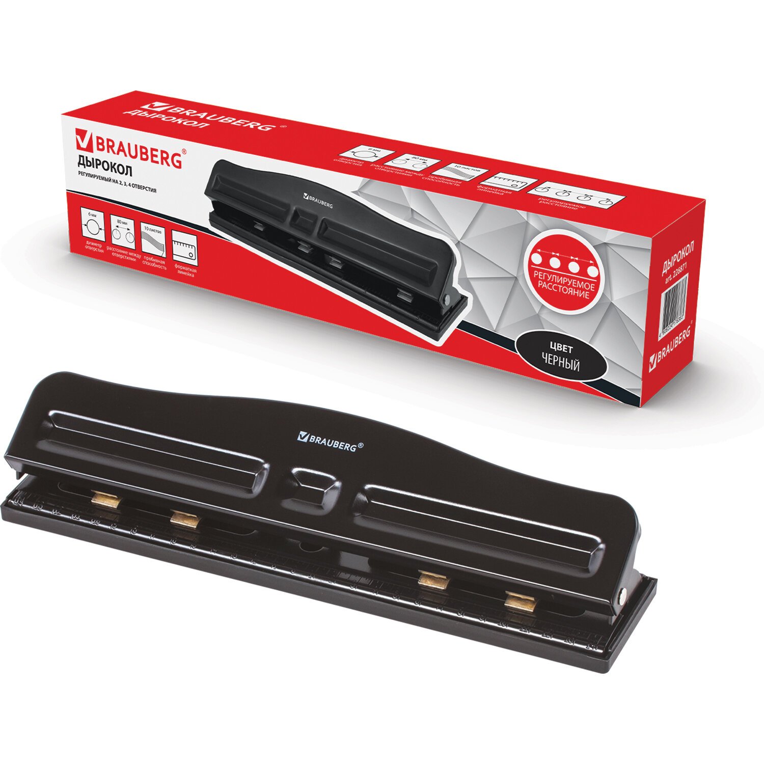 Металлический дырокол BRAUBERG "HL-4" позволяет аккуратно и точно пробить в бумаге 4 отверстия.