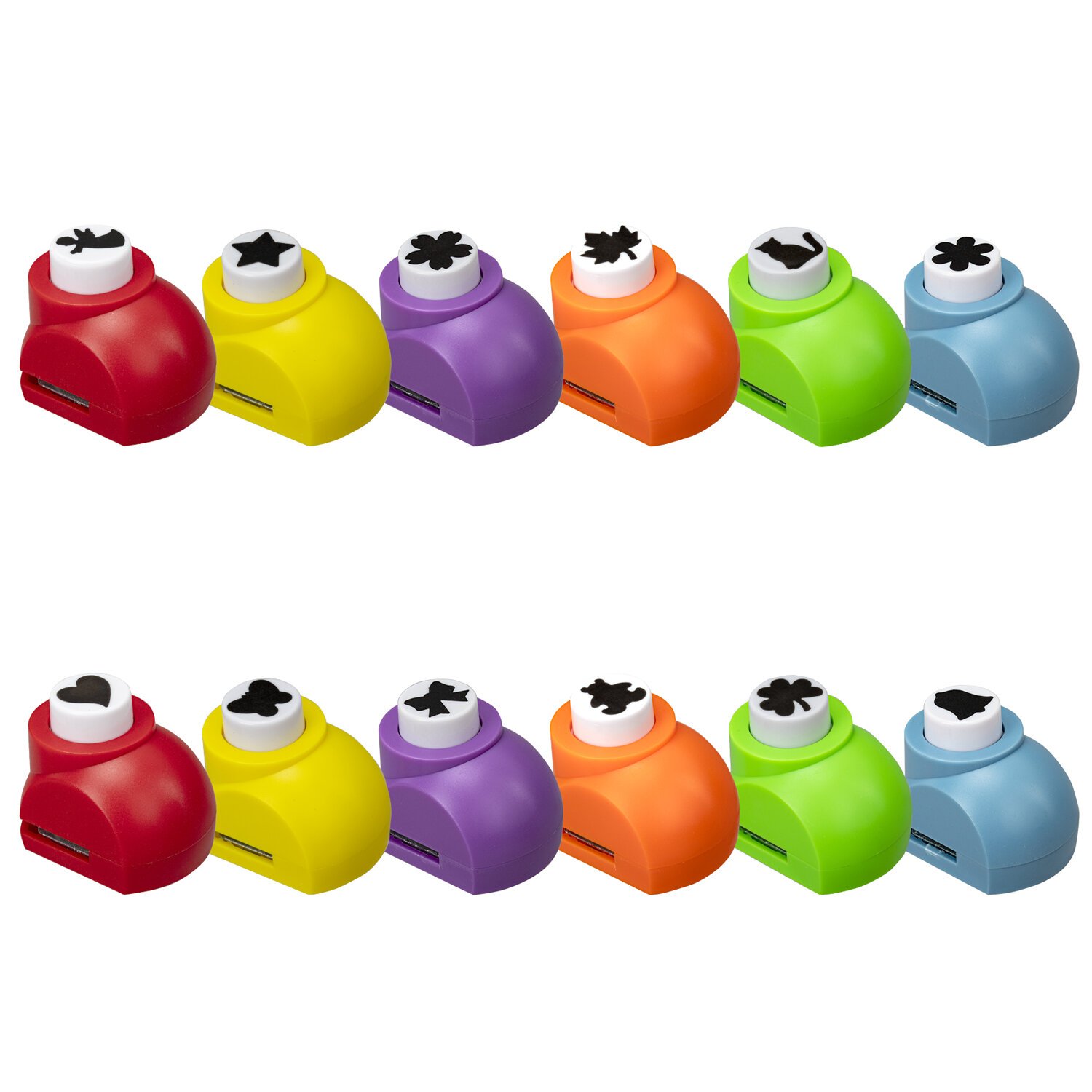 Фигурные дыроколы ОСТРОВ СОКРОВИЩ предназначены для декорирования изделий путем создания четкой и красивой перфорации разной формы. Дырокол компактный и удобный в применении, размер - 32х45х38 мм. Диаметр пробиваемого отверстия - 16 мм, формы вырубки: сердце, звезда, василёк, клевер, кленовый листок, бантик, бабочка, ангел, колокольчик, мишка, кот, цветок. Один дырокол делает одну форму вырубки. В наборе – 12 видов дыроколов разных цветов с разными вырубками.