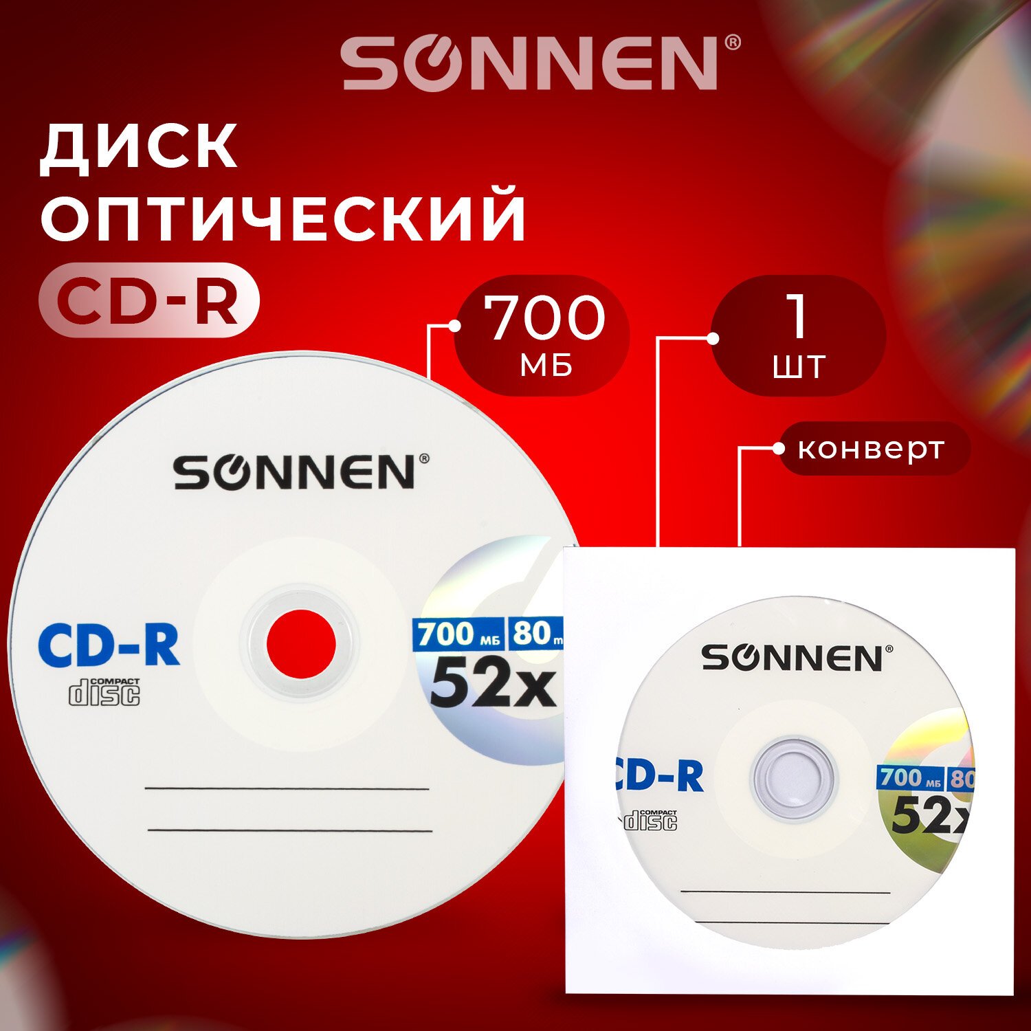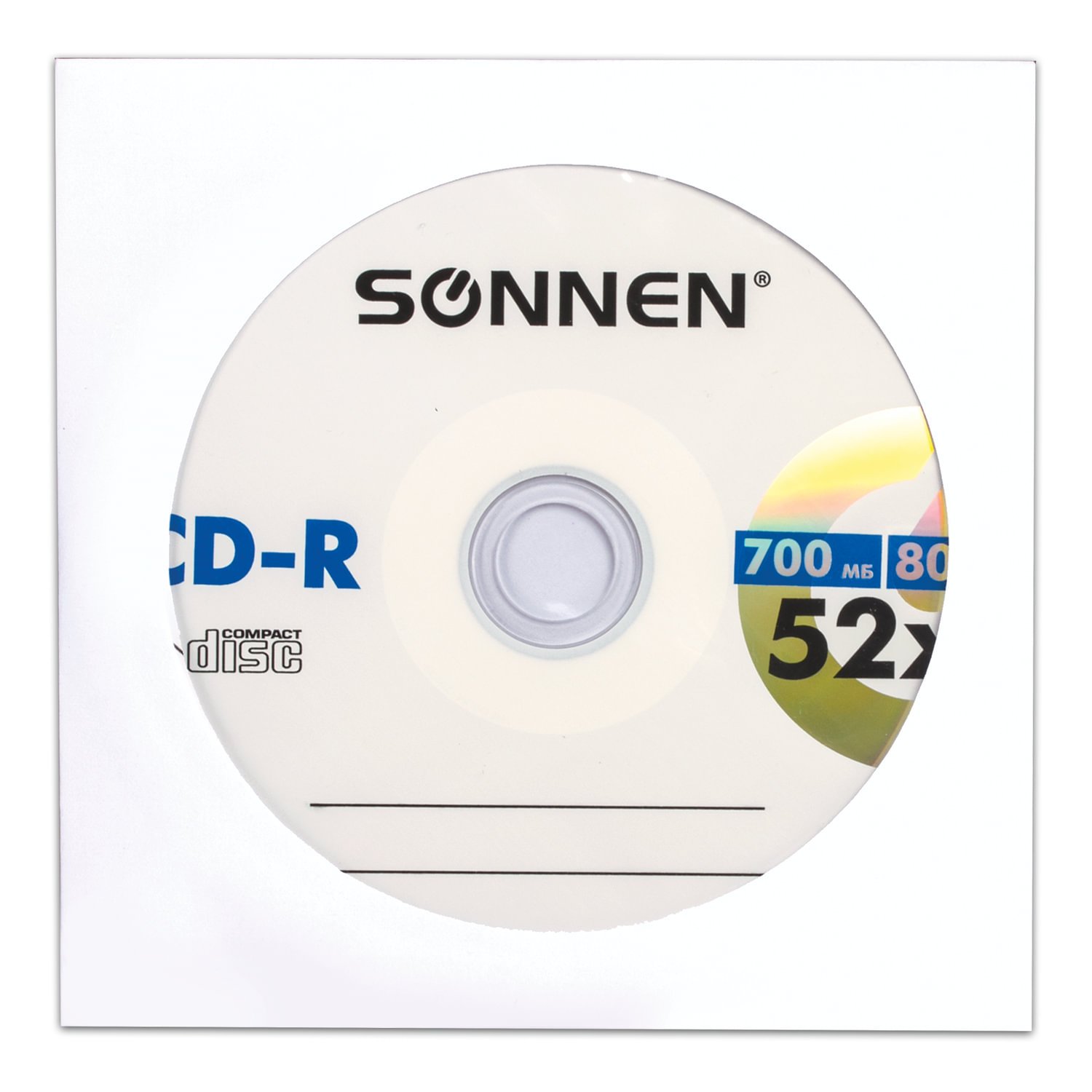 Диск CD-R SONNEN, 700 Mb, 52x, бумажный конверт (1 штука), 512573