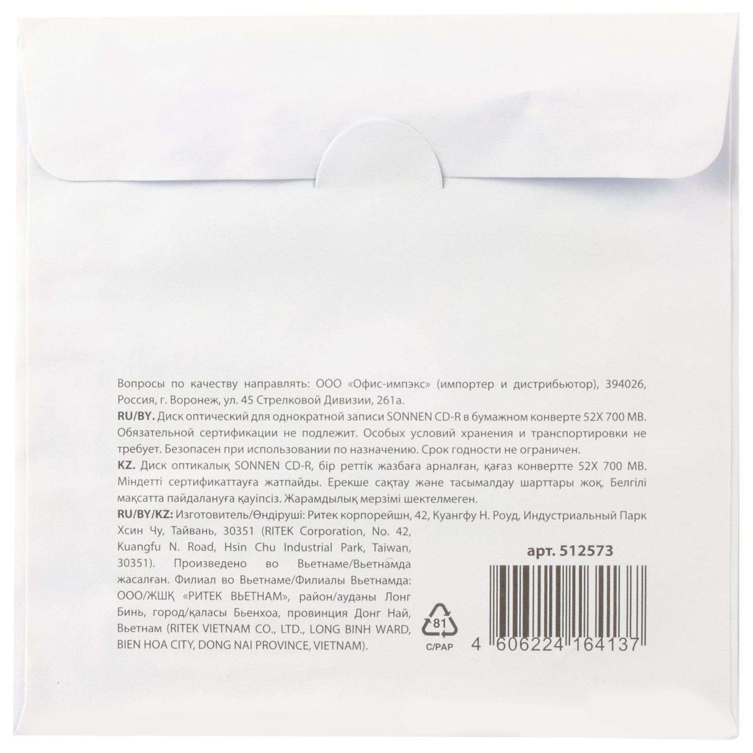 Стабильное качество и высокая скорость записи - это CD-R SONNEN. Сбалансированная структура диска надёжно обеспечивает устойчивость записи и чтение информации на высоких скоростях. Отлично подходит для хранения любой информации.
