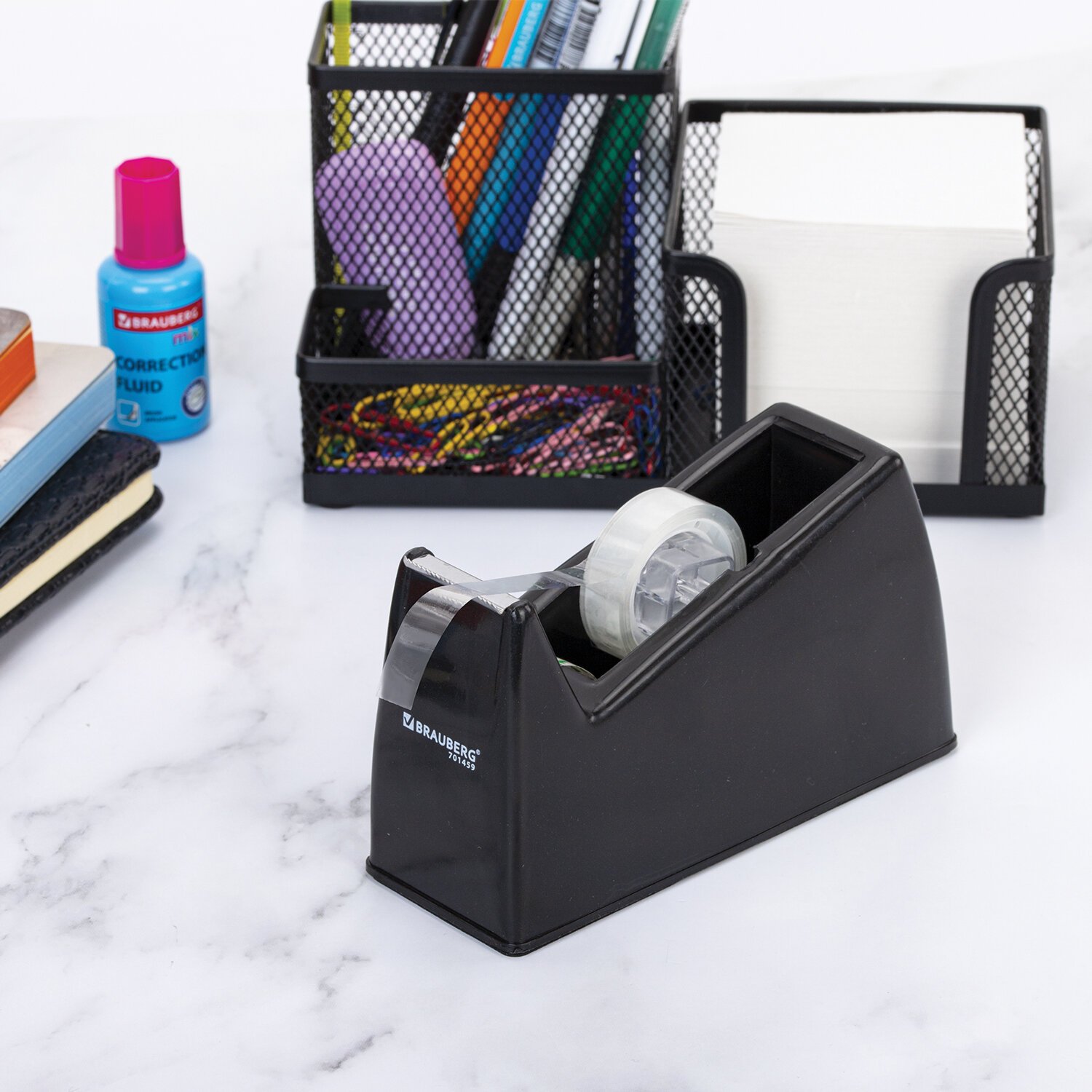 Диспенсер BRAUBERG предназначен для облегчения использования клейкой ленты, предоставляет легкий доступ к скотчу, упрощает процесс упаковки и ремонта предметов, незаменим при большом объеме работ.