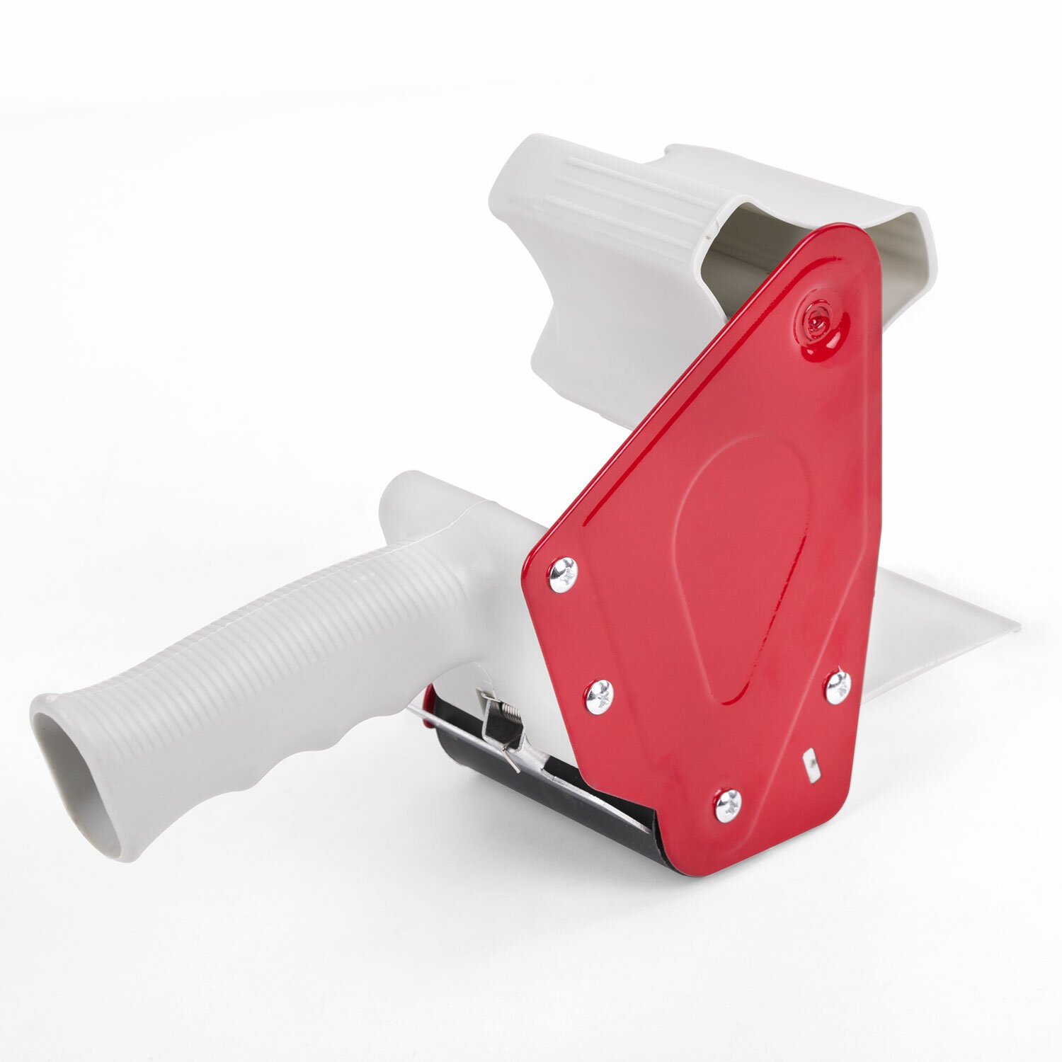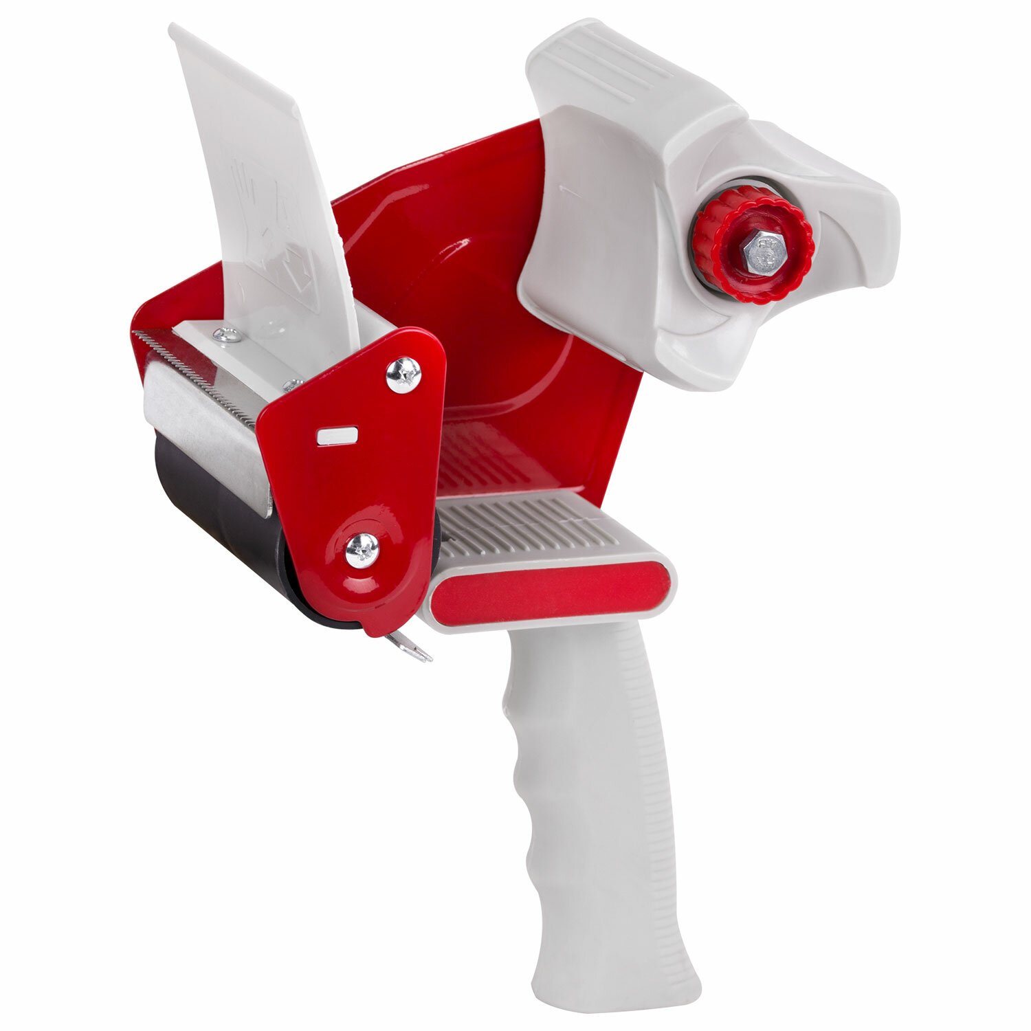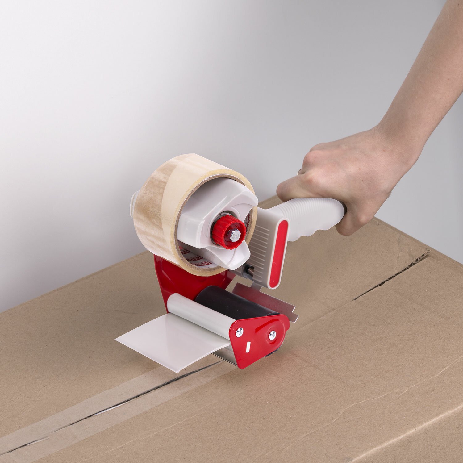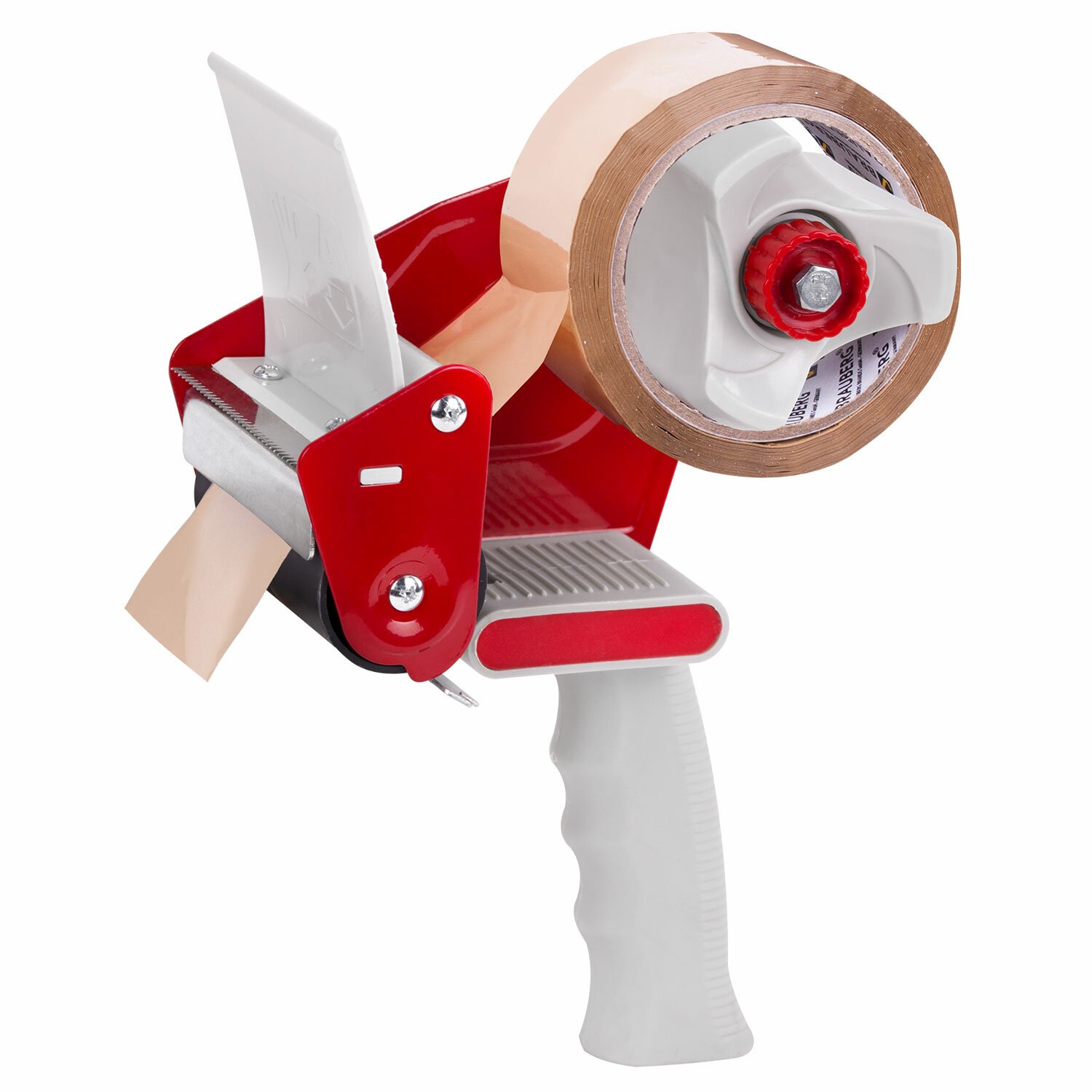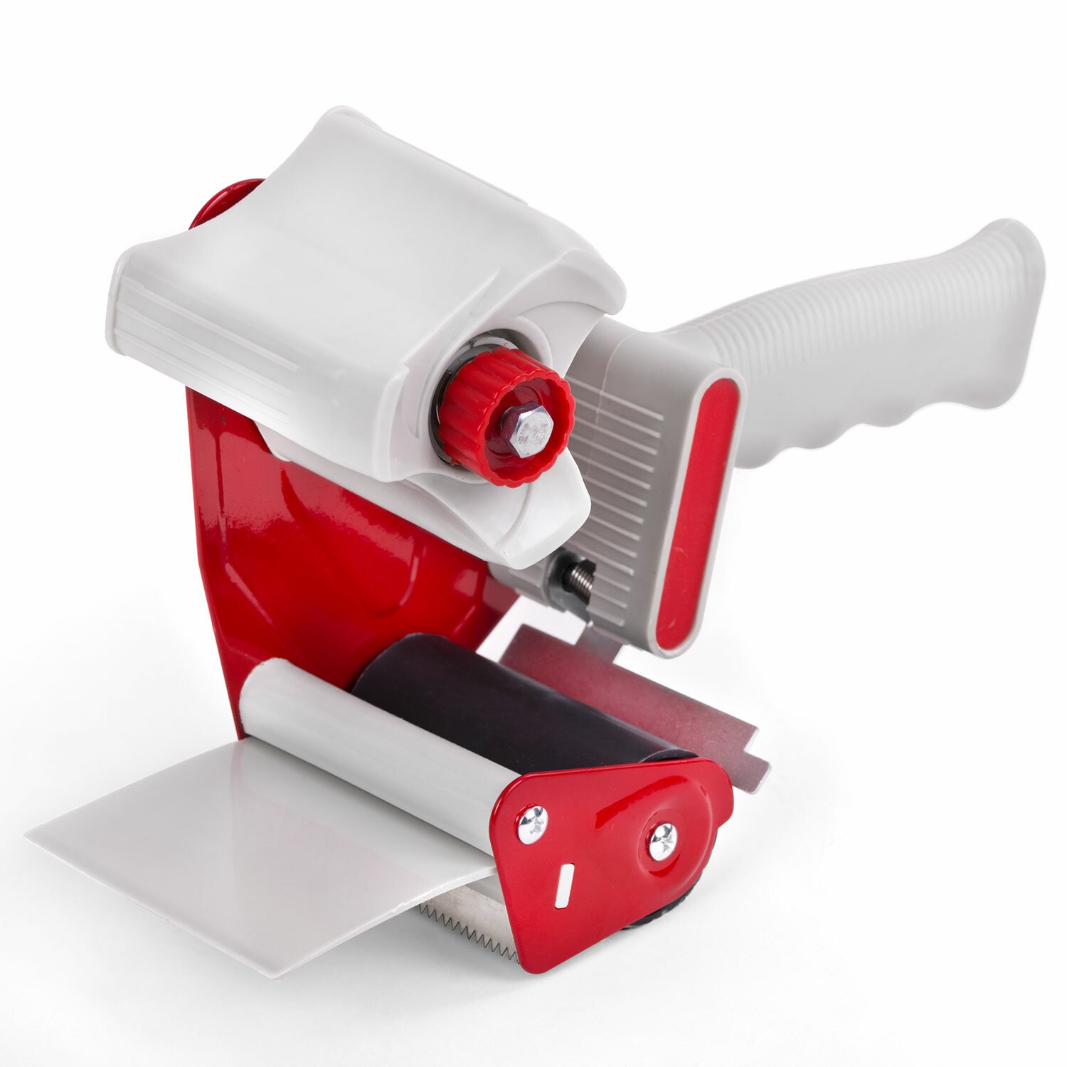 Встроенный нож позволяет легко отрезать ленту. Диспенсер снабжен эргономичной пластиковой ручкой светло-серого цвета. Корпус выполнен из металла в красном цвете. Упаковочная клейкая лента в комплект не входит.