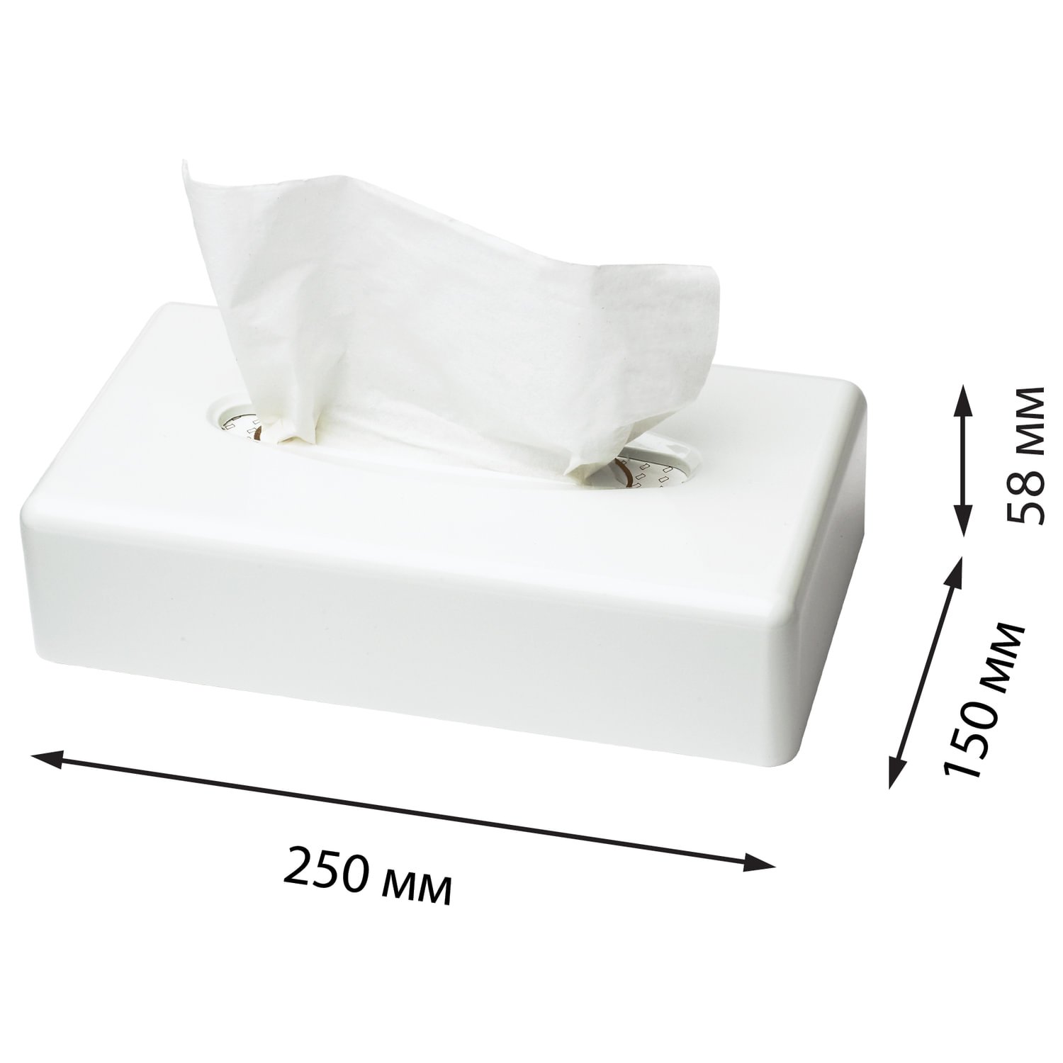 Диспенсер для косметических салфеток вмещает 1 упаковку салфеток TORK. Закрывается без замка и ключа, есть возможность крепления на стену с помощью винтов или двусторонней липкой ленты.