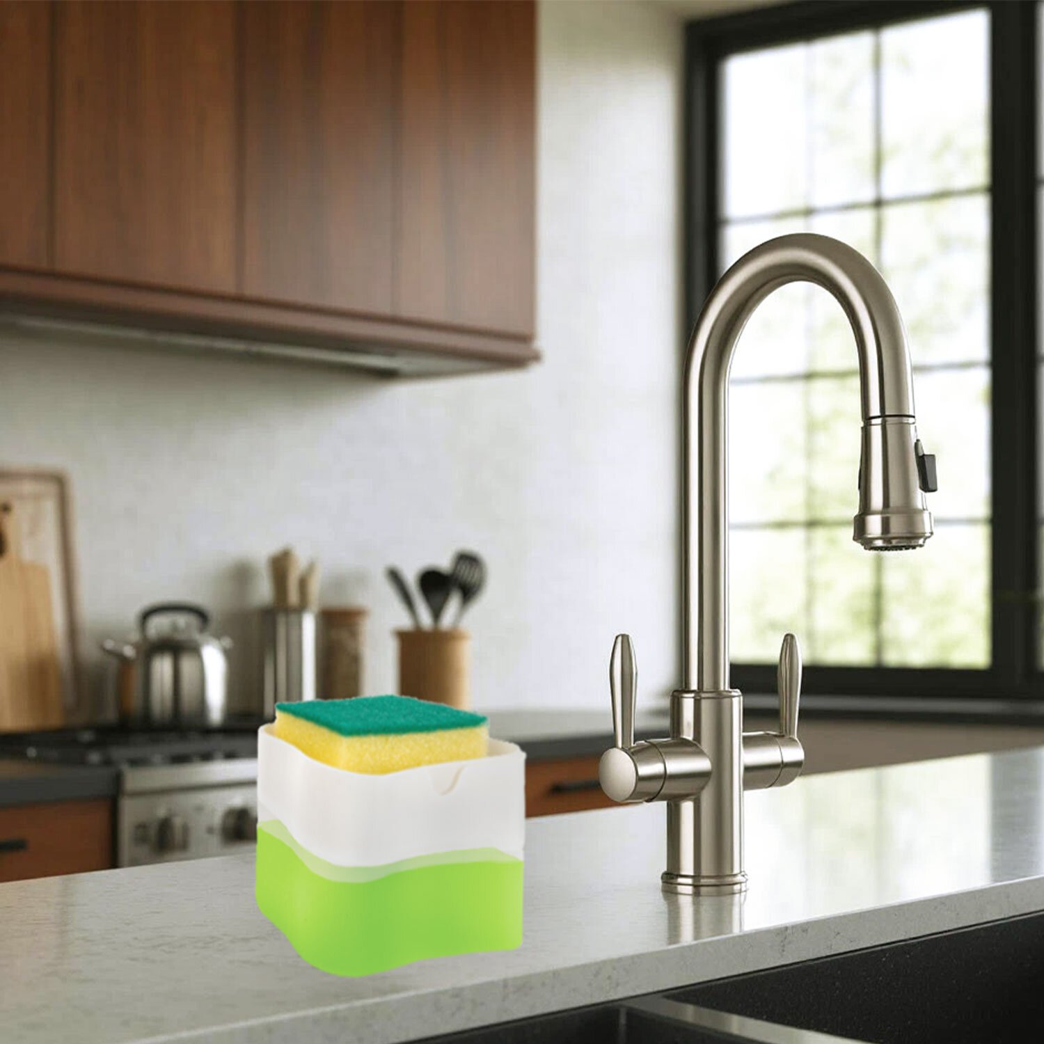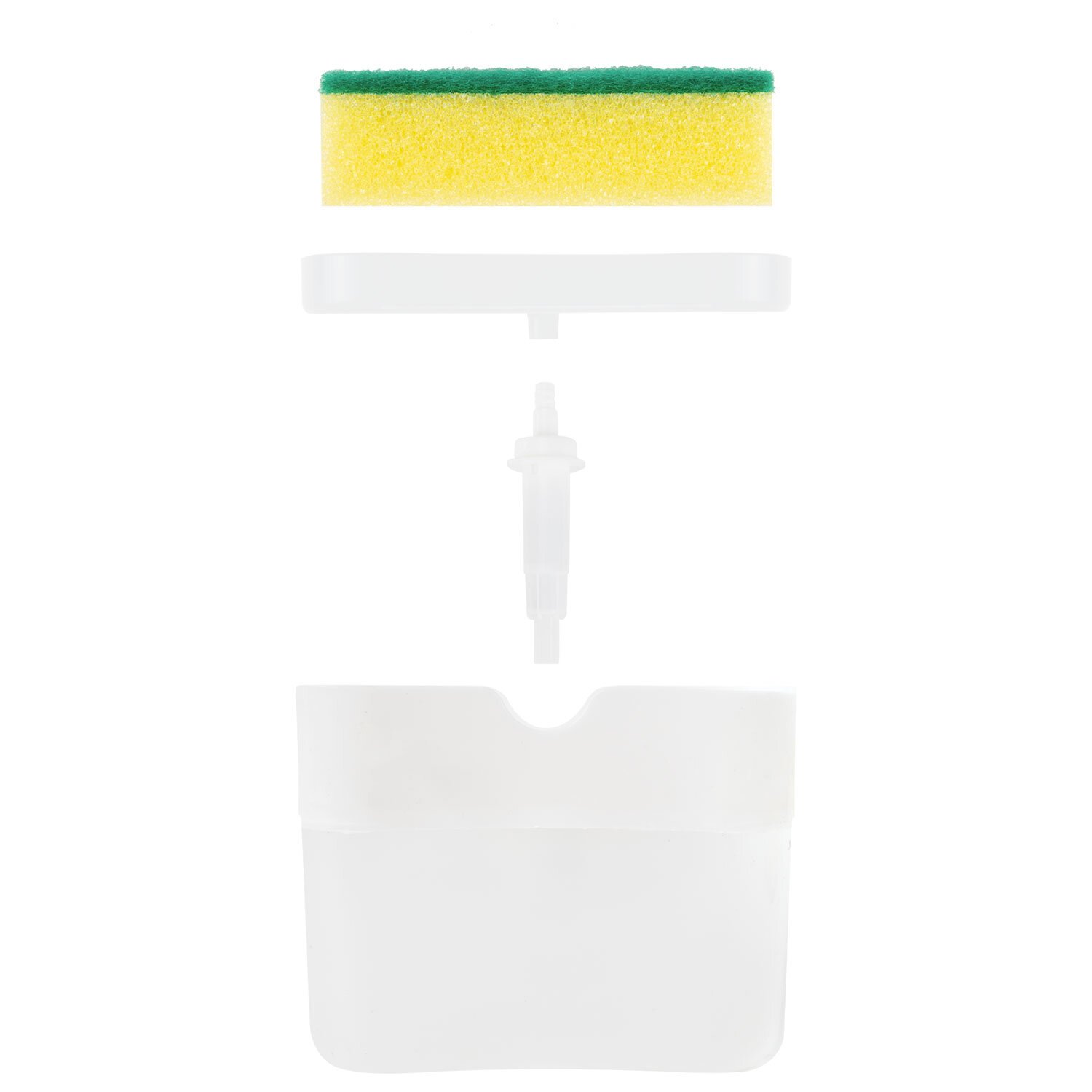 Диспенсер выполнен из прочного полипропилена. Размеры изделия 7х14х11см. Вместимость контейнера для моющего средства – 380мл. Моющее средство подается при нажатии на лоток для губки. В комплекте с диспенсером идет полиуретановая губка.