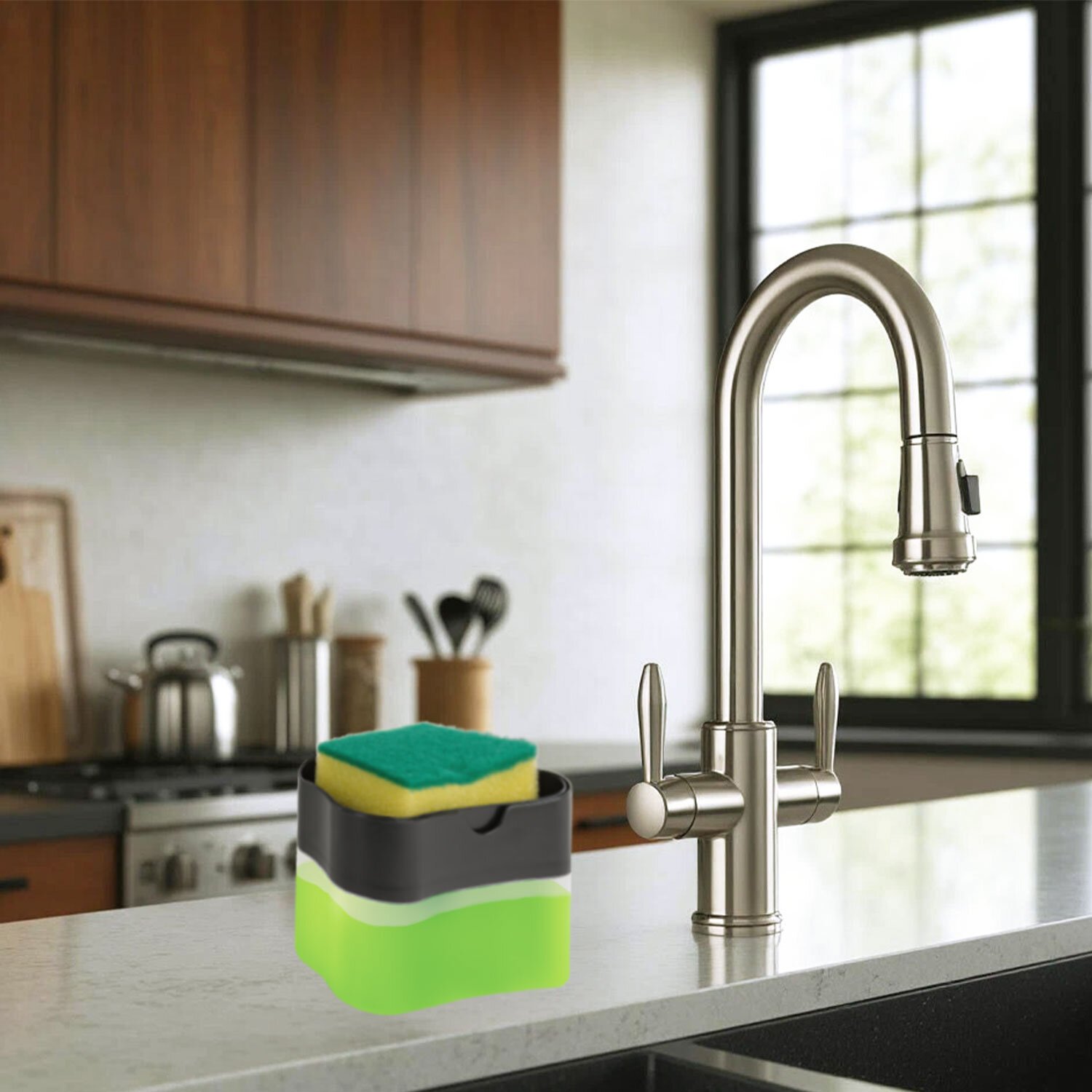Диспенсер выполнен из прочного полипропилена. Размеры изделия 7х14х11см. Вместимость контейнера для моющего средства – 380мл. Моющее средство подается при нажатии на лоток для губки. В комплекте с диспенсером идет полиуретановая губка.