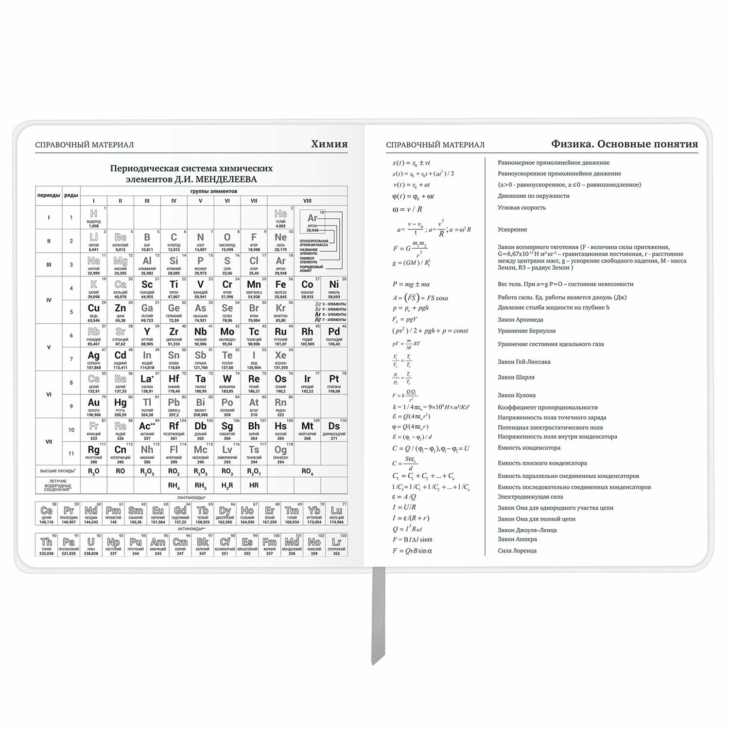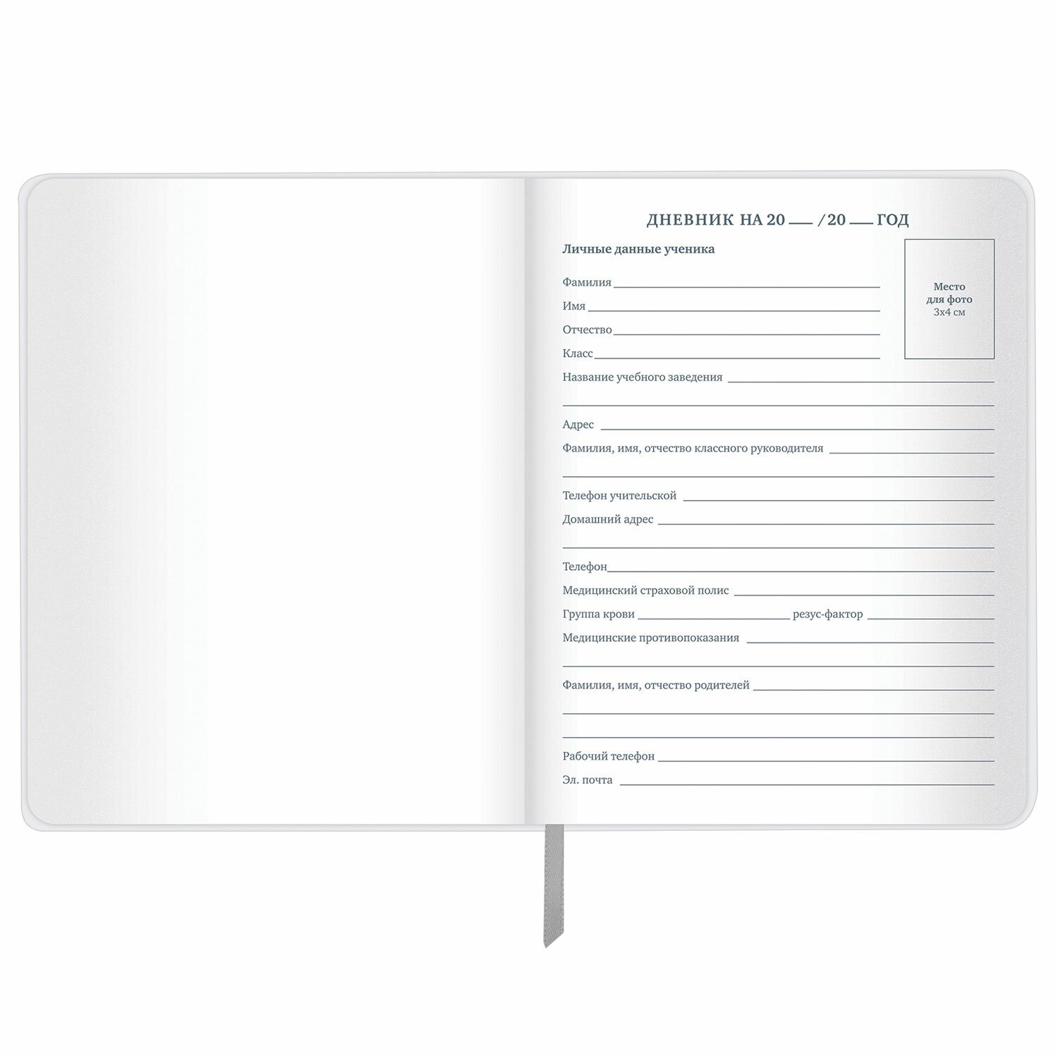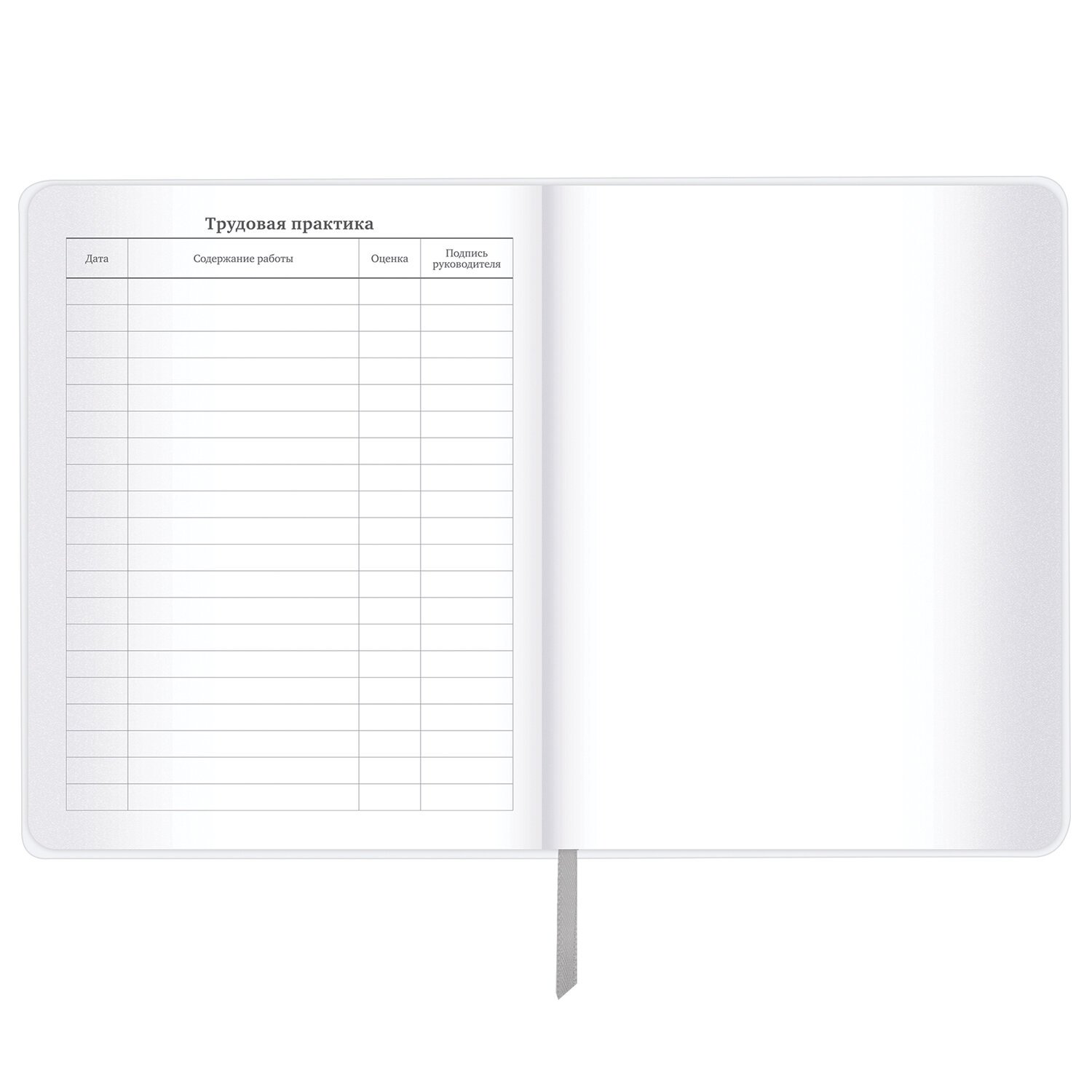 Внутренний блок содержит 48 листов и состоит из офсетной белой бумаги повышенной плотности 70 г/м2. Для удобства использования дневник снабжен закладкой-ляссе.