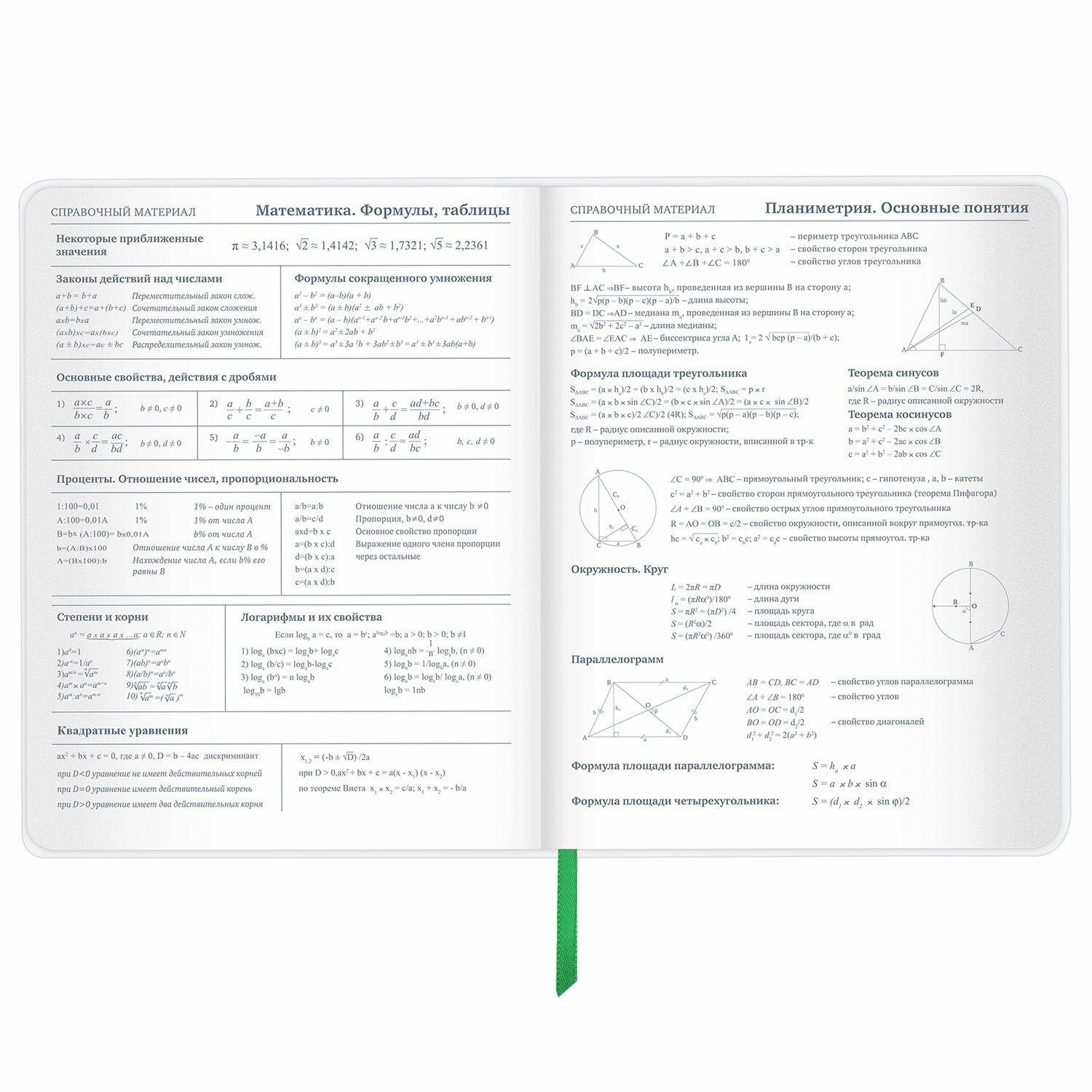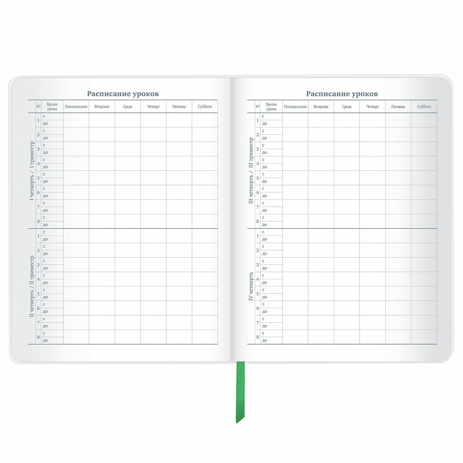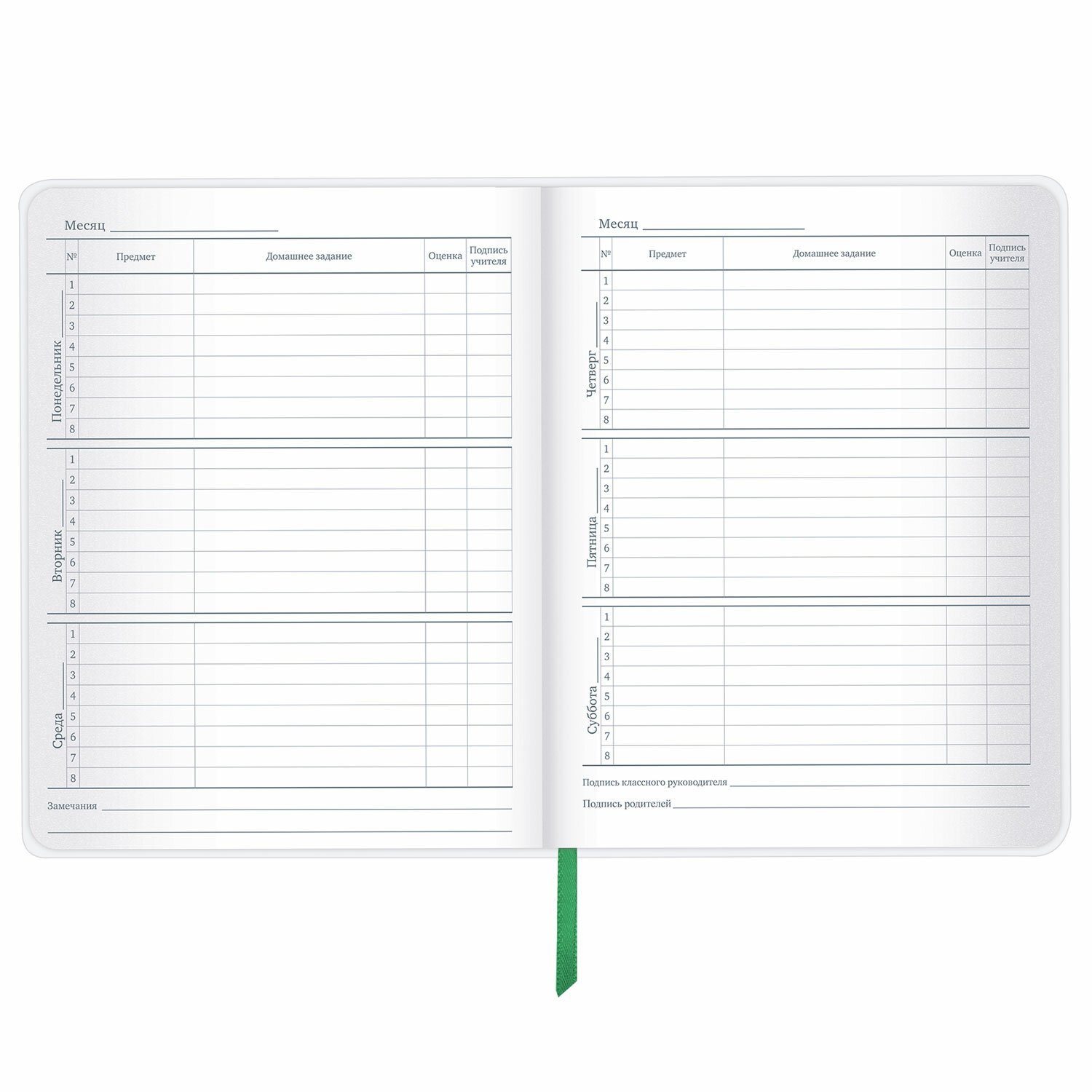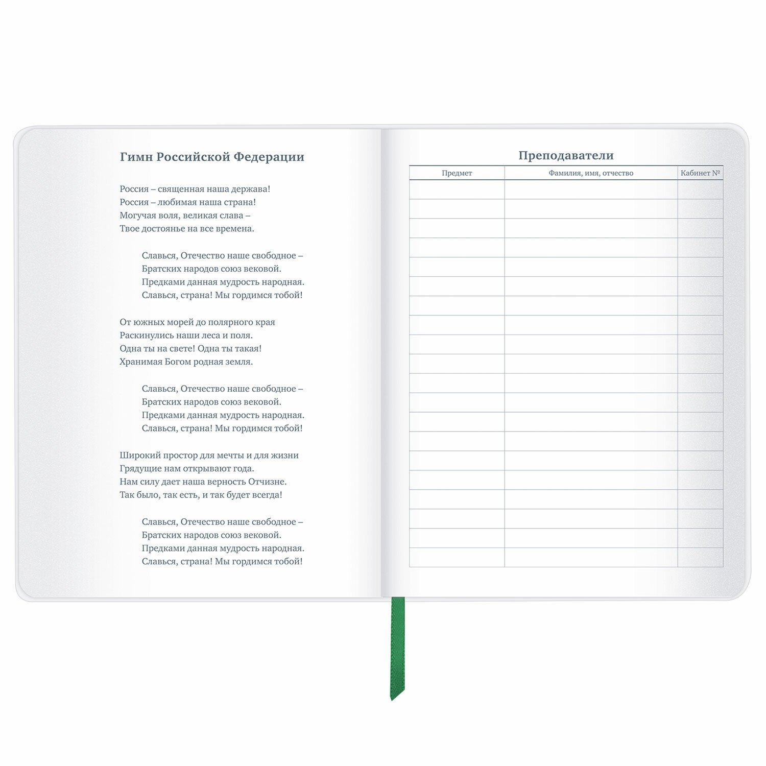 Предназначен для учащихся 1-11 классов. Интегральная обложка из экокожи надежно защищает бумагу и долго сохраняет привлекательный внешний вид, а тиснение фольгой придает изделию оригинальность. Внутренний блок содержит 48 листов и состоит из офсетной белой бумаги повышенной плотности 70 г/м2. В справочном материале собраны основные подсказки для учащихся. Для удобства пользования дневник снабжен закладкой-ляссе.