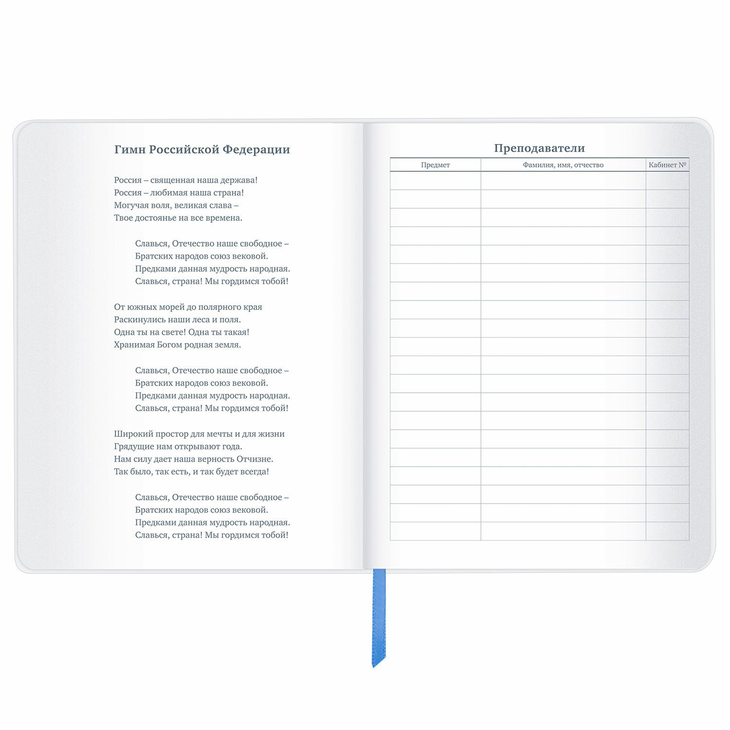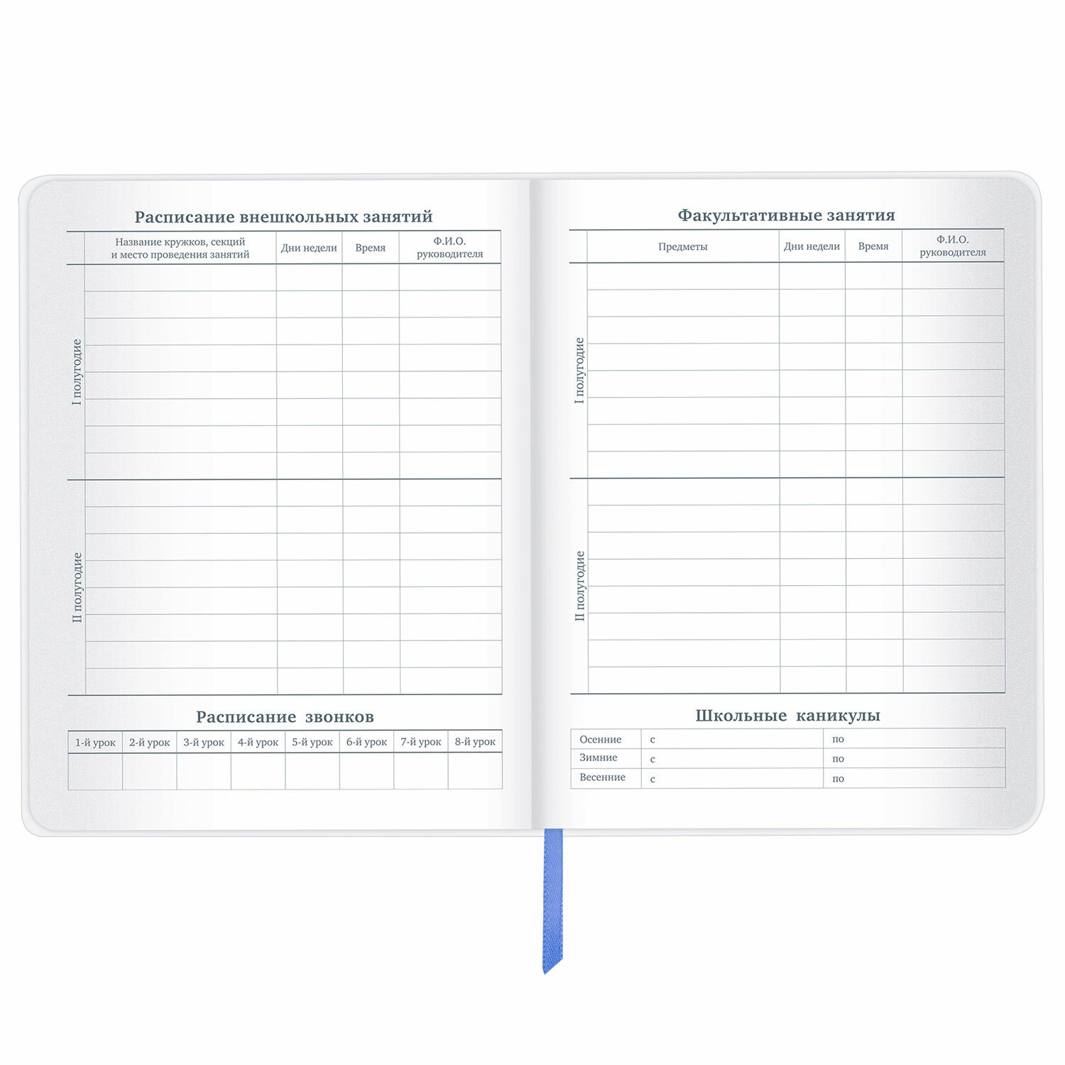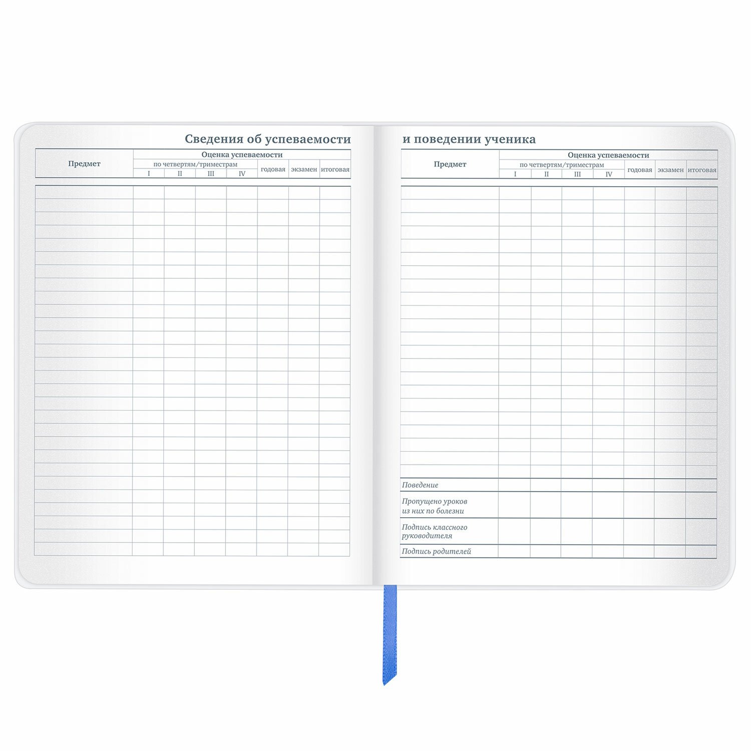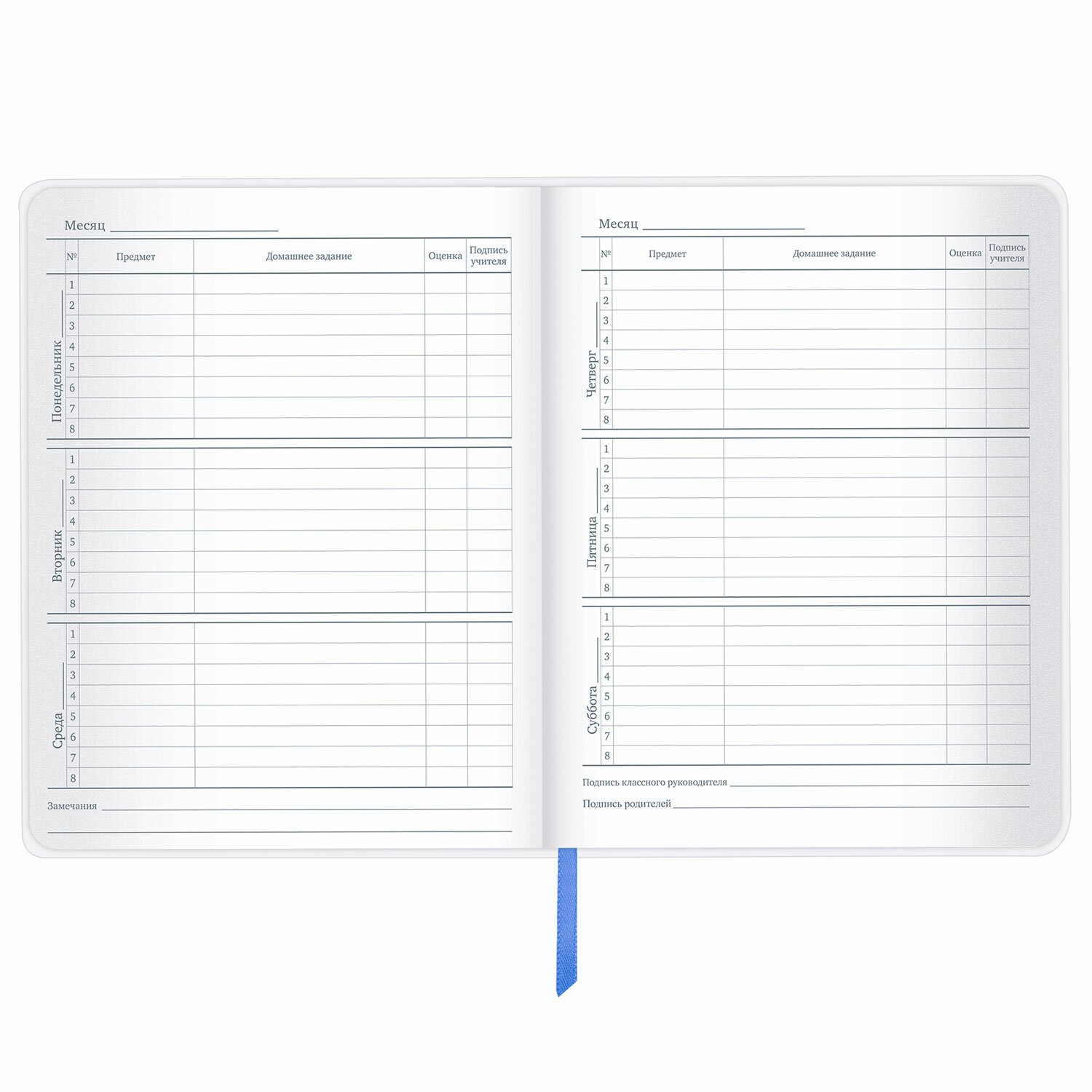 Предназначен для учащихся 1-11 классов. Интегральная обложка из экокожи надежно защищает бумагу и долго сохраняет привлекательный внешний вид, а тиснение фольгой придает изделию оригинальность. Внутренний блок содержит 48 листов и состоит из офсетной белой бумаги повышенной плотности 70 г/м2. В справочном материале собраны основные подсказки для учащихся. Для удобства пользования дневник снабжен закладкой-ляссе.
