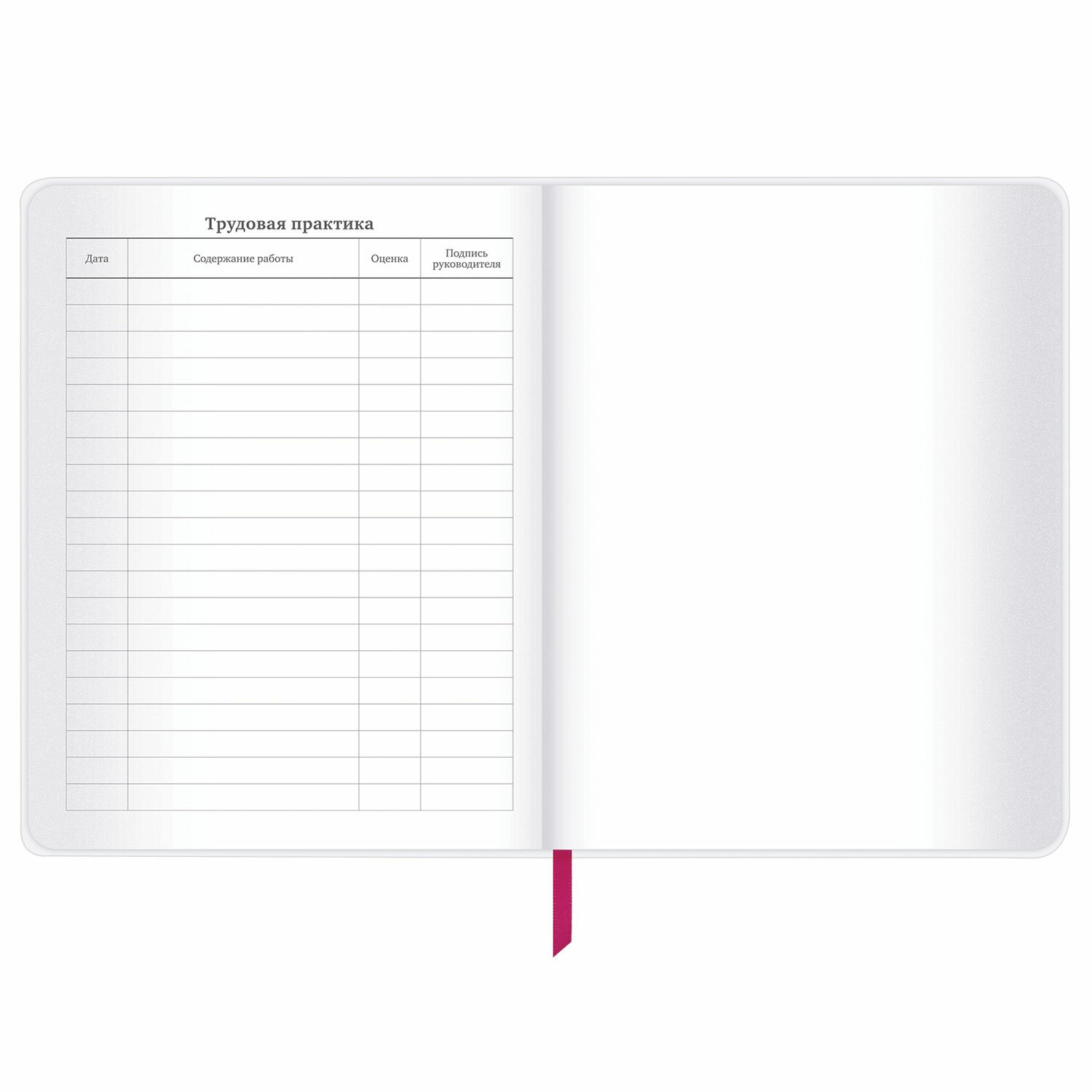 Внутренний блок содержит 48 листов и состоит из офсетной белой бумаги повышенной плотности 70 г/м2. Для удобства использования дневник снабжен закладкой-ляссе.