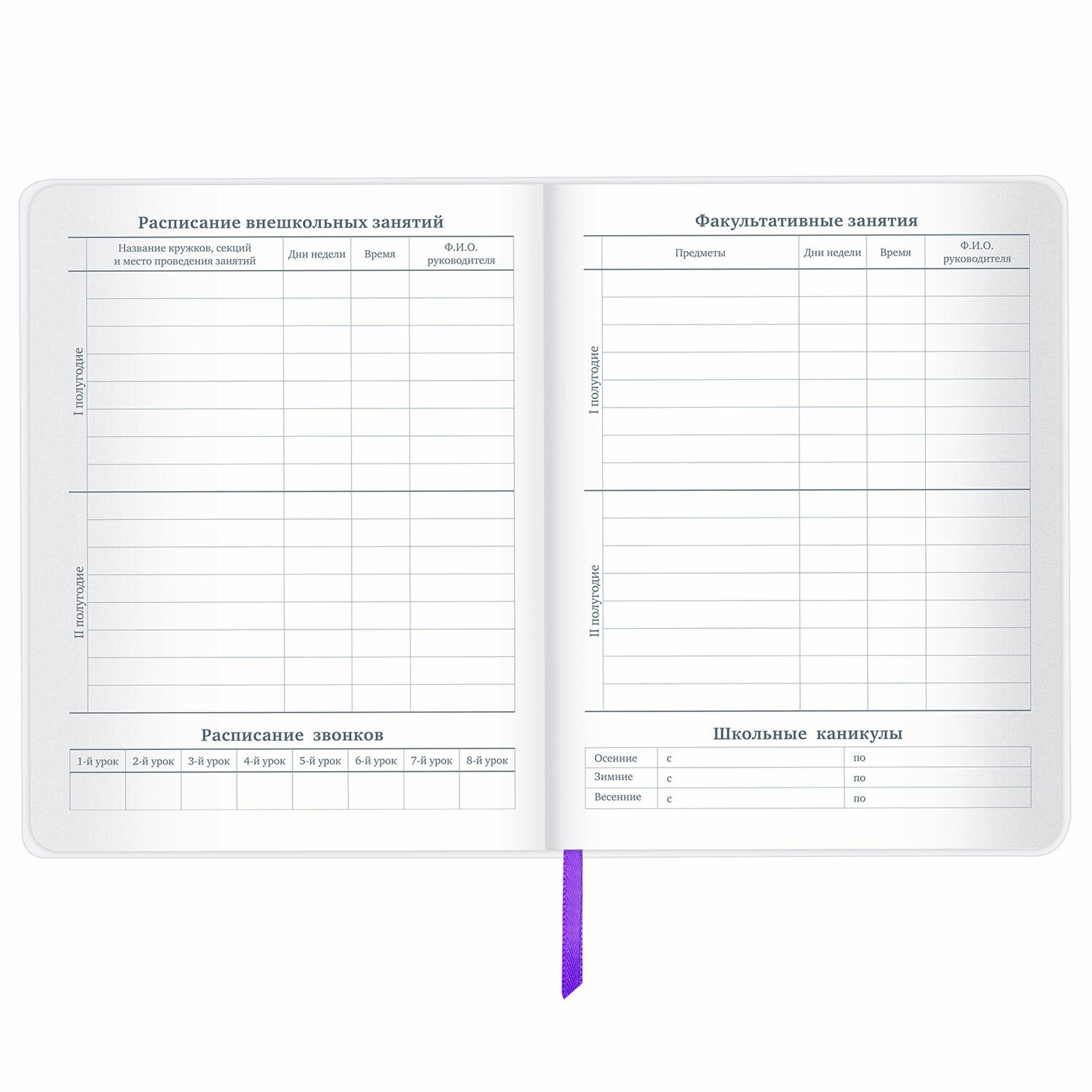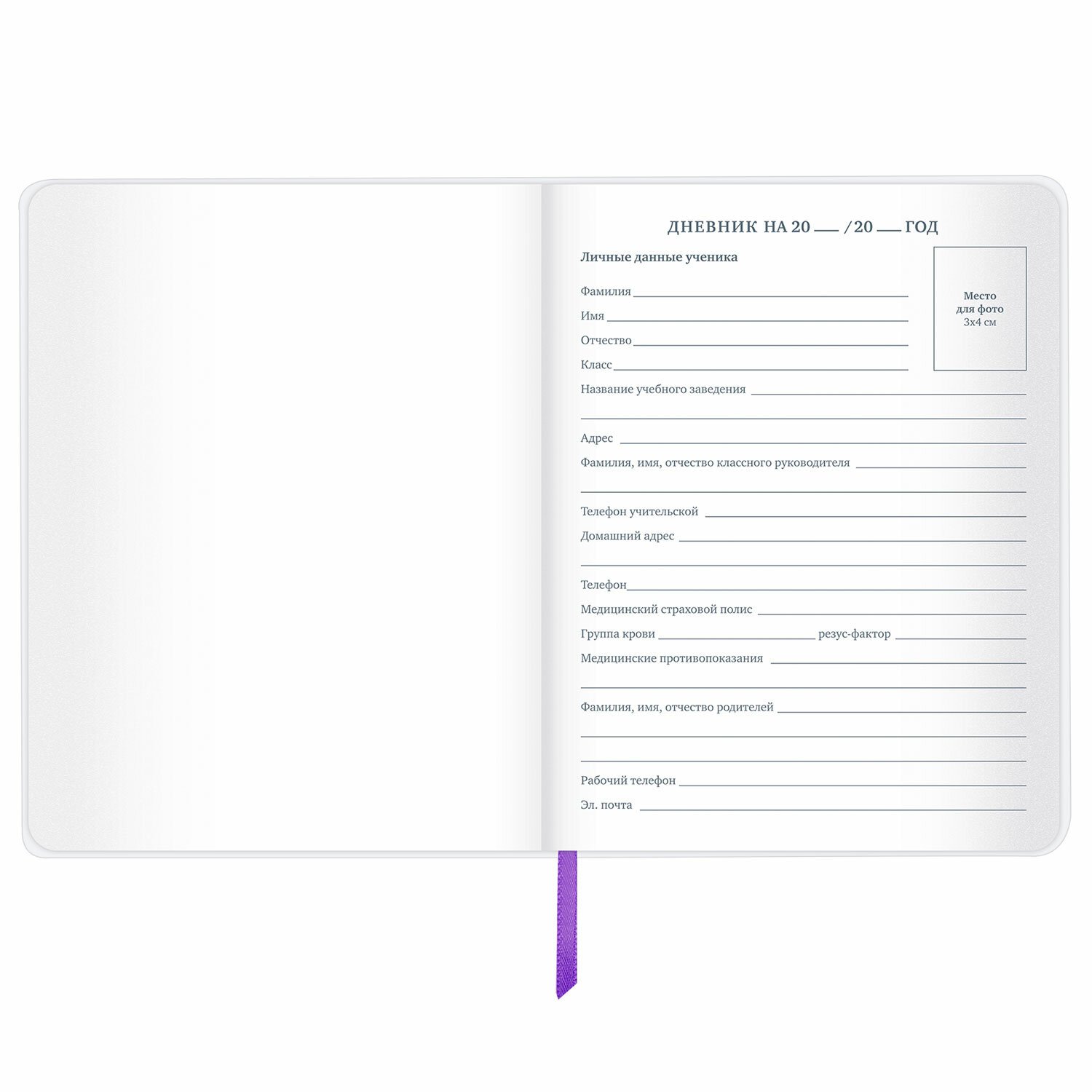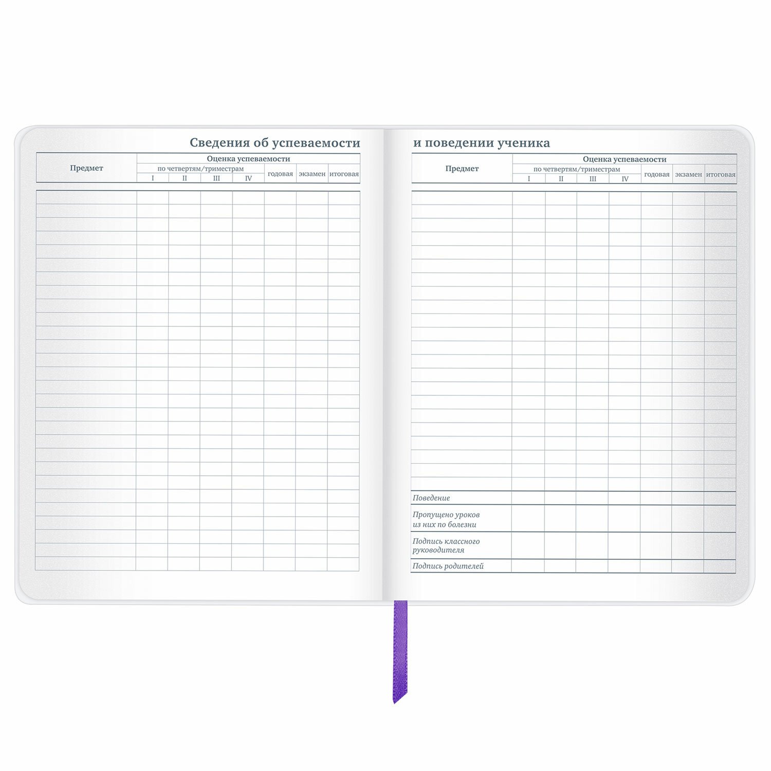 Предназначен для учащихся 1-11 классов. Интегральная обложка из экокожи надежно защищает бумагу и долго сохраняет привлекательный внешний вид, а тиснение фольгой придает изделию оригинальность. Внутренний блок содержит 48 листов и состоит из офсетной белой бумаги повышенной плотности 70 г/м2. В справочном материале собраны основные подсказки для учащихся. Для удобства пользования дневник снабжен закладкой-ляссе.