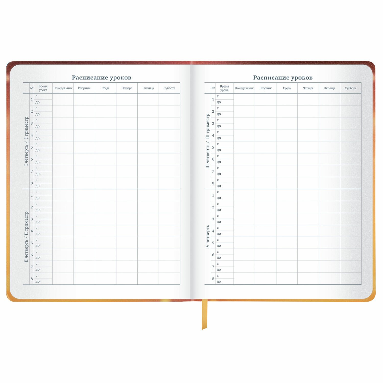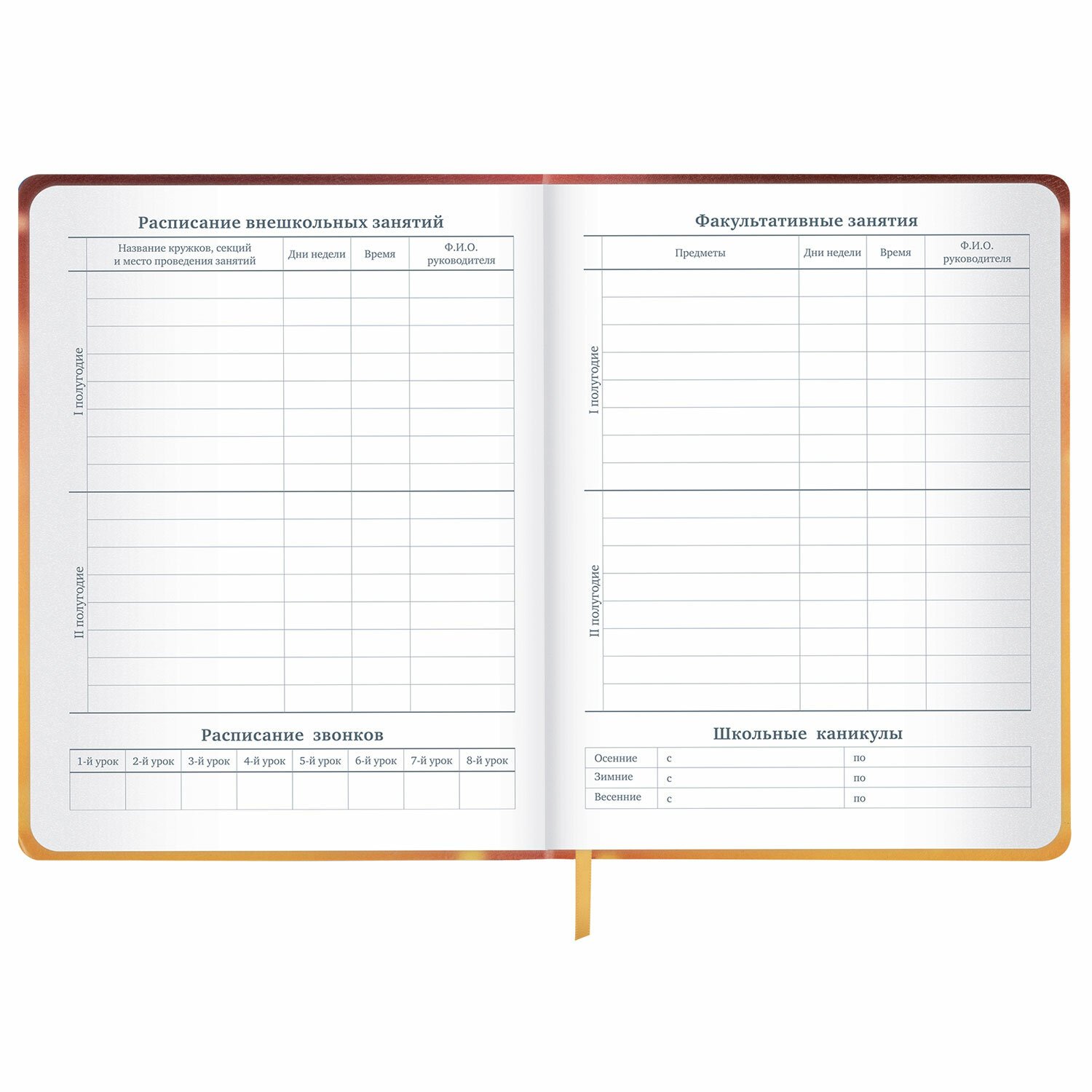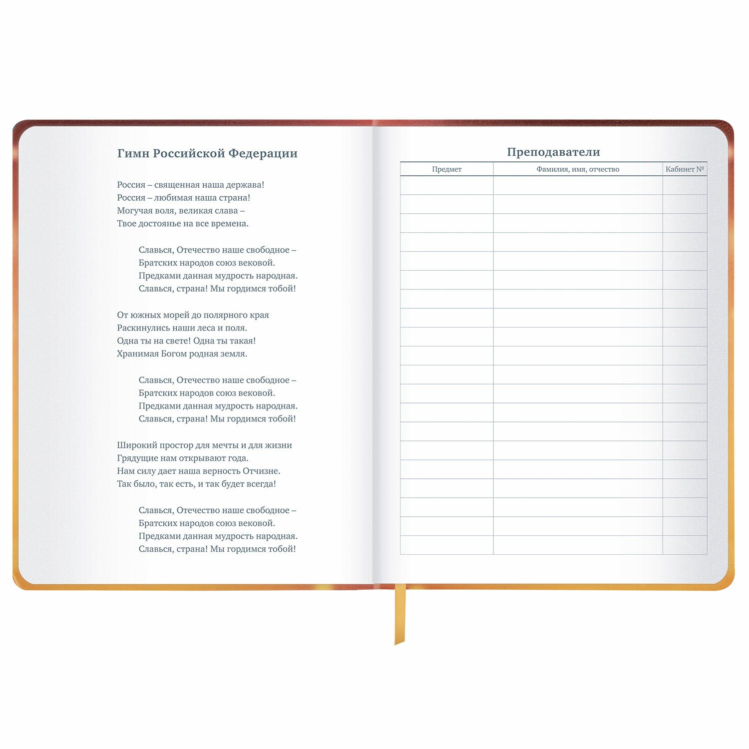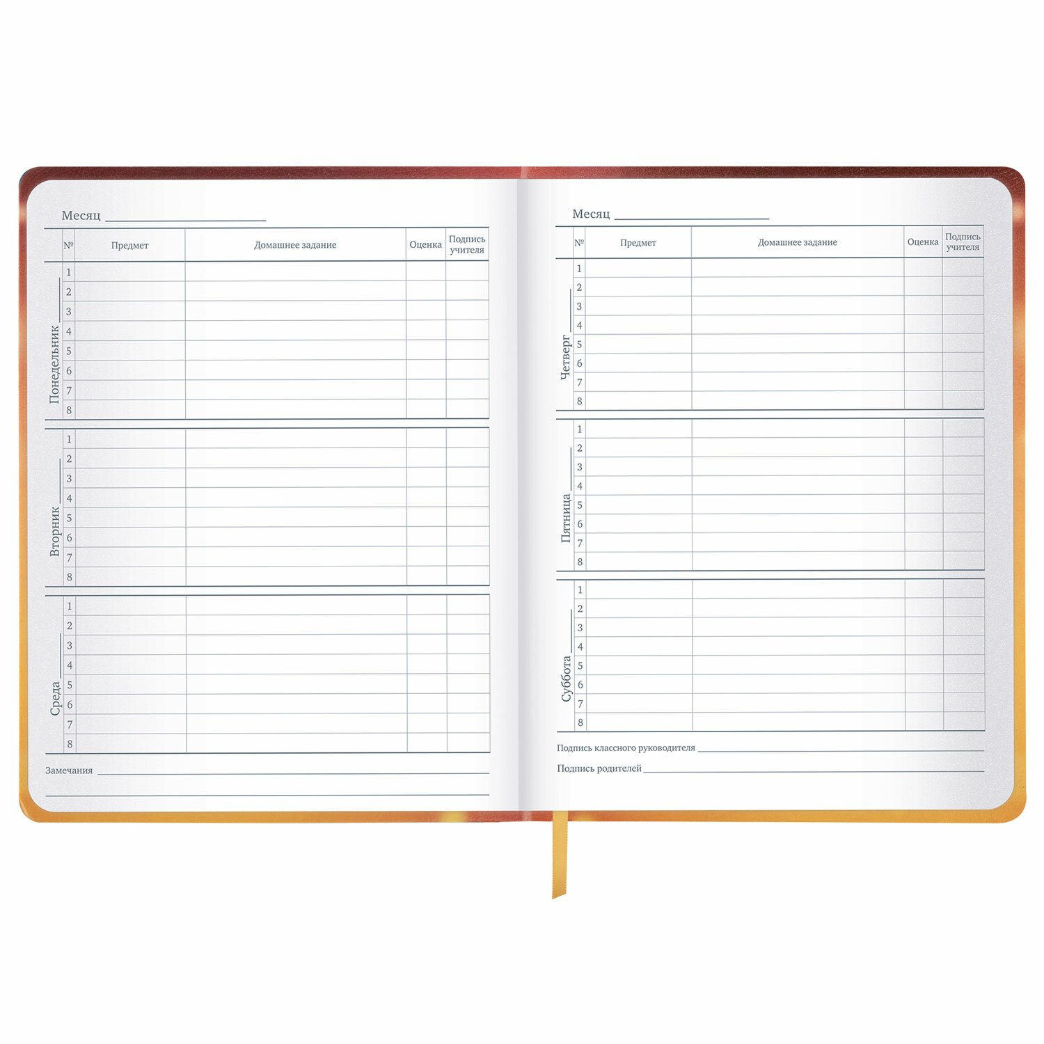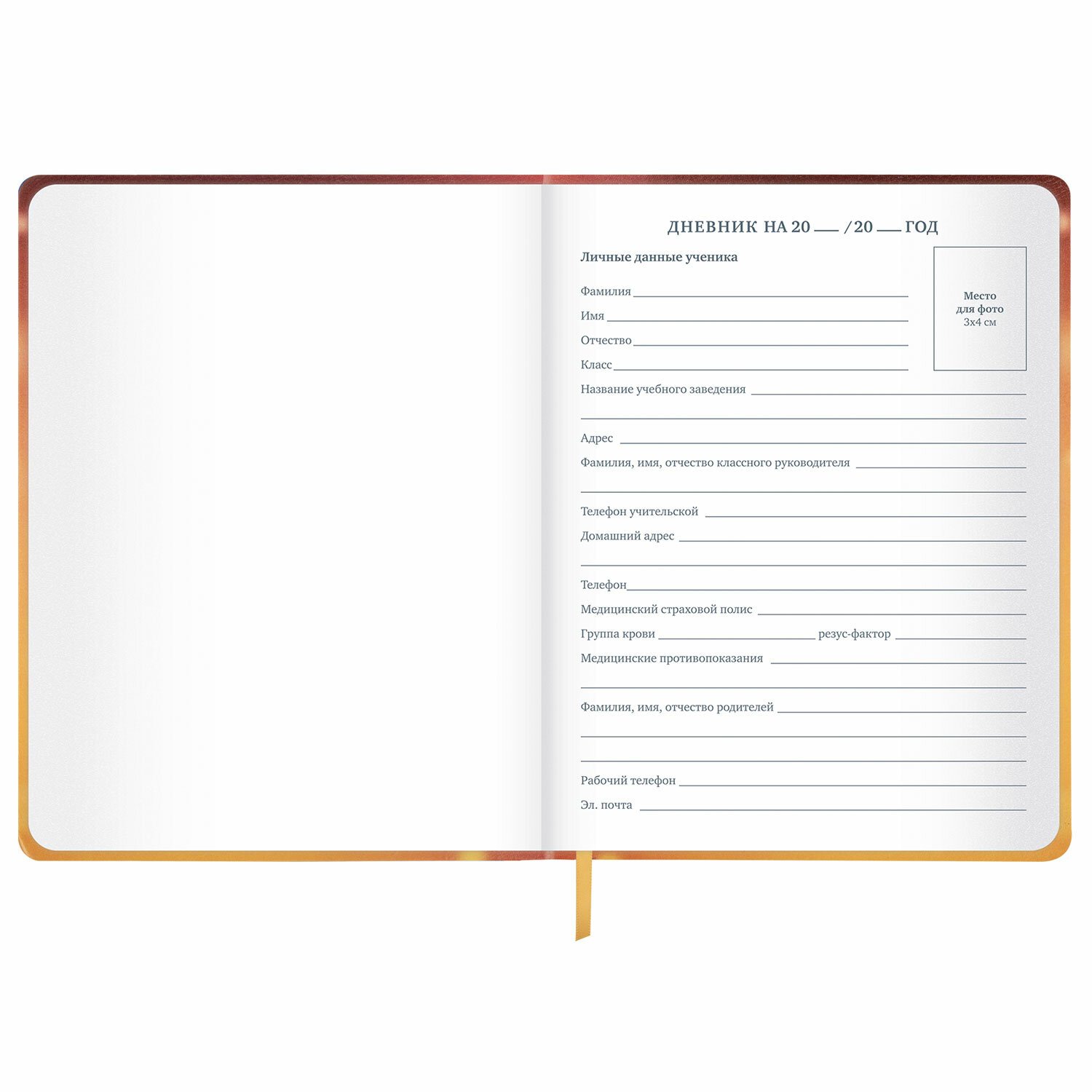 Внутренний блок содержит 48 листов и состоит из офсетной белой бумаги плотностью 70 г/м2. Для удобства использования дневник снабжен закладкой-ляссе.