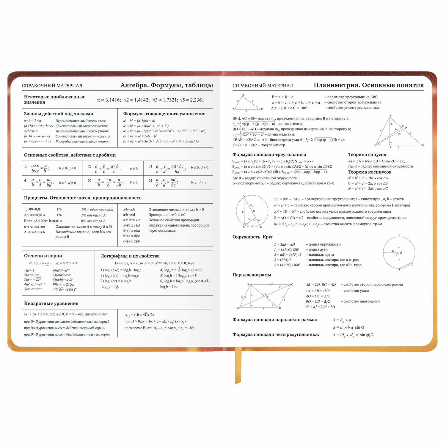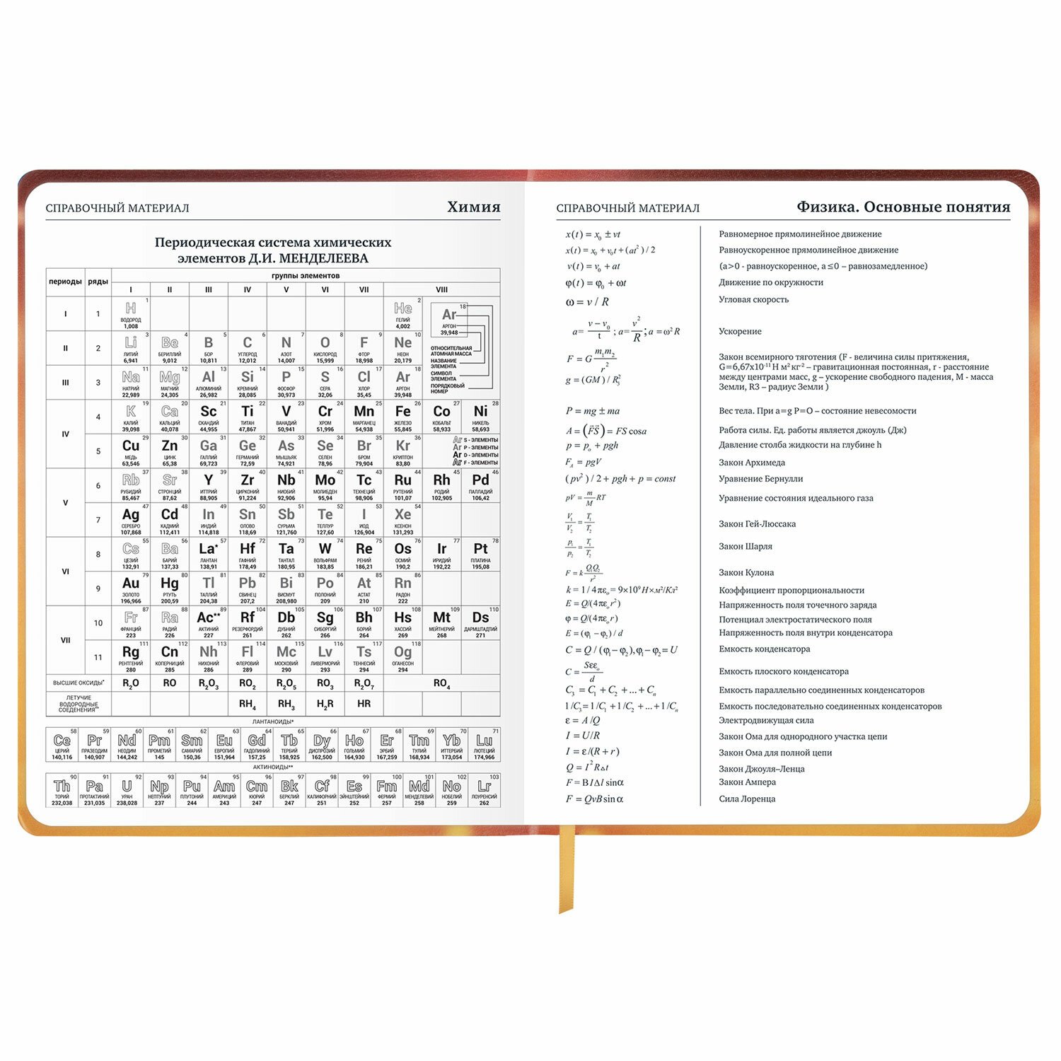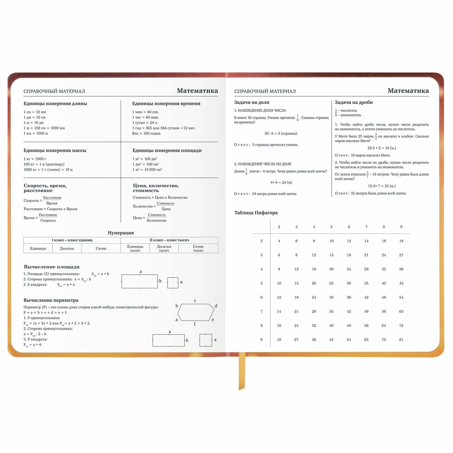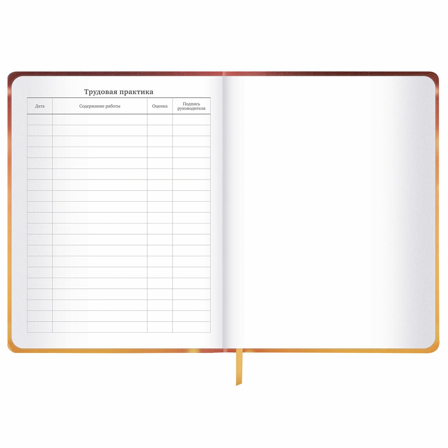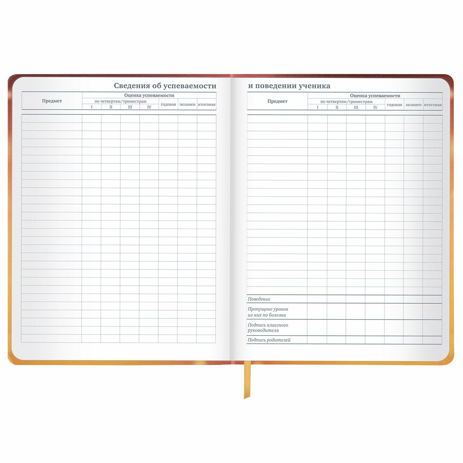 Внутренний блок содержит 48 листов и состоит из офсетной белой бумаги плотностью 70 г/м2. Для удобства использования дневник снабжен закладкой-ляссе.