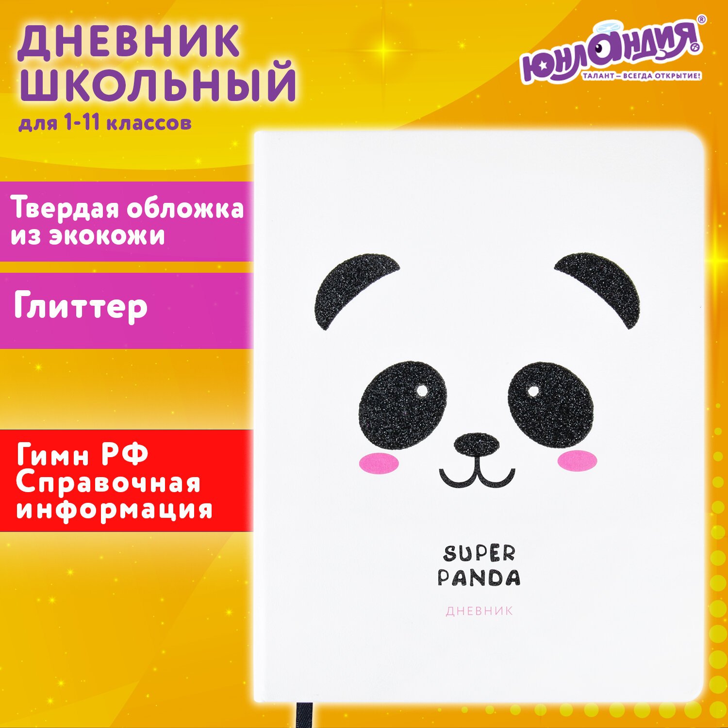 Дневник 1-11 класс 48 л., кожзам (твердая), печать, глиттер, ЮНЛАНДИЯ, "Панда", 106558