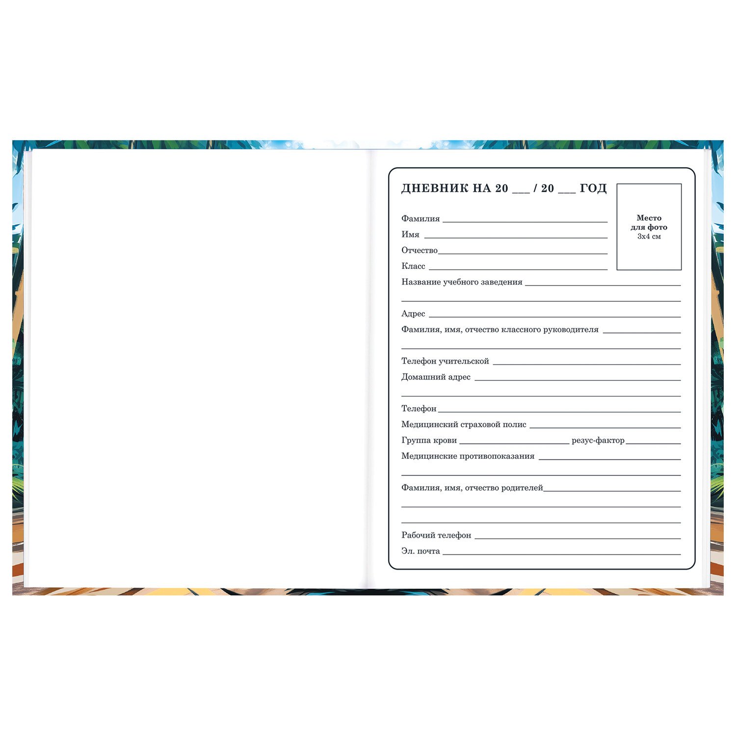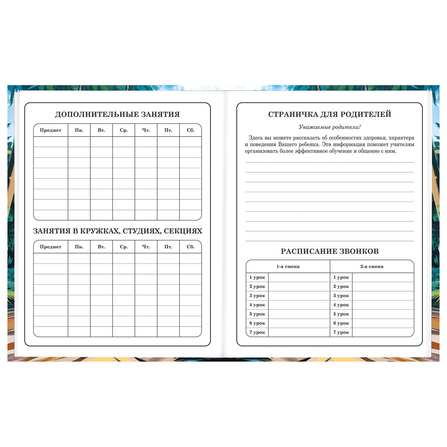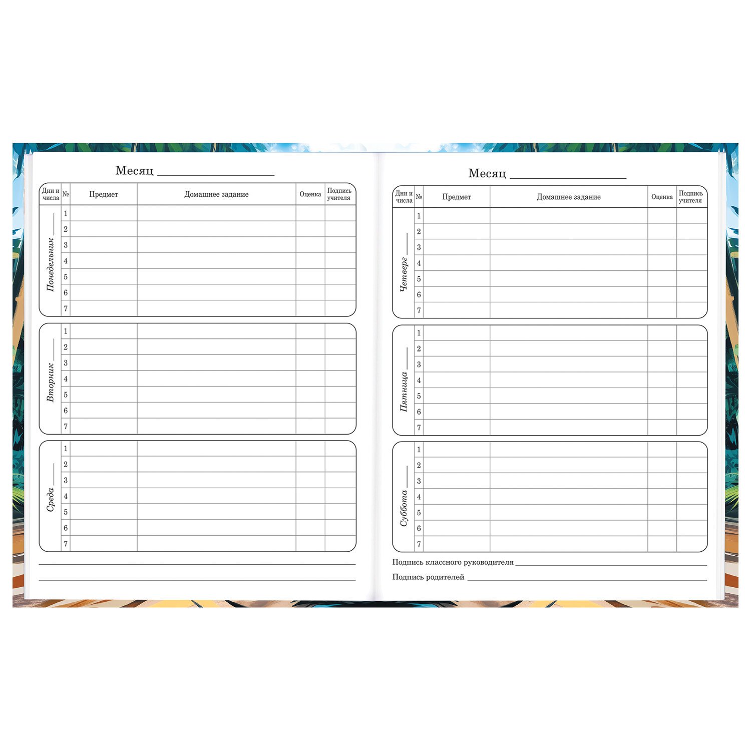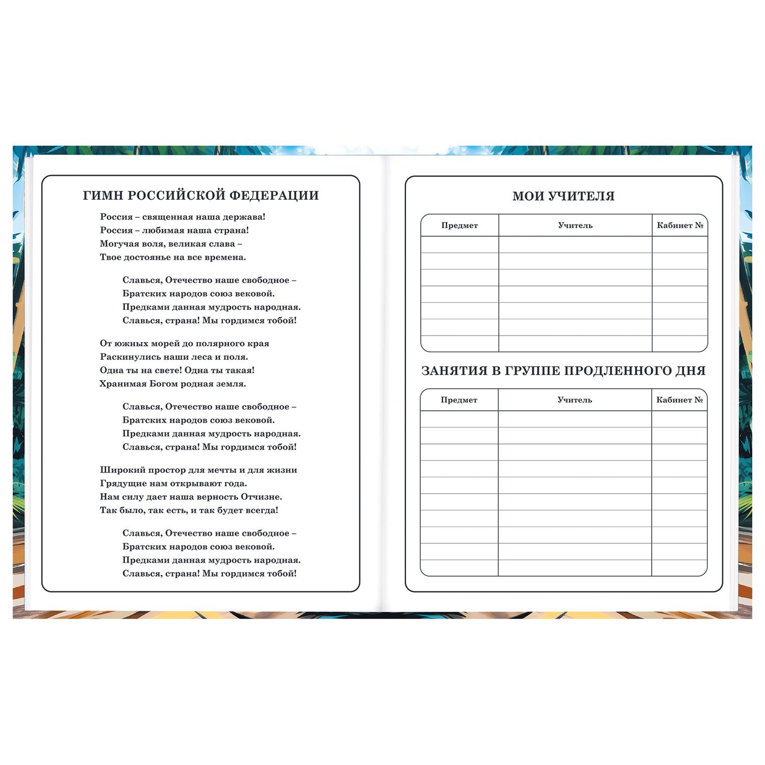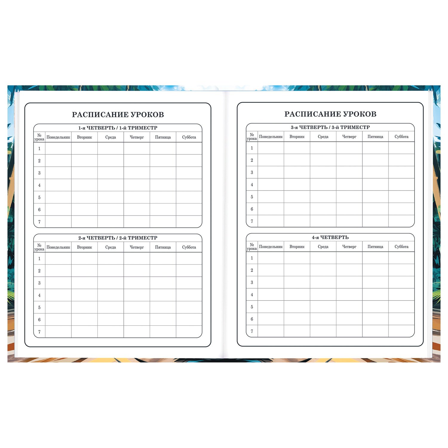 Внутренний блок содержит 48 листов офсетной белой бумаги плотностью 60 г/м2. Дневник снабжен полезным справочным материалом для учащихся.