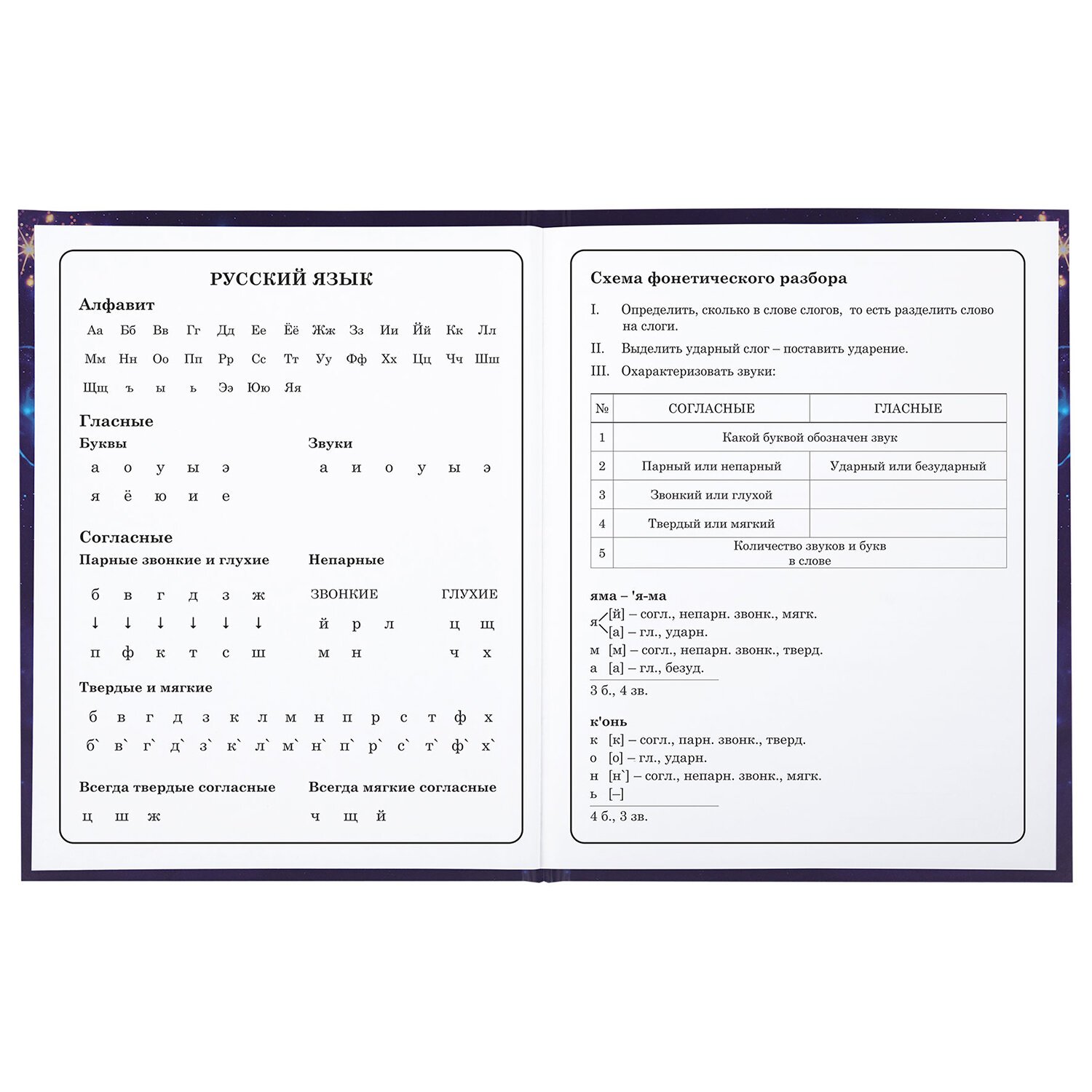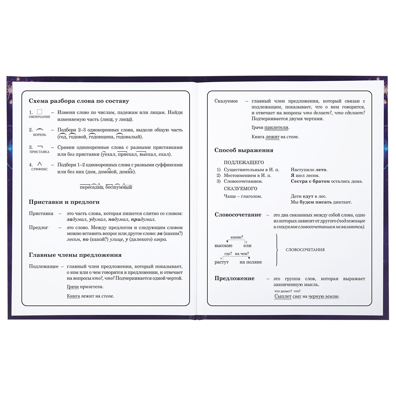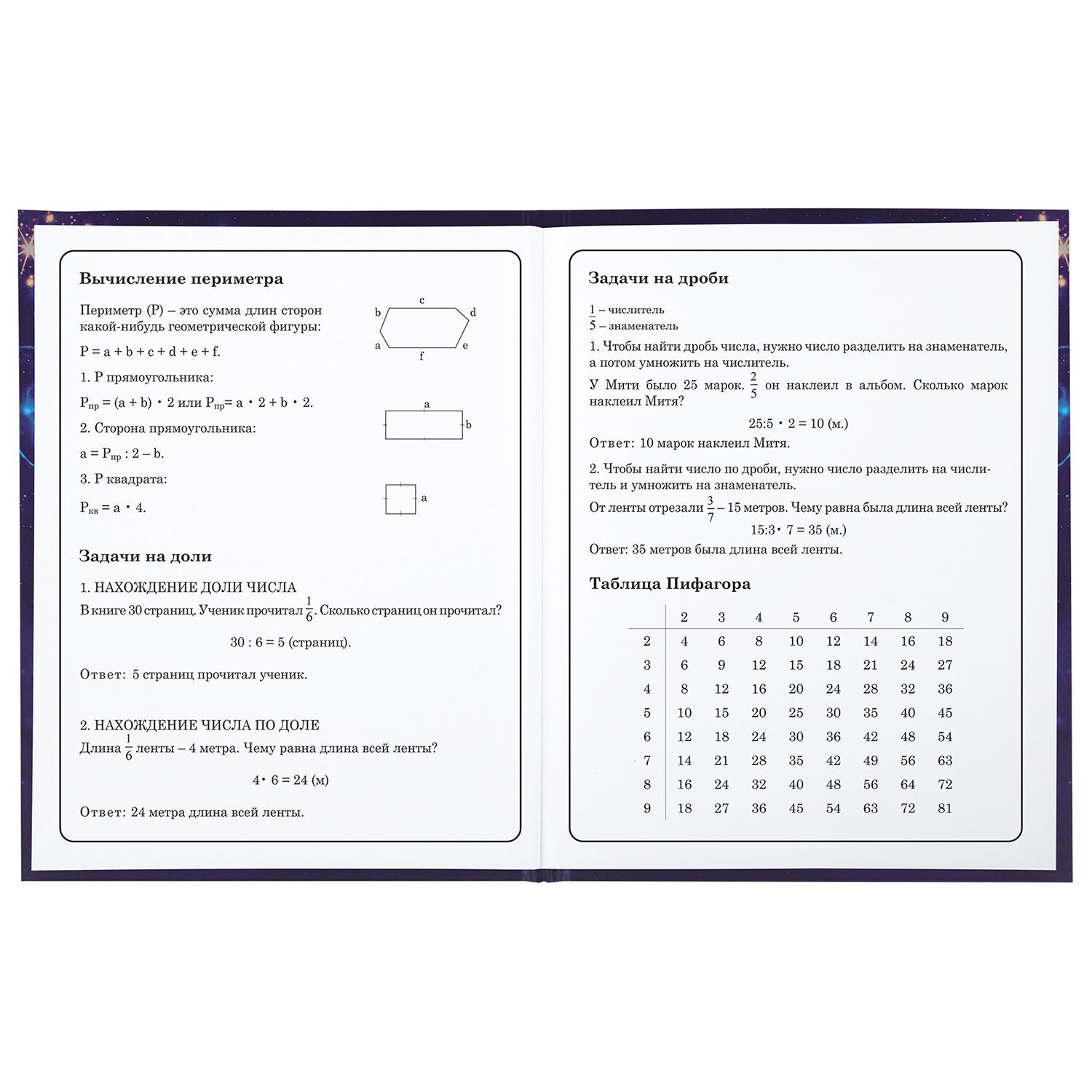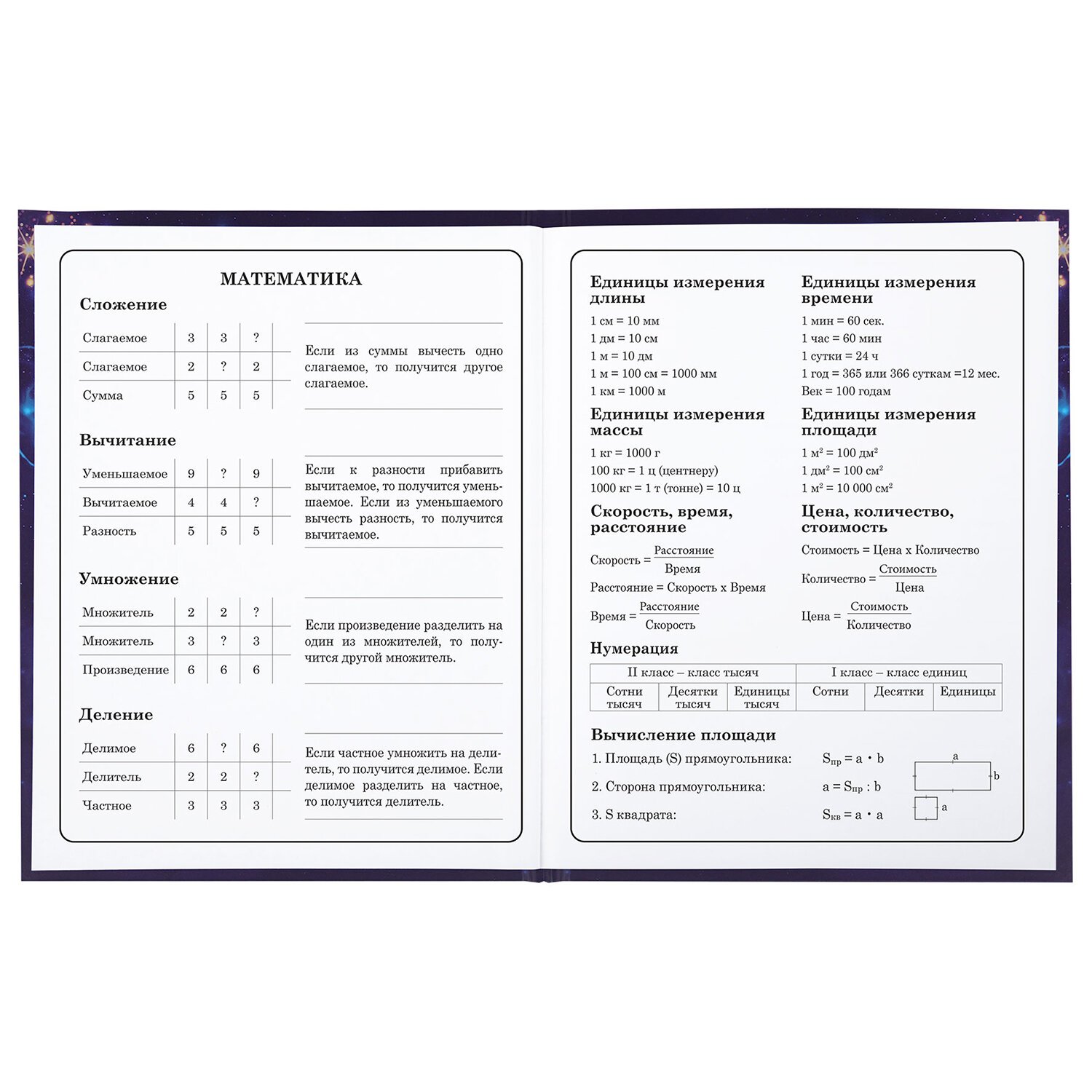 Предназначен для учащихся начальных классов. Твердая обложка надежно защищает бумагу и долго сохраняет привлекательный внешний вид. Спецэффект "матовая ламинация с блестками" придает глубину изображению, не позволяет образовываться бликам на изделии. Внутренний блок содержит 48 листов и состоит из офсетной белой бумаги плотностью 60 г/м2. В справочном материале собраны основные подсказки для учащихся.