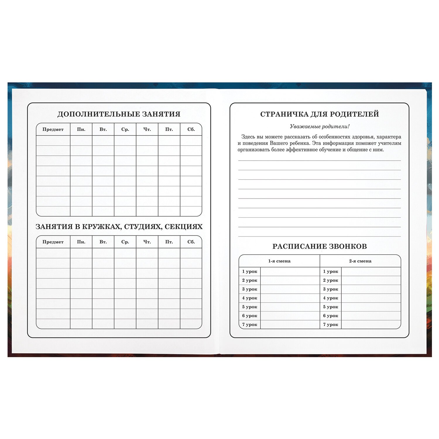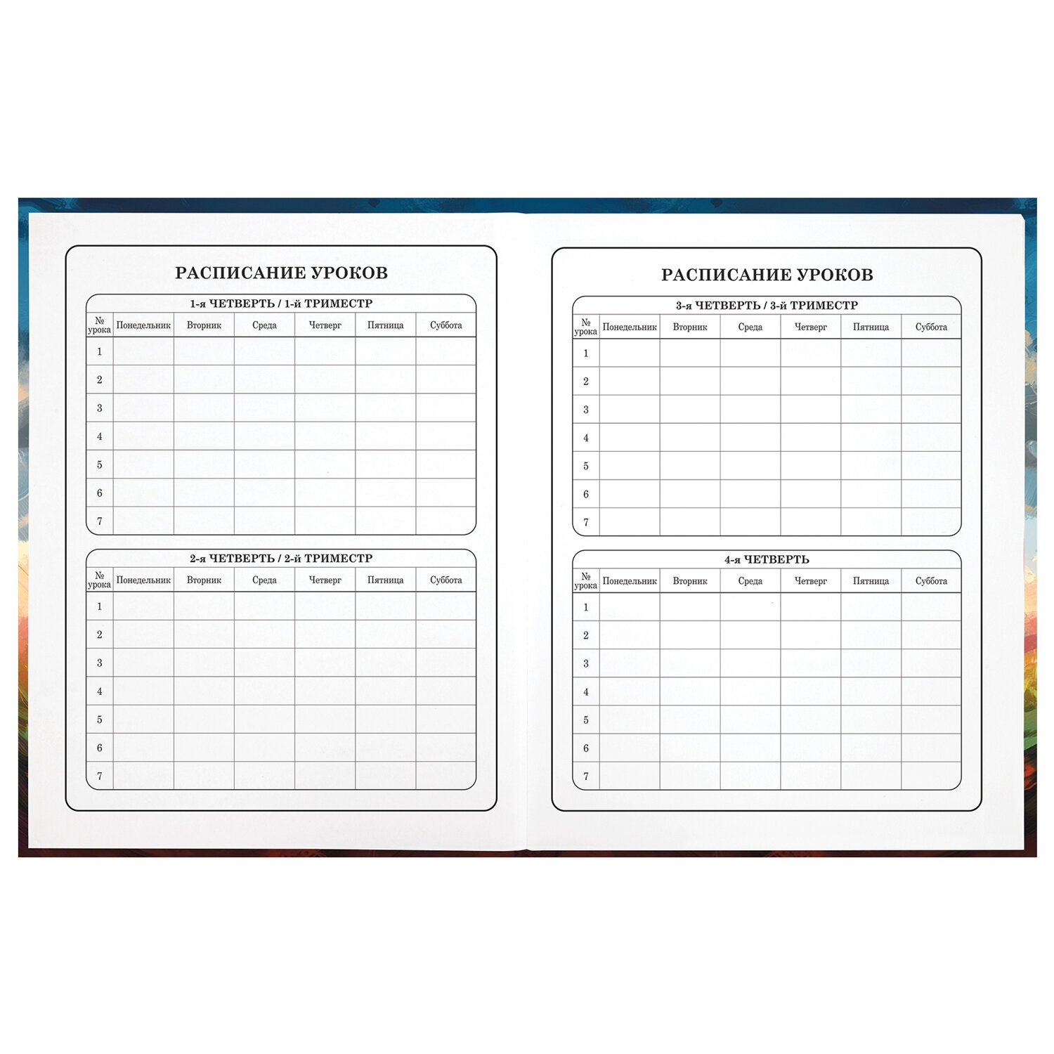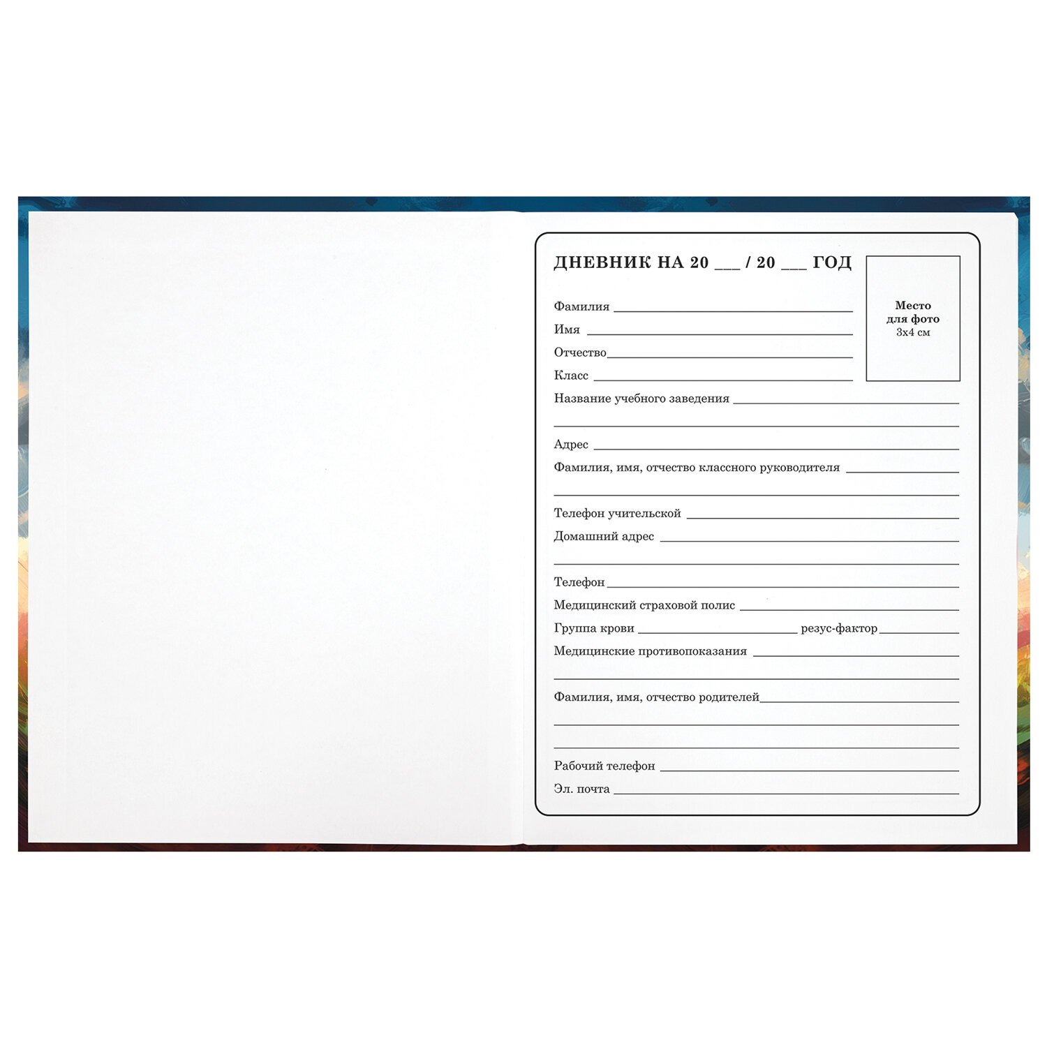 Внутренний блок содержит 48 листов офсетной белой бумаги плотностью 60 г/м2. Дневник снабжен полезным справочным материалом для учащихся.