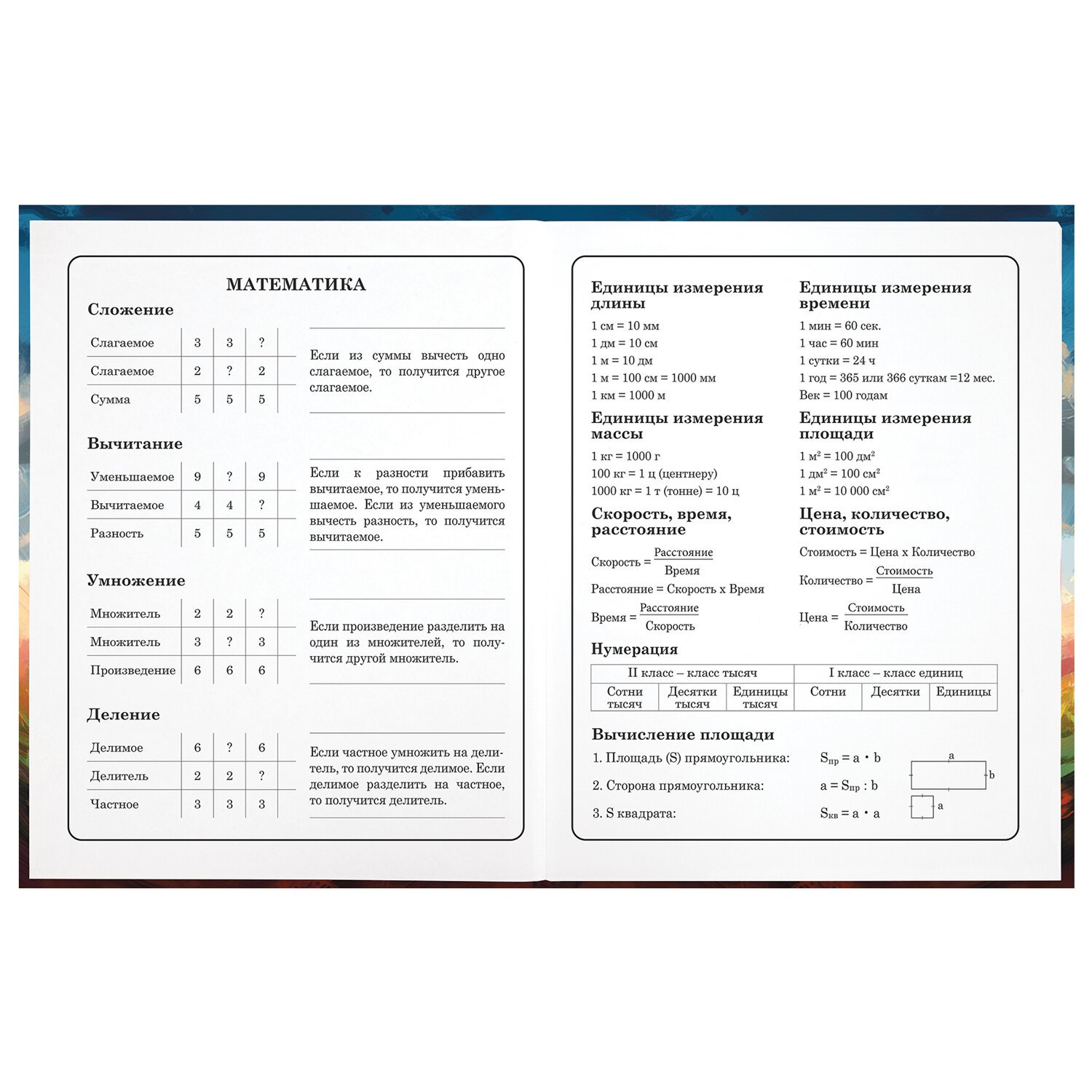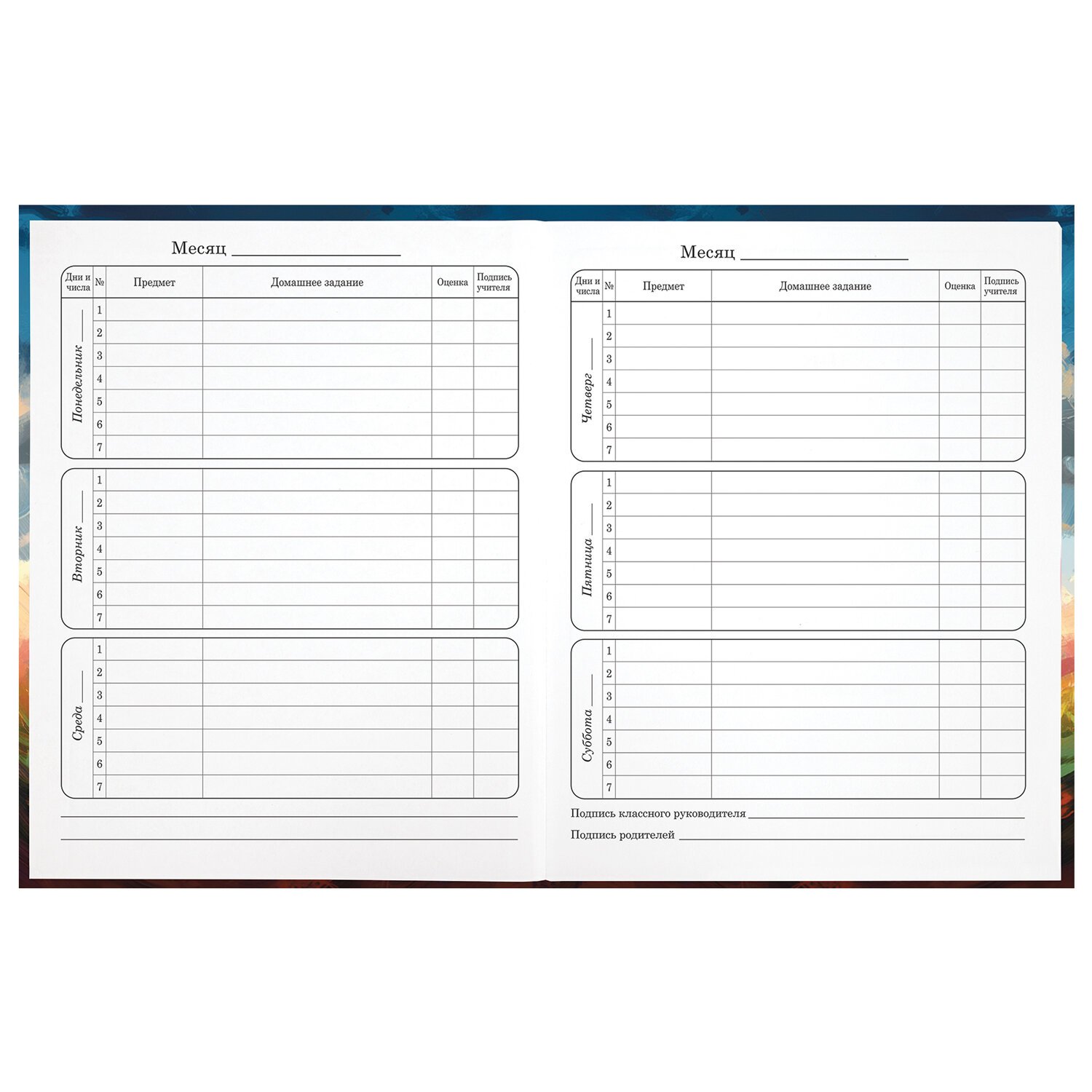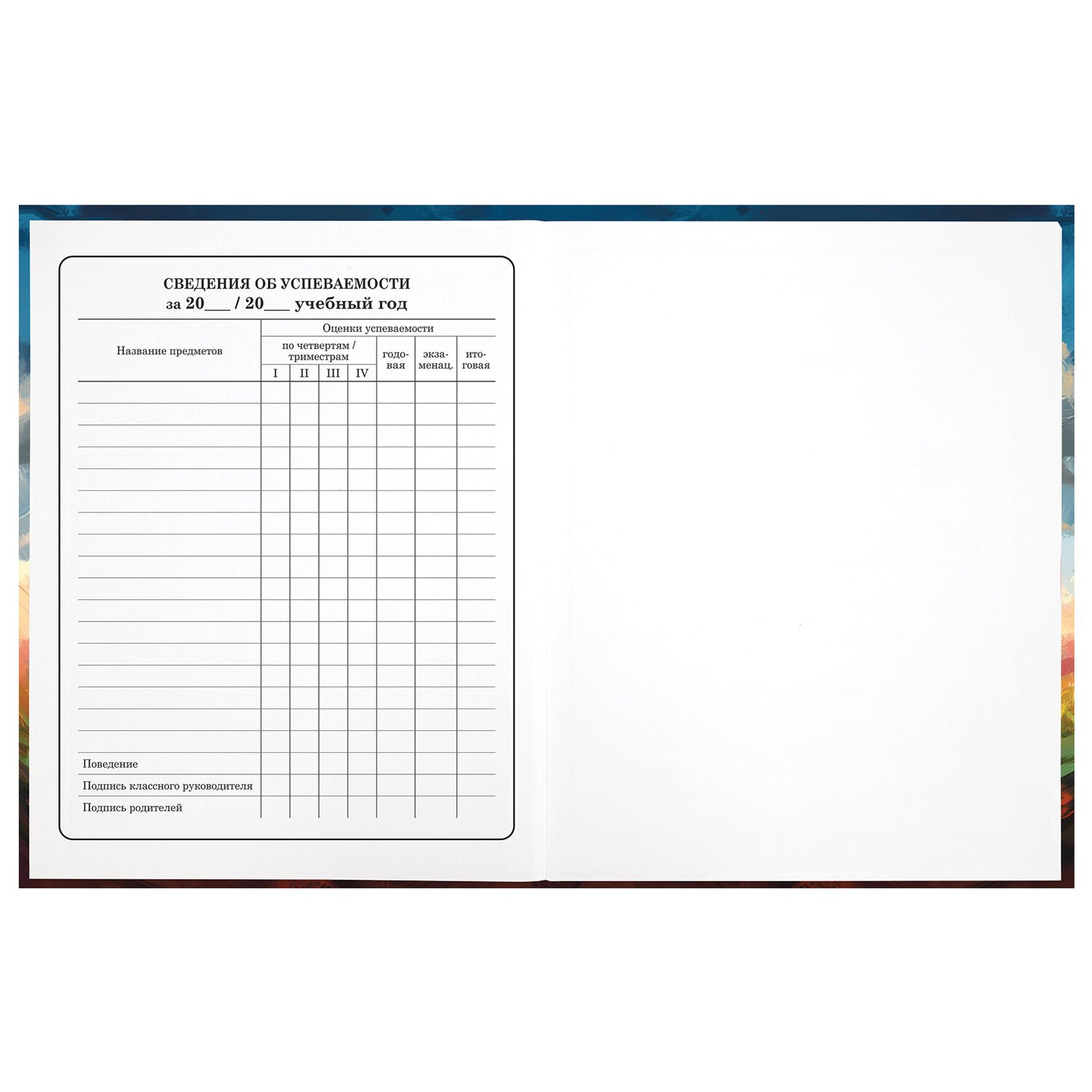 Внутренний блок содержит 48 листов офсетной белой бумаги плотностью 60 г/м2. Дневник снабжен полезным справочным материалом для учащихся.