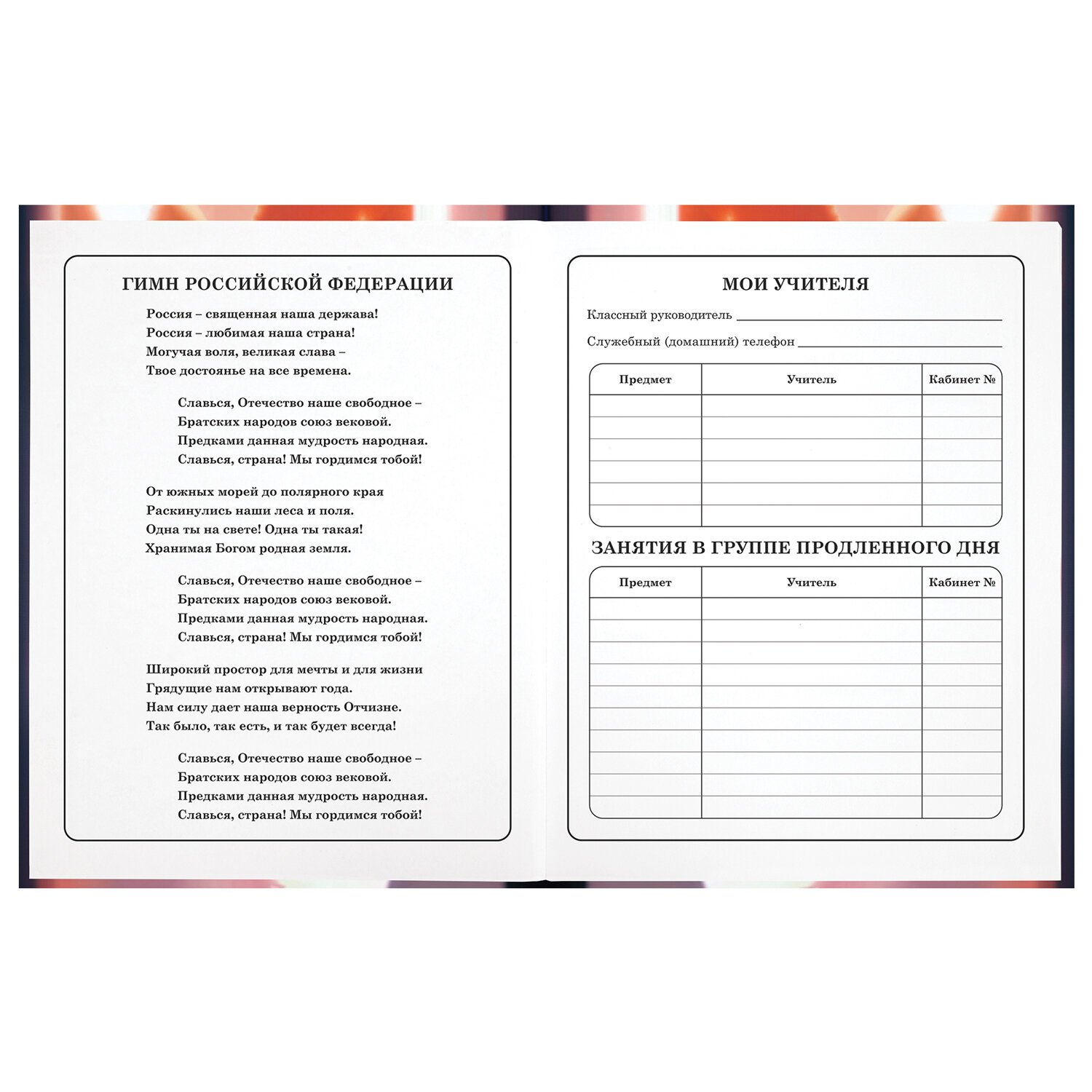 Внутренний блок содержит 48 листов офсетной белой бумаги плотностью 60 г/м2. Дневник снабжен полезным справочным материалом для учащихся.