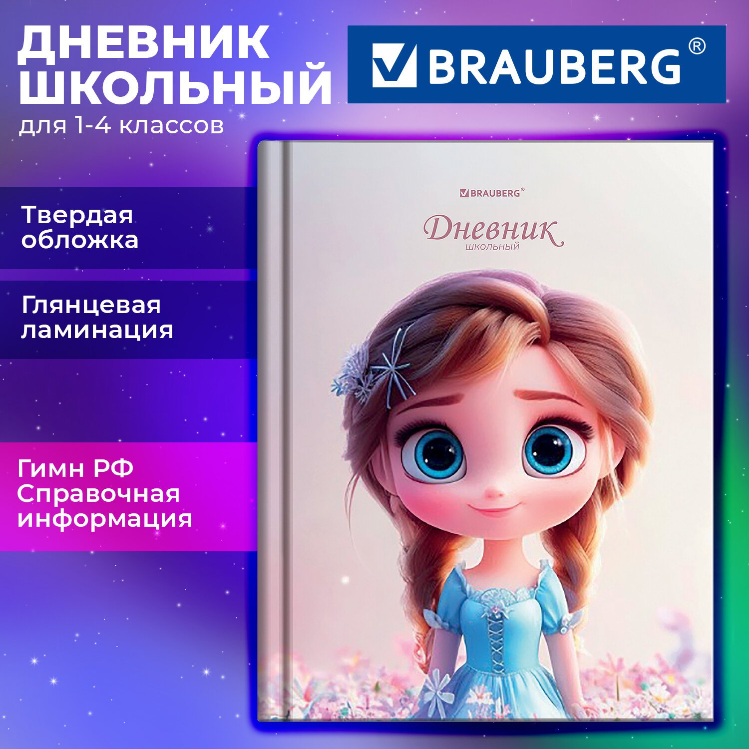 Дневник 1-4 класс 48л, твердый, BRAUBERG, глянцевая ламинация, с подсказом, Princess, 107590