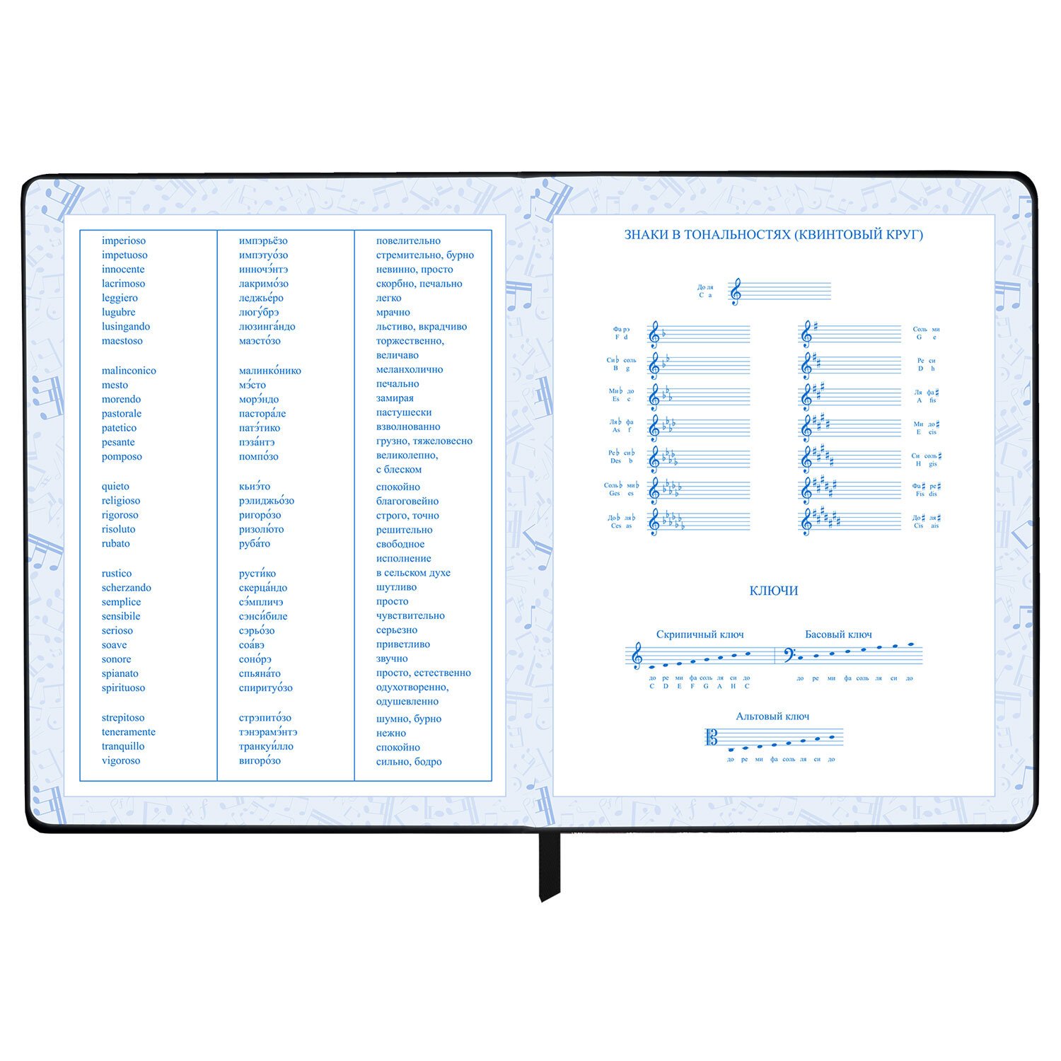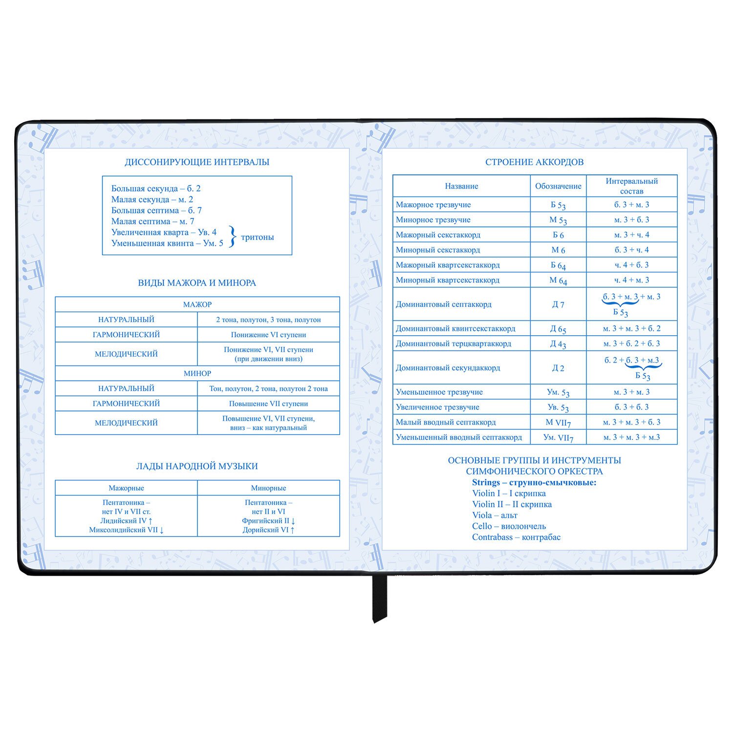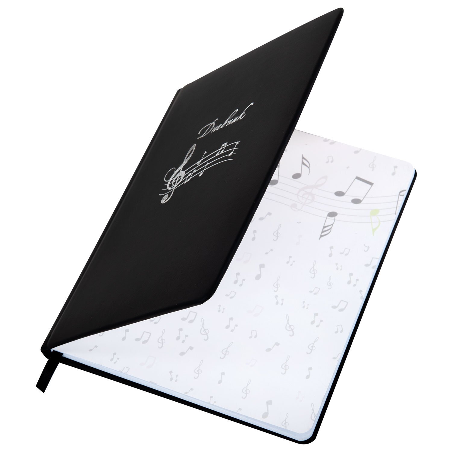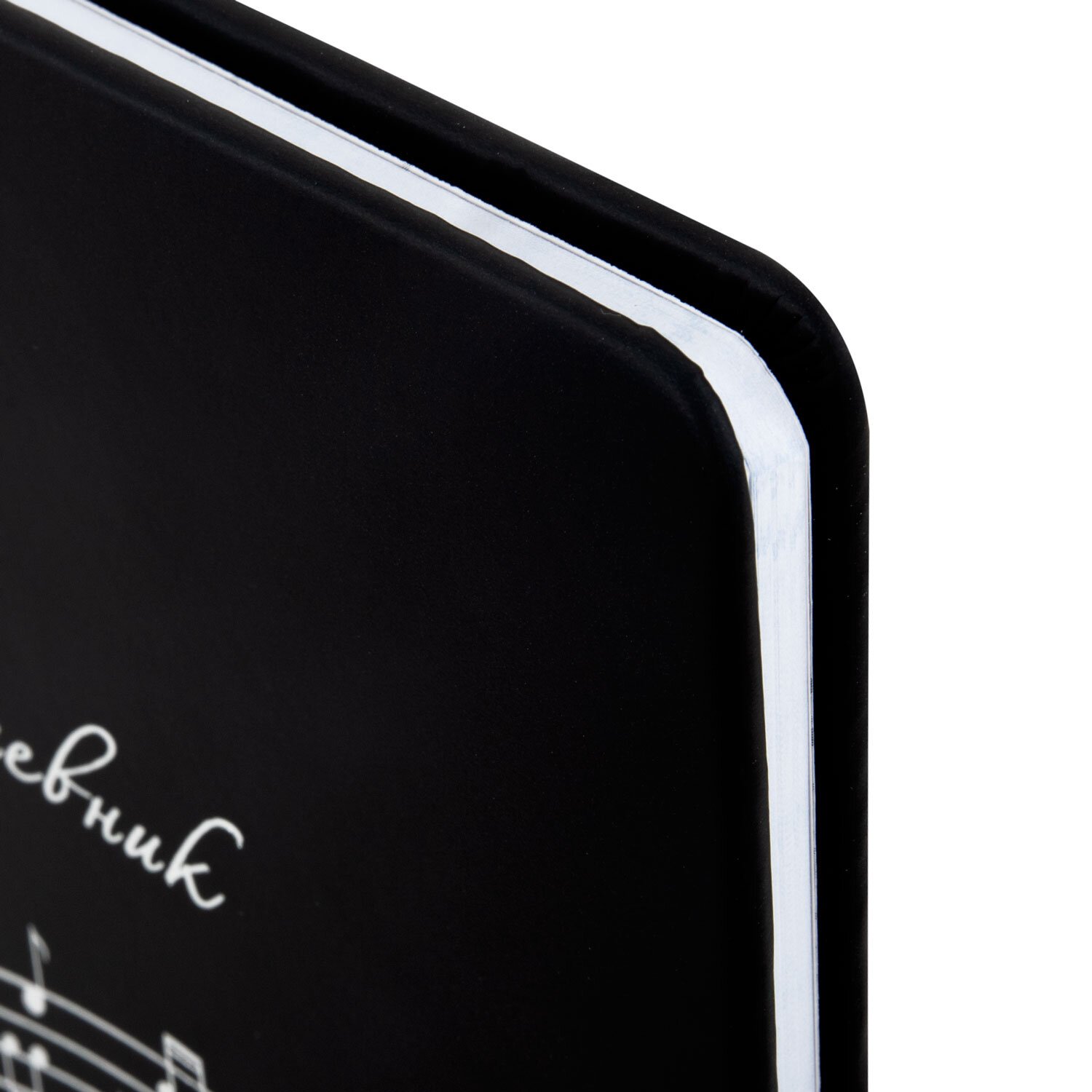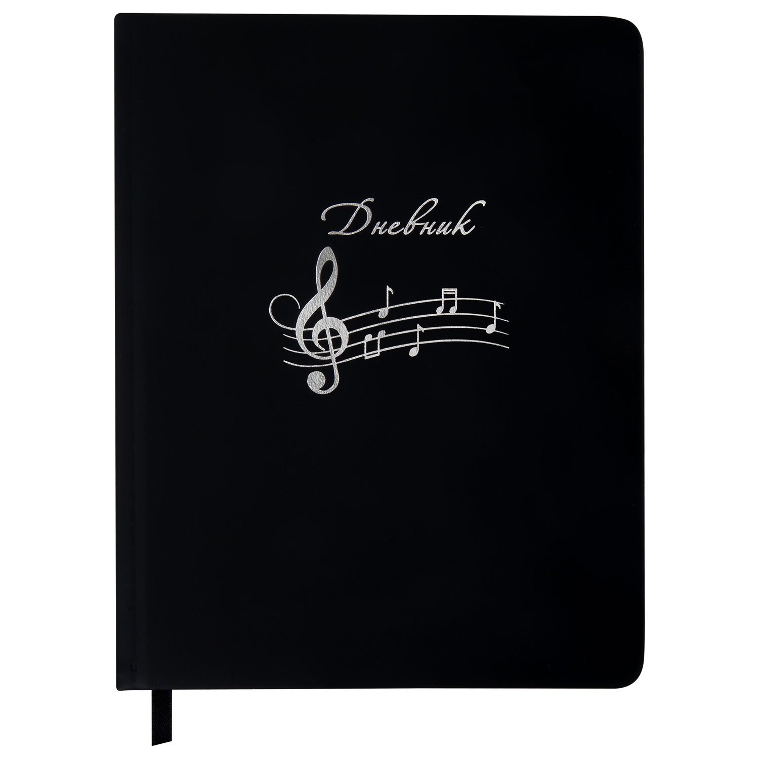 Внутренний блок изготовлен из белой офсетной бумаги повышенной плотности 70 г/м2. Содержит 48 листов для ведения записей и справочной информацией - длительности нот, интервалы, знаки в тональностях, ключи и пр. Обложка выполнена в черном цвете из экокожи - презентабельного и износоустойчивого материала. Элементы дизайна выполнены с помощью термотиснения и фольги. Для удобства использования дневник снабжен закладкой-ляссе.
