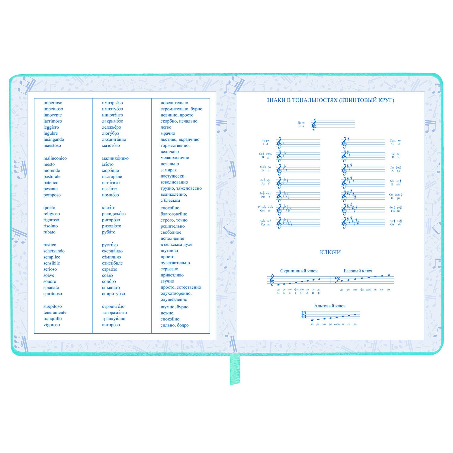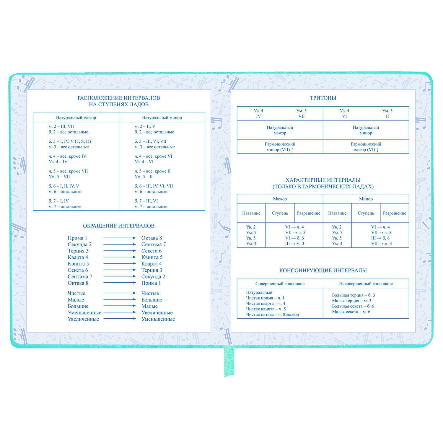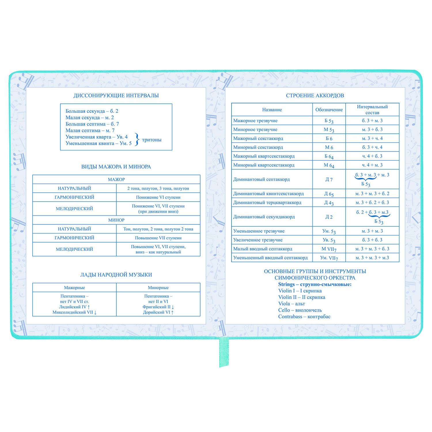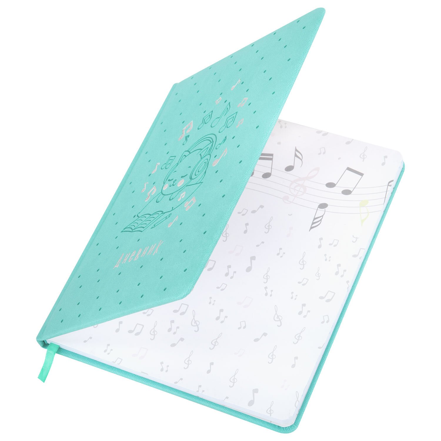 Внутренний блок изготовлен из белой офсетной бумаги повышенной плотности 70 г/м2. Содержит 48 листов для ведения записей и справочной информацией - длительности нот, интервалы, знаки в тональностях, ключи и пр. Обложка выполнена в мятном цвете из экокожи - презентабельного и износоустойчивого материала. Элементы дизайна выполнены с помощью термотиснения и фольги. Для удобства использования дневник снабжен закладкой-ляссе.