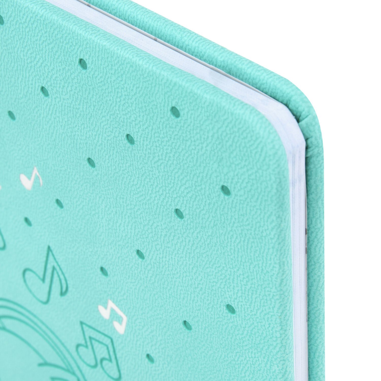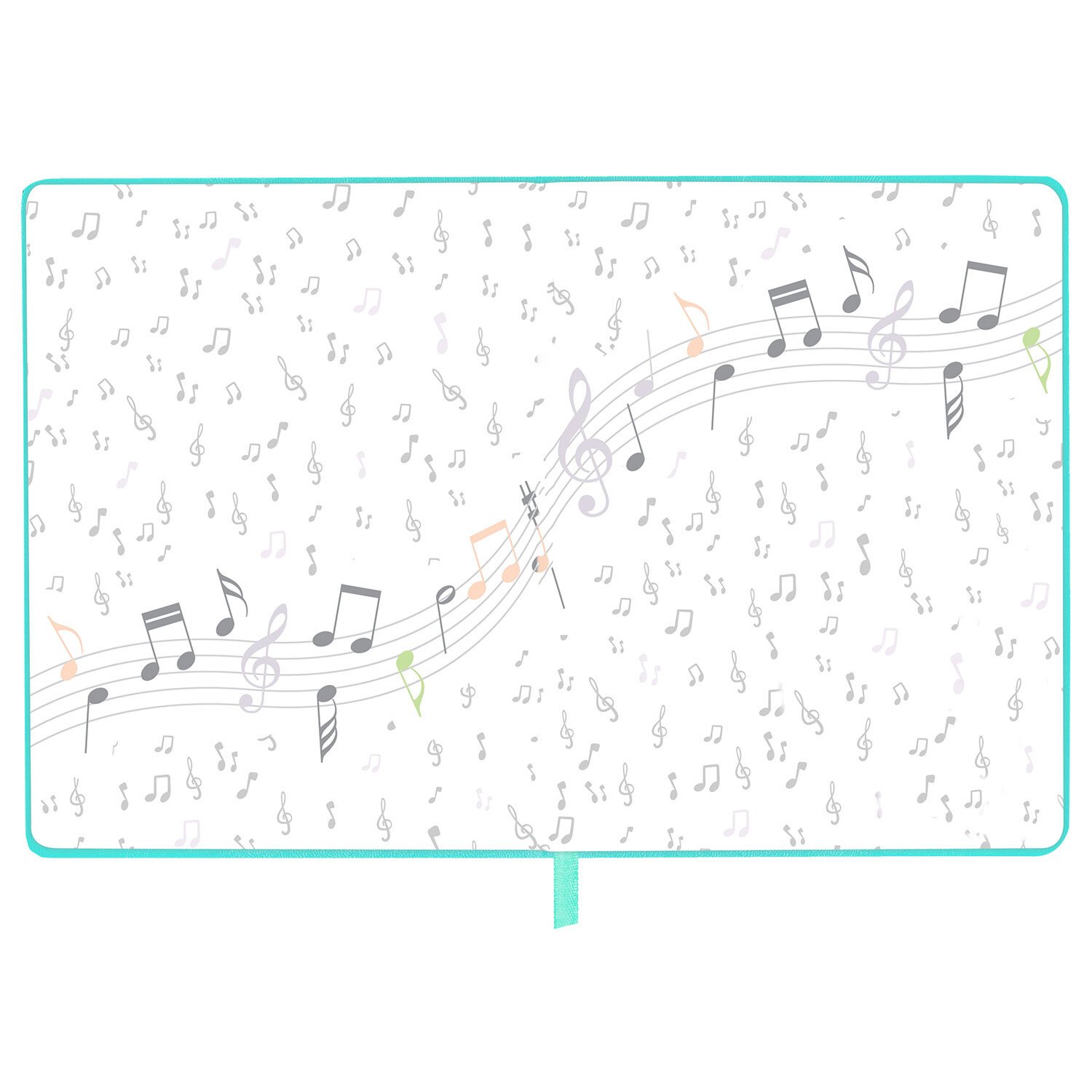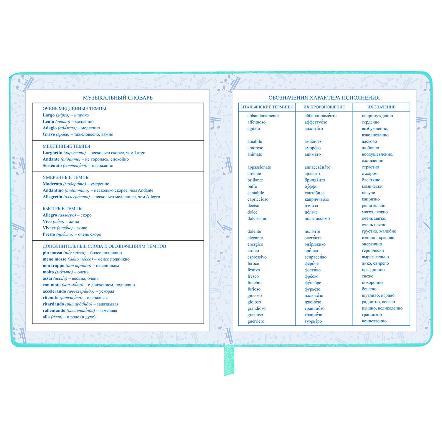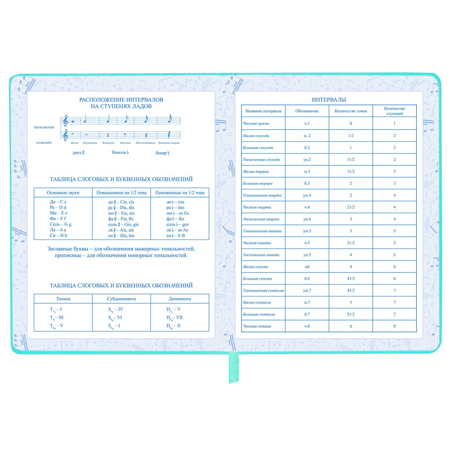 Внутренний блок изготовлен из белой офсетной бумаги повышенной плотности 70 г/м2. Содержит 48 листов для ведения записей и справочной информацией - длительности нот, интервалы, знаки в тональностях, ключи и пр. Обложка выполнена в мятном цвете из экокожи - презентабельного и износоустойчивого материала. Элементы дизайна выполнены с помощью термотиснения и фольги. Для удобства использования дневник снабжен закладкой-ляссе.