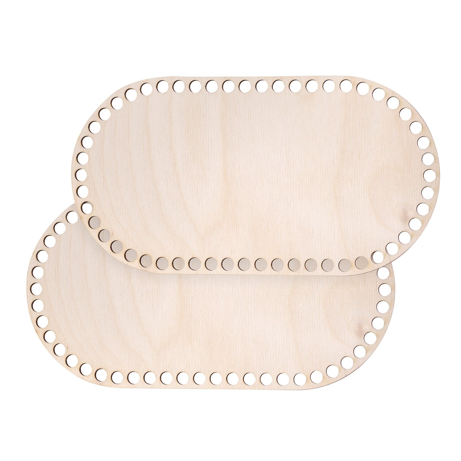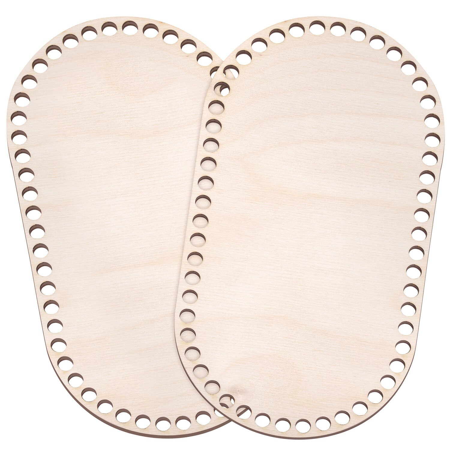 Донышко для вязания представляет собой гладкое и шлифованное с обеих сторон овальное деревянное основание размером 24,5х13 см и толщиной 3 мм, с 54 отверстиями по периметру, предназначенное для вязания крючком. Диаметр отверстий – 8 мм. В комплекте 2 штуки.