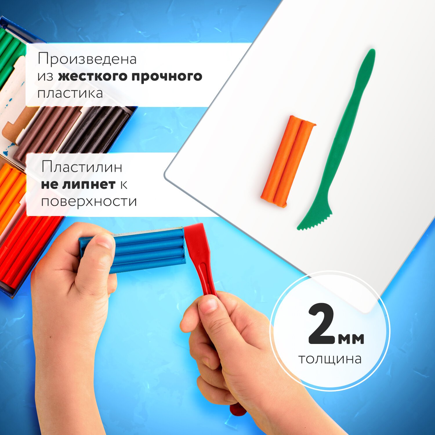 Набор состоит из 3 предметов: 2 стеков и доски. Производится из жесткого прочного пластика толщиной 2 мм, к которому не липнет пластилин. Гладкая фактура материала устойчива к царапинам. Размер - 150х205 мм (формат А5).