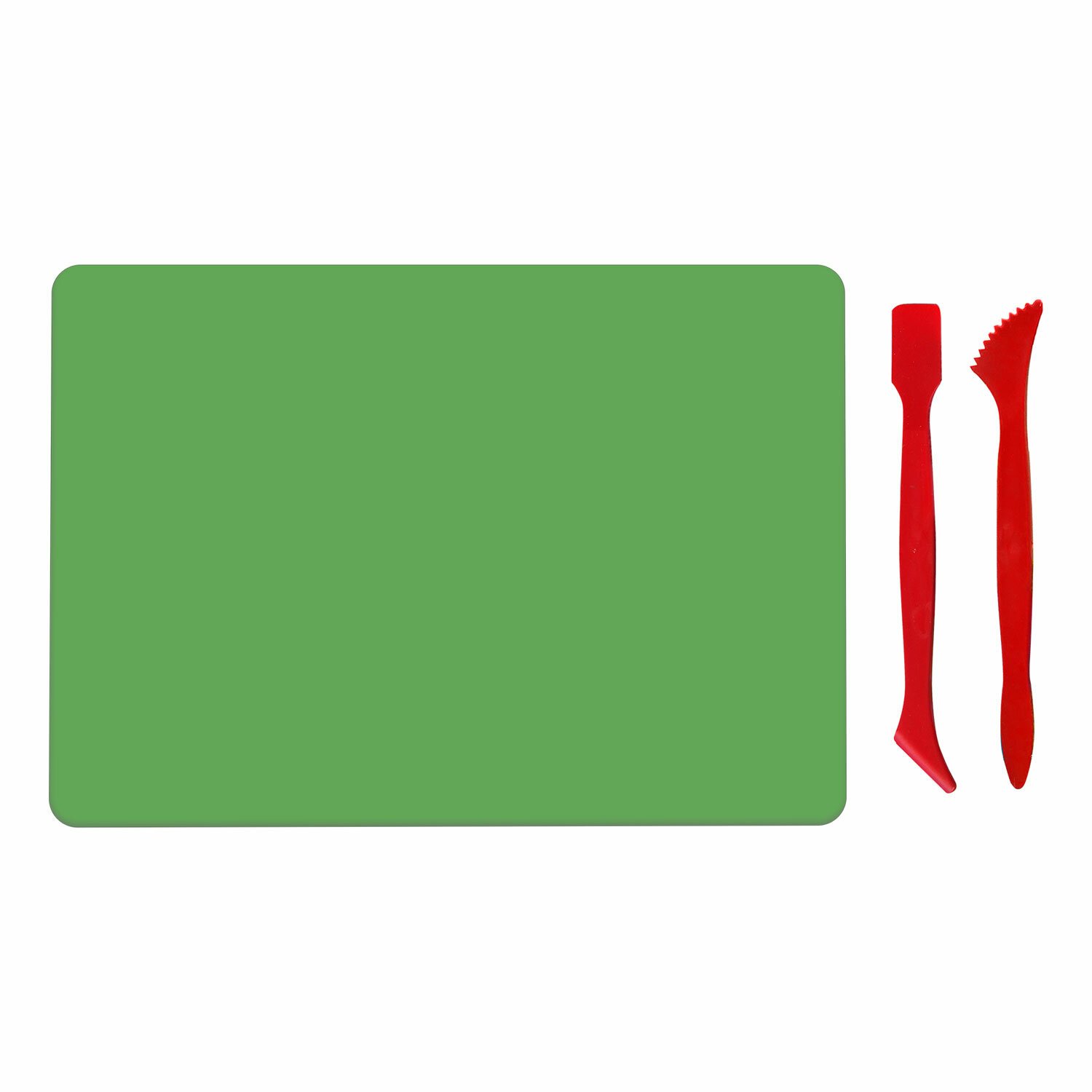 Набор состоит из 3-х предметов: 2-х стеков и доски. Производится из жесткого прочного пластика толщиной 1,5 мм, к которому не липнет пластилин. Гладкая фактура материала устойчива к царапинам. Размер - 205х150 мм (формат А5). Цвет: зеленый.