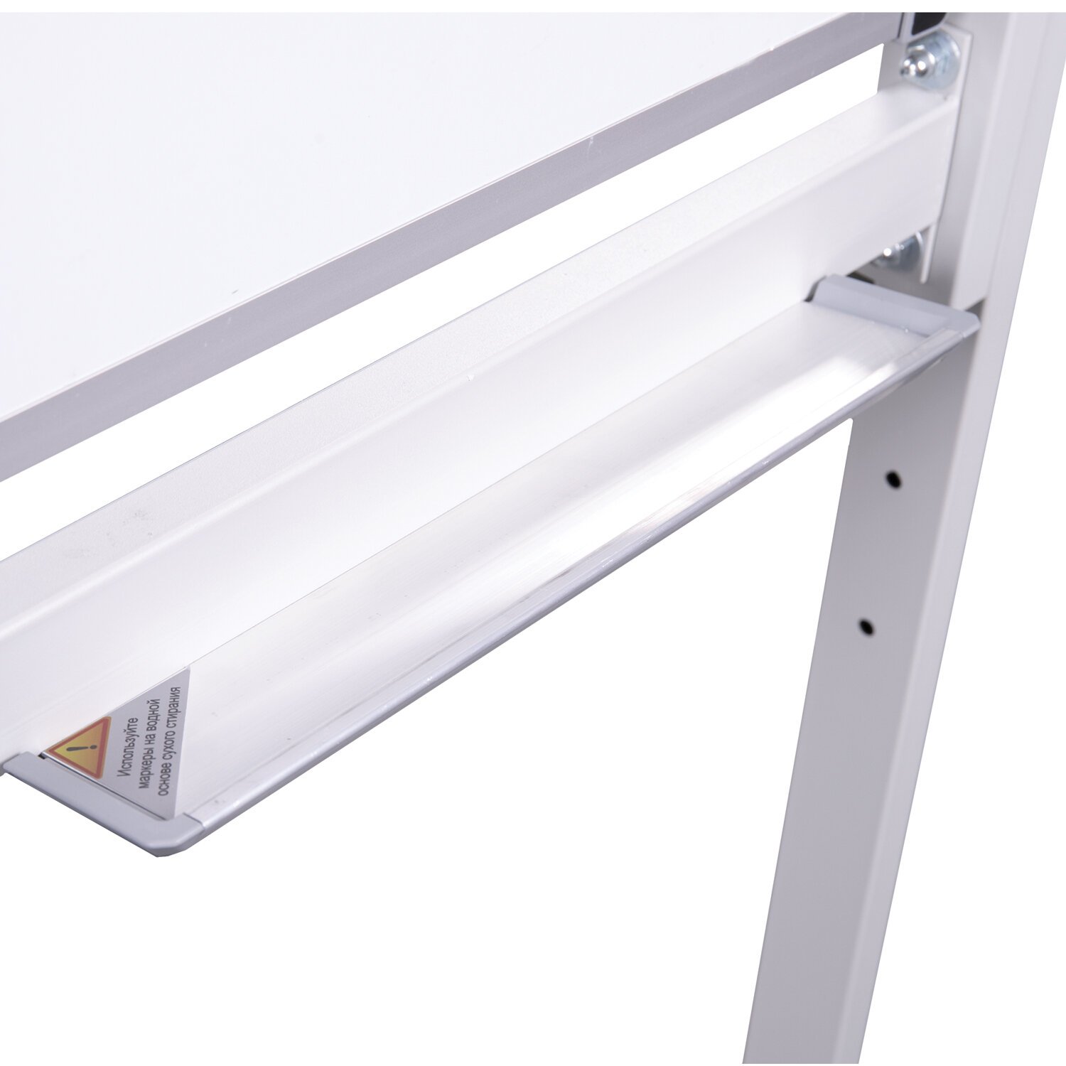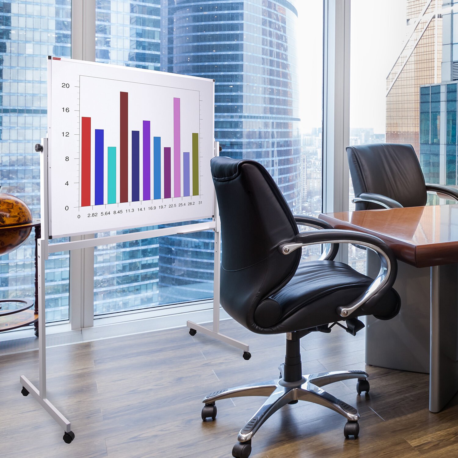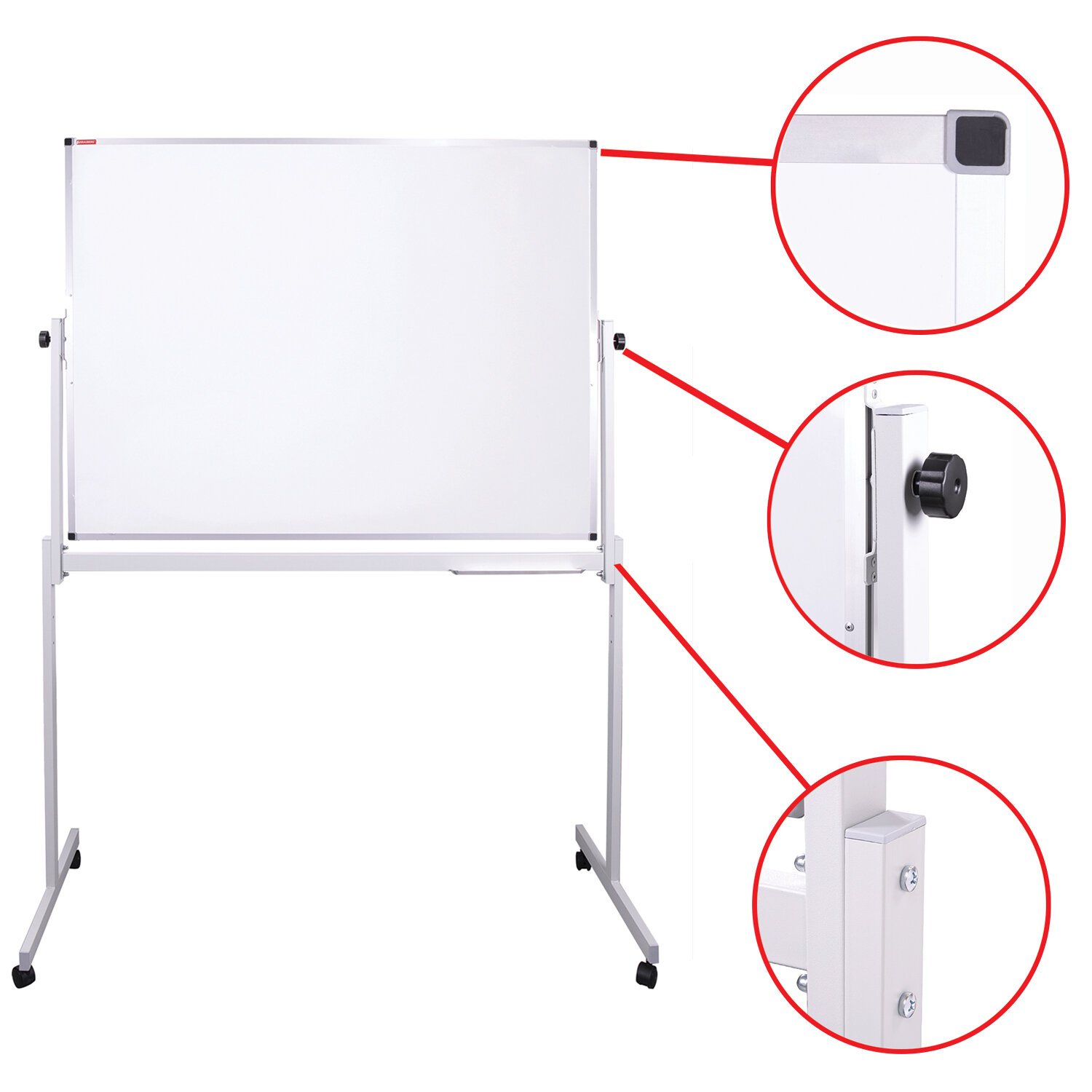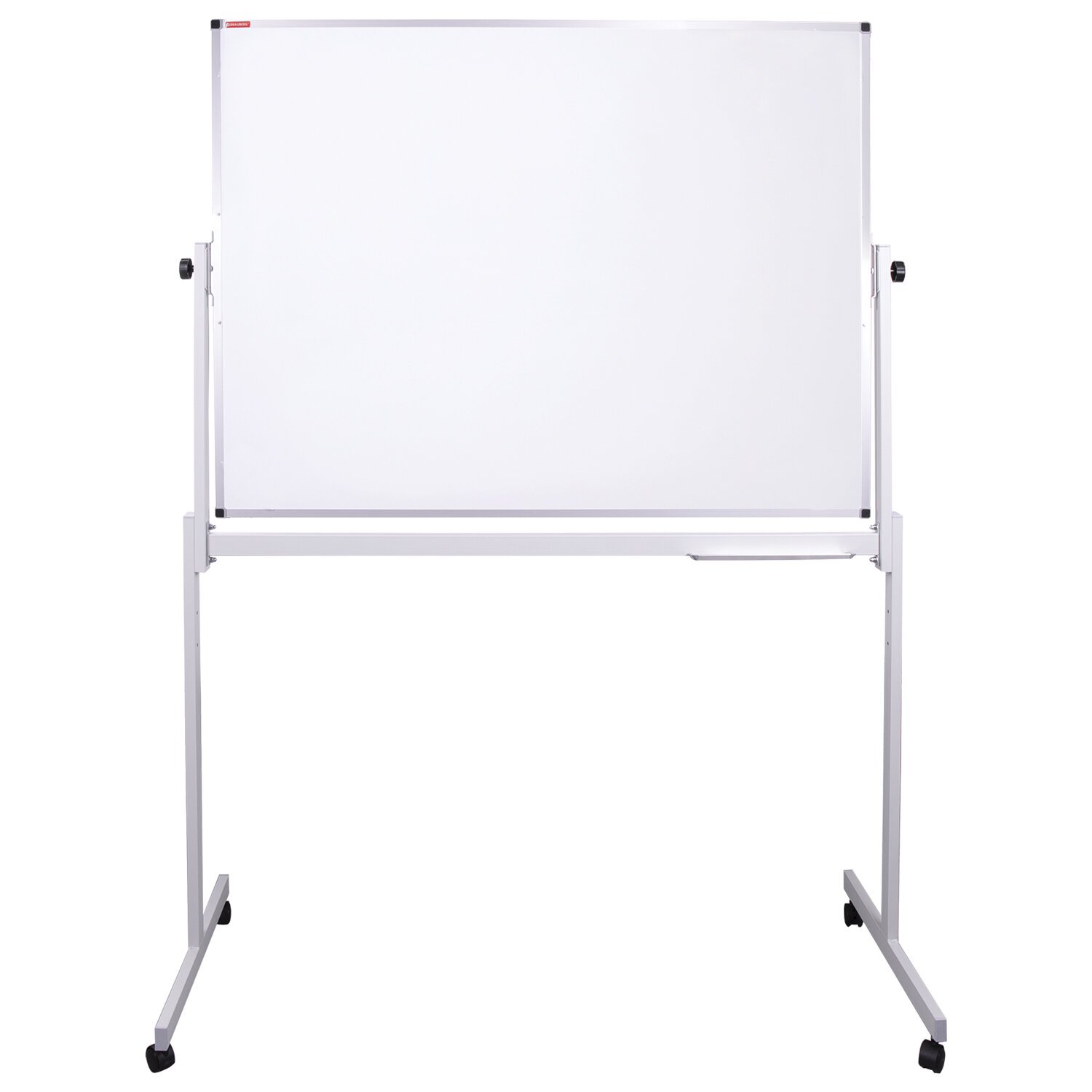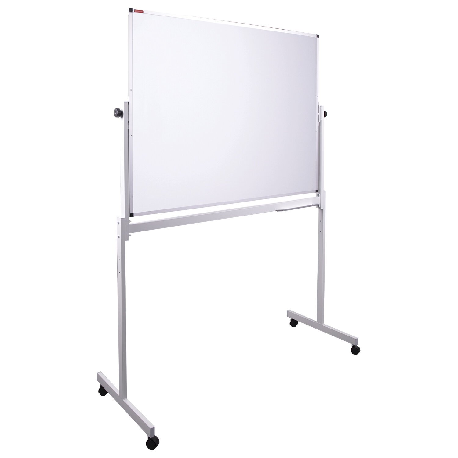 Лаковое покрытие предназначено для письма специальными маркерами для белой доски, а металлическая поверхность позволяет размещать информацию при помощи магнитов. Вращается в горизонтальной плоскости на 360°. Перемещается на колесиках. Алюминиевая рама придает доске необходимую прочность. Подставка для канцелярских принадлежностей позволяет всегда держать под рукой магниты, маркеры, стиратели и другие необходимые предметы. Элементы крепления входят в комплект. Защитная пленка предупреждает появление царапин, потертостей и сколов на рабочей поверхности доски при транспортировке и хранении продукции (перед началом работы необходимо удалить защитную плёнку). Размер: 90х120 см.