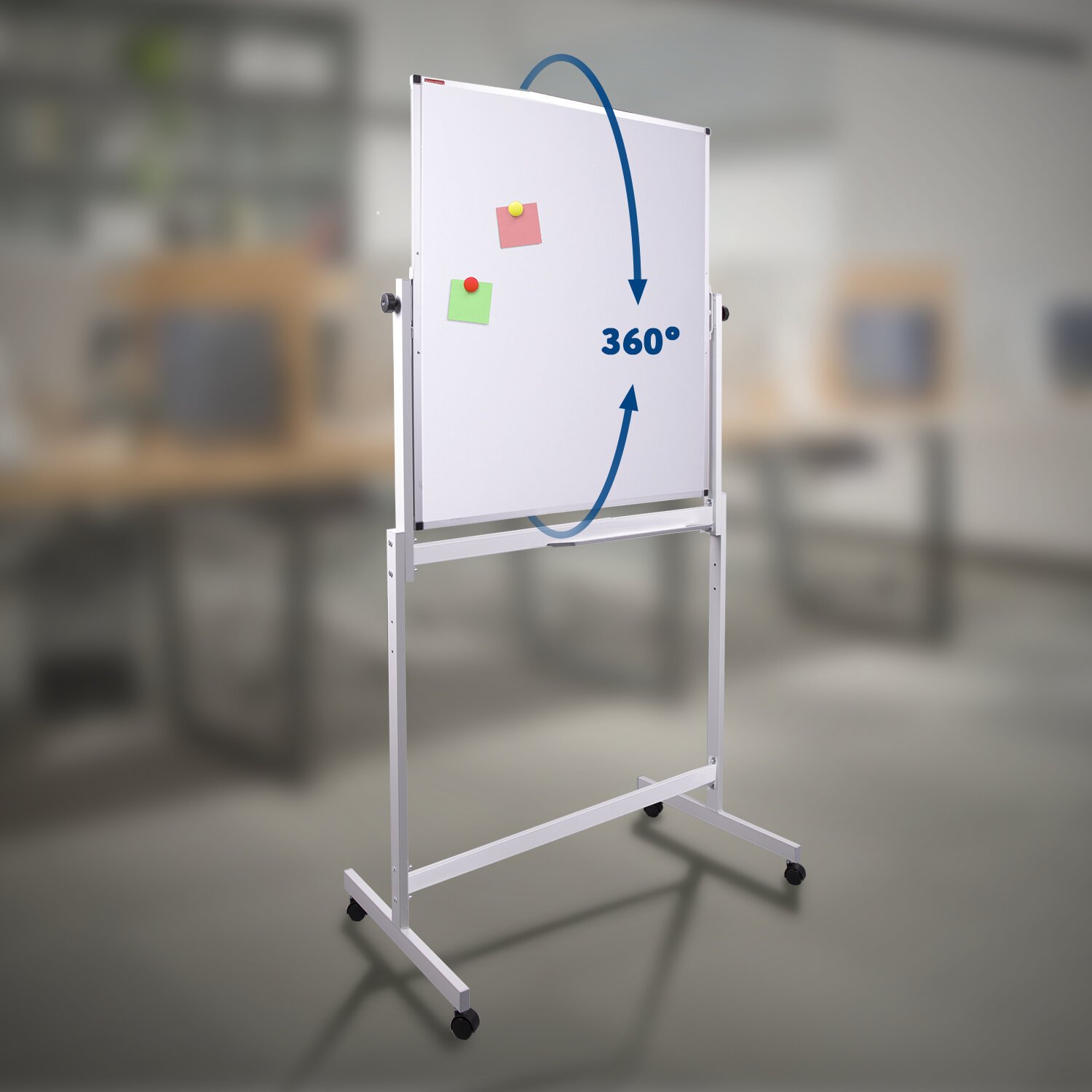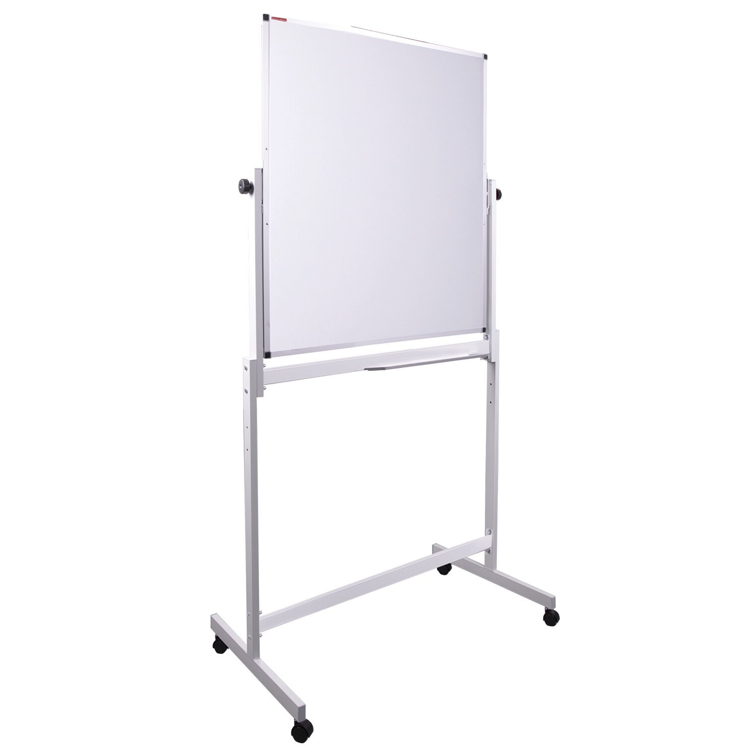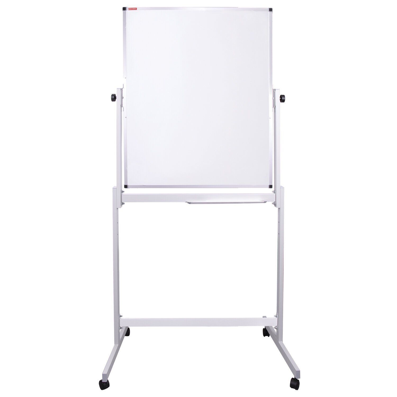 Лаковое покрытие предназначено для письма специальными маркерами для белой доски, а металлическая поверхность позволяет размещать информацию при помощи магнитов. Вращается в горизонтальной плоскости на 360°. Перемещается на колесиках. Алюминиевая рама придает доске необходимую прочность. Подставка для канцелярских принадлежностей позволяет всегда держать под рукой магниты, маркеры, стиратели и другие необходимые предметы. Элементы крепления входят в комплект. Защитная пленка предупреждает появление царапин, потертостей и сколов на рабочей поверхности доски при транспортировке и хранении продукции (перед началом работы необходимо удалить защитную плёнку). Размер: 90х60 см.