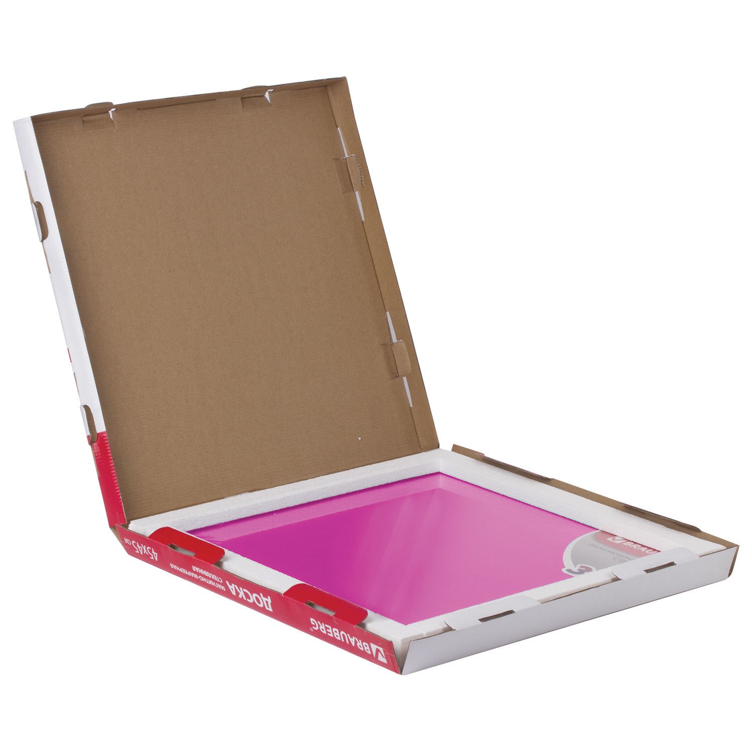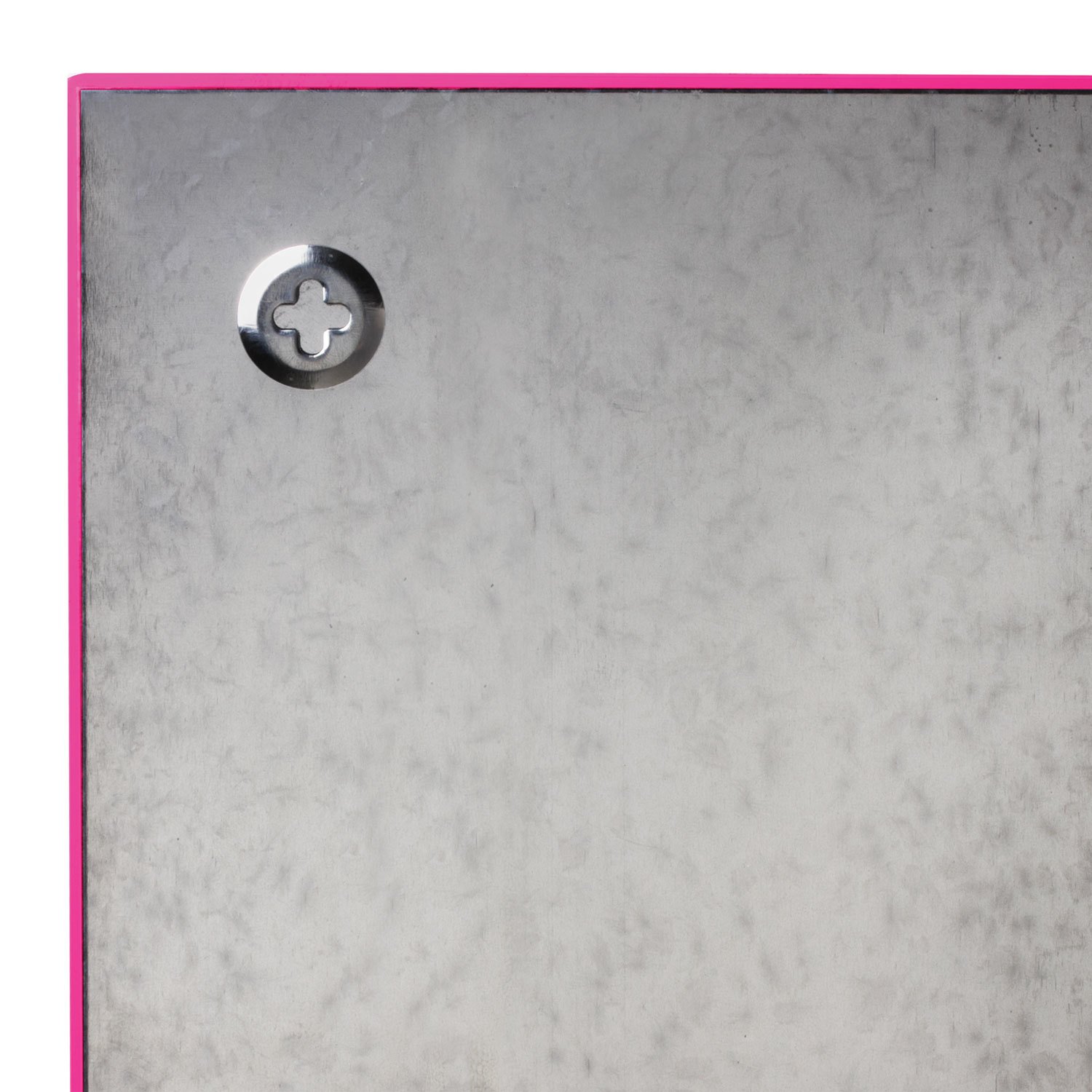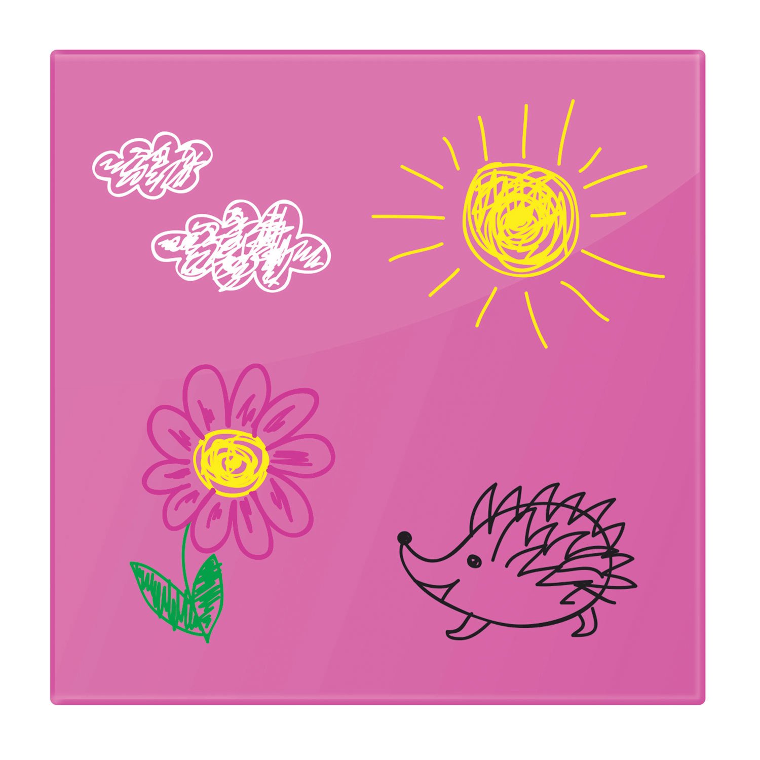 Рабочая поверхность розового цвета изготовлена из небьющегося стекла. Размер доски - 45х45 см. Надежно упакована в защитную пленку и красочную подарочную коробку с ручкой. 3 специальных неодимовых магнита и элементы крепления входят в комплект. Скрытый тип крепления с задней стороны поможет вписать доску в любой интерьер.