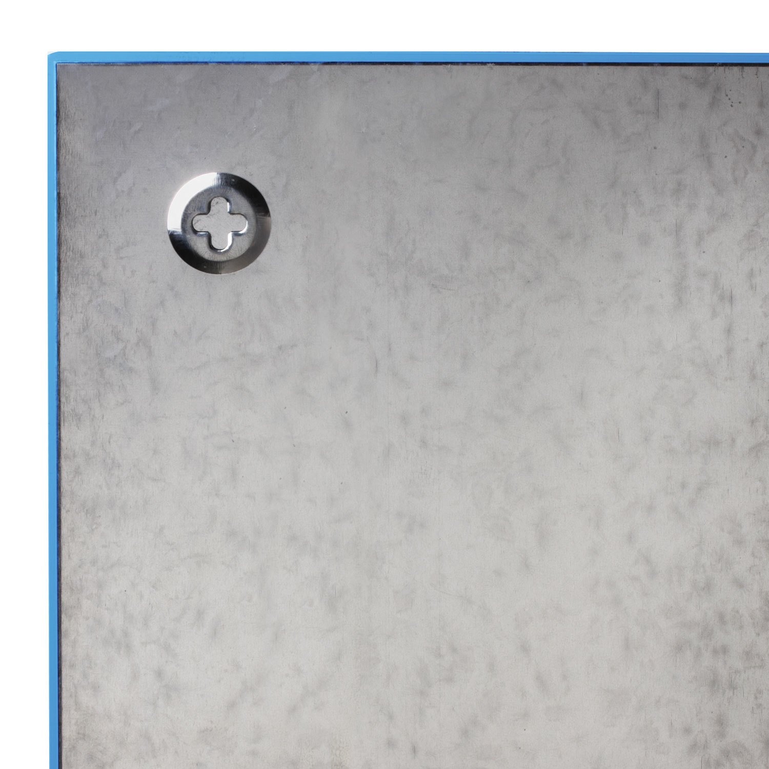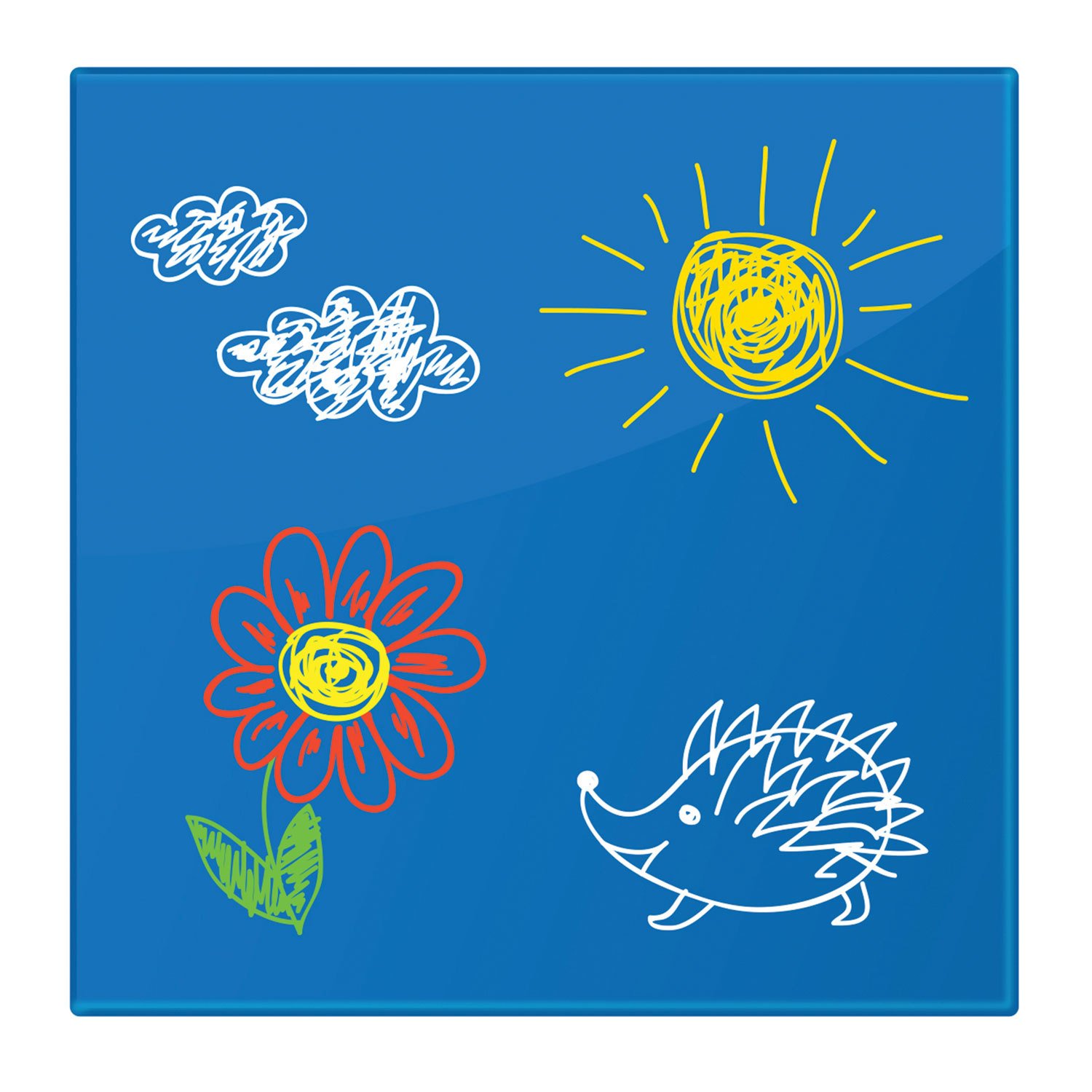 Рабочая поверхность синего цвета изготовлена из небьющегося стекла. Размер доски - 45х45 см. Надежно упакована в защитную пленку и красочную подарочную коробку с ручкой. 3 специальных неодимовых магнита и элементы крепления входят в комплект. Скрытый тип крепления с задней стороны поможет вписать доску в любой интерьер.