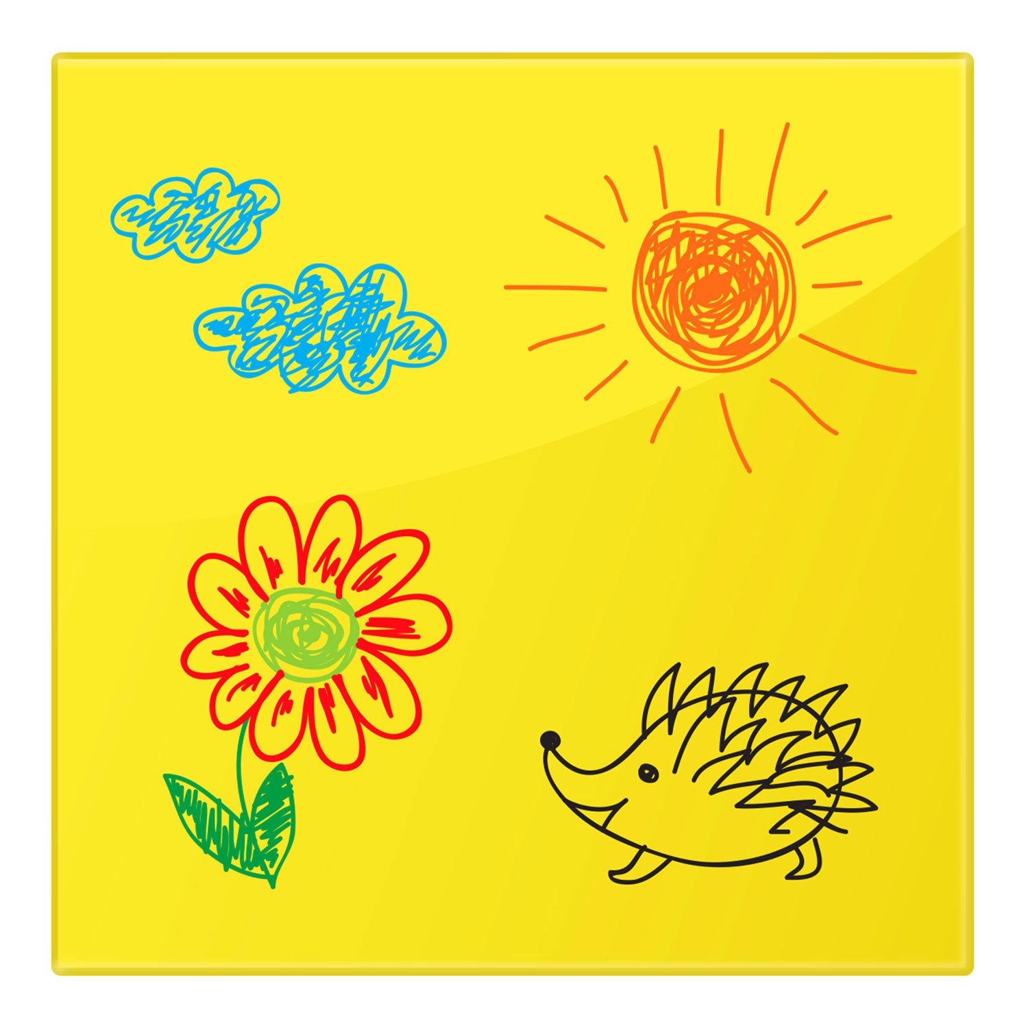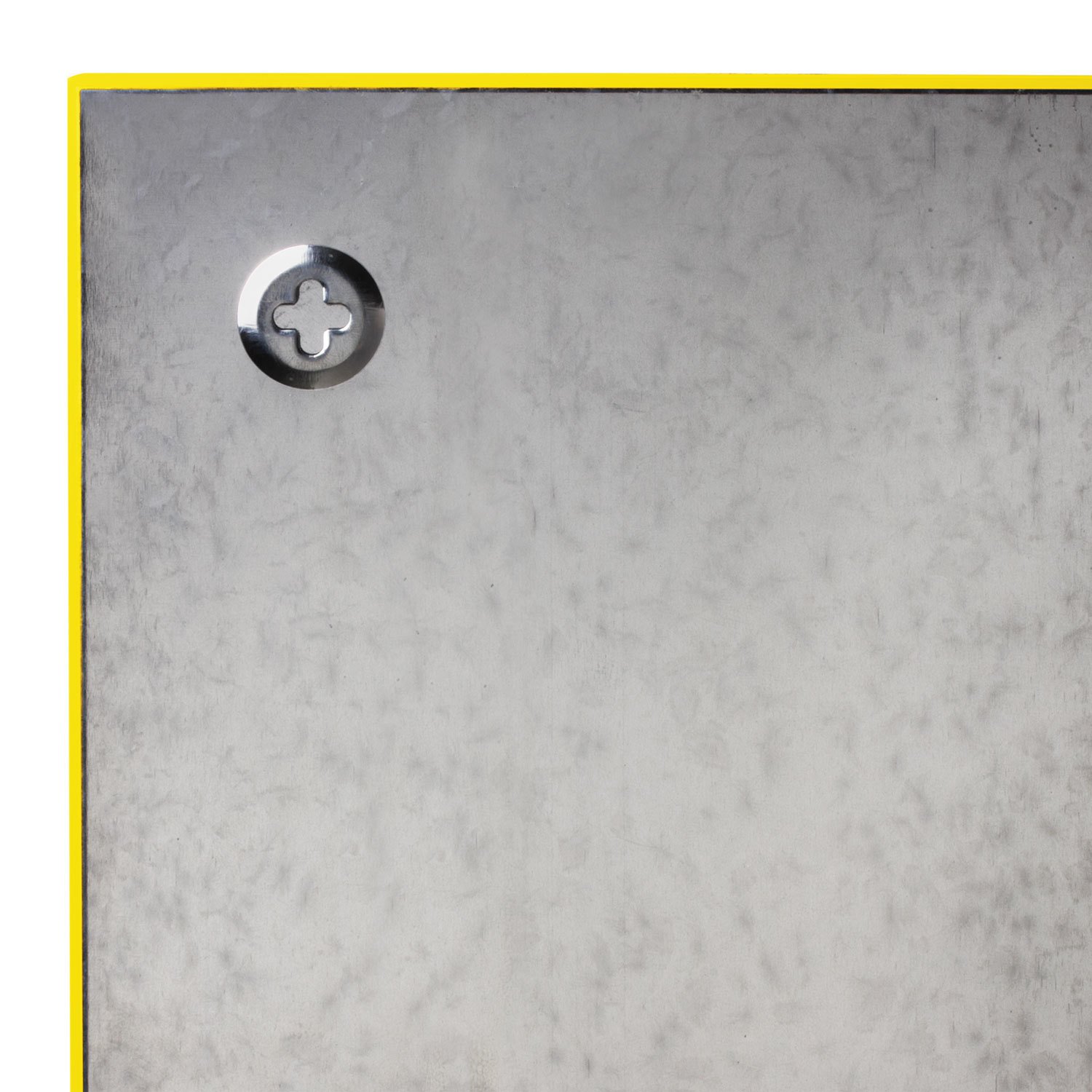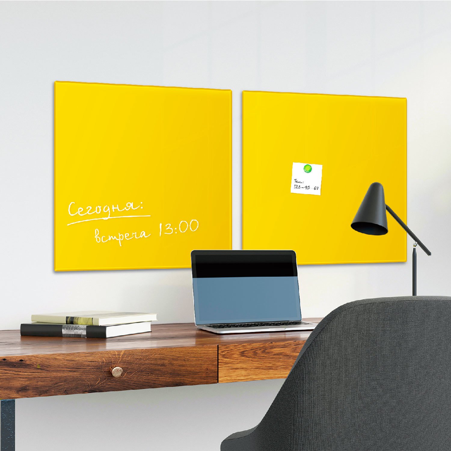 Рабочая поверхность жёлтого цвета изготовлена из небьющегося стекла. Размер доски - 45х45 см. Надежно упакована в защитную пленку и красочную подарочную коробку с ручкой. 3 специальных неодимовых магнита и элементы крепления входят в комплект. Скрытый тип крепления с задней стороны поможет вписать доску в любой интерьер.