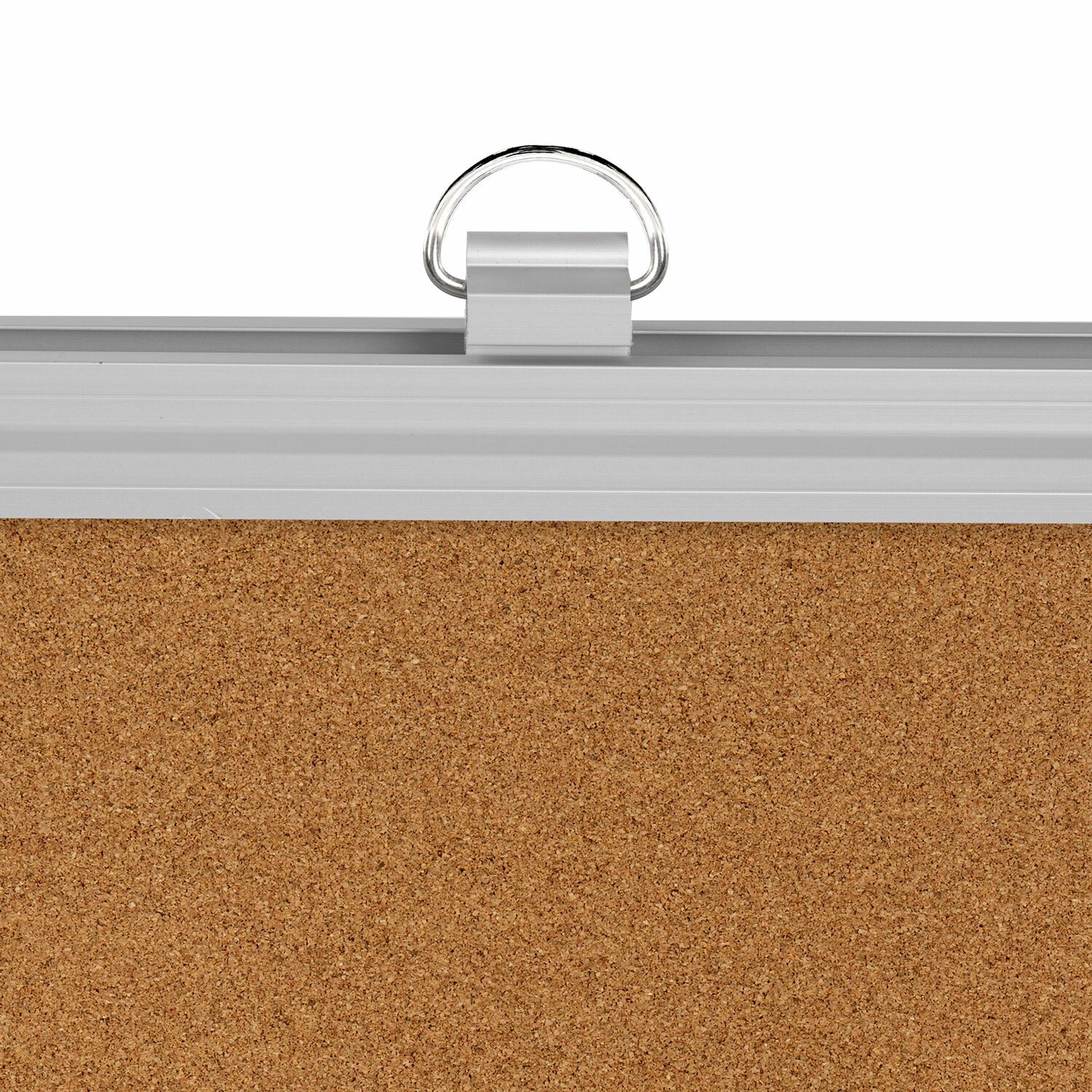 Поверхность изготовлена из натуральной пробки. Имеет улучшенную алюминиевую рамку и укрепленные пластиковые уголки. Размер доски – 45х60х1,8 см. Цвет покрытия – коричневый. Возможность горизонтального и вертикального размещения доски. Крепится к стене, элементы крепления входят в комплект.