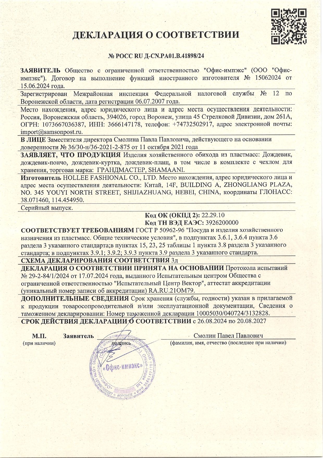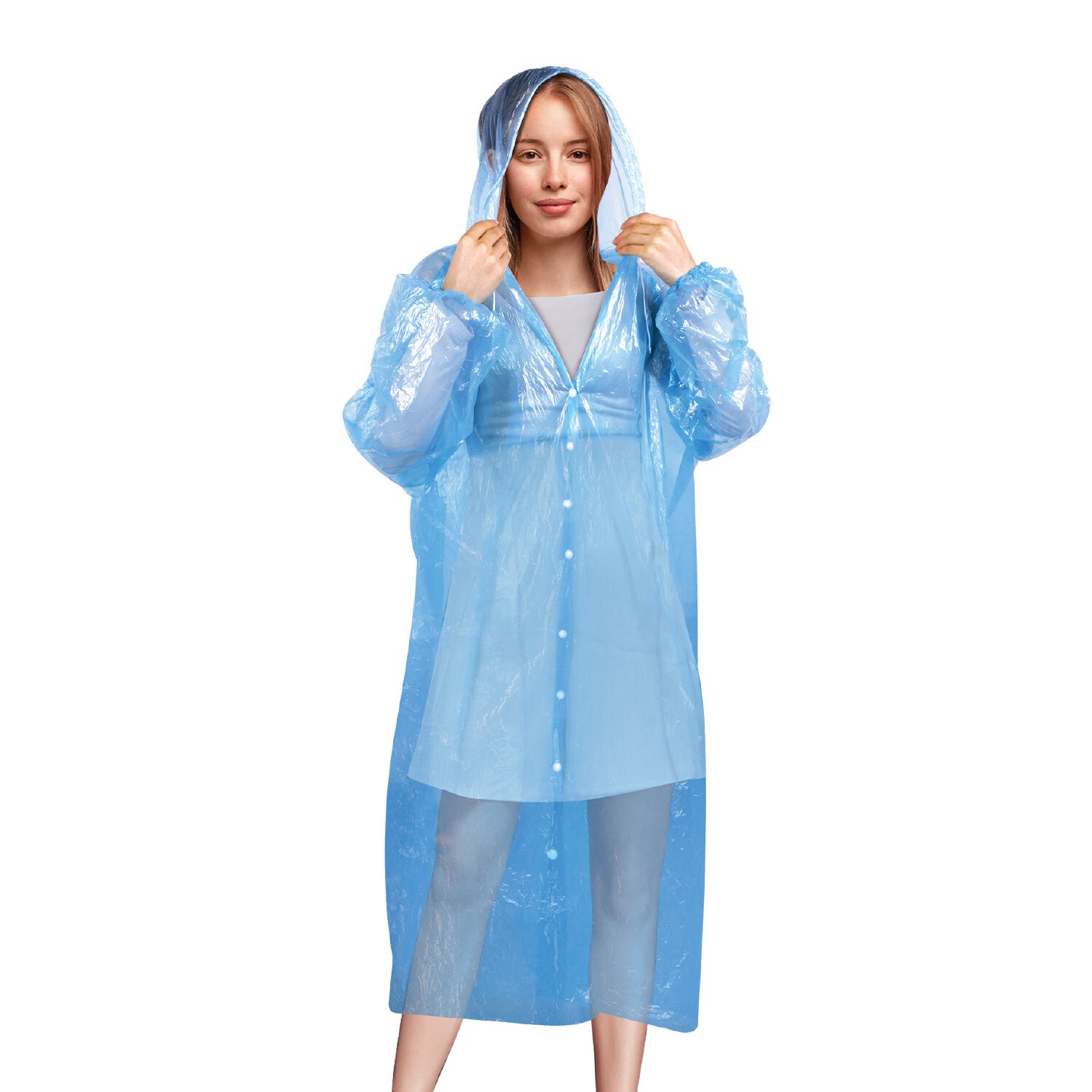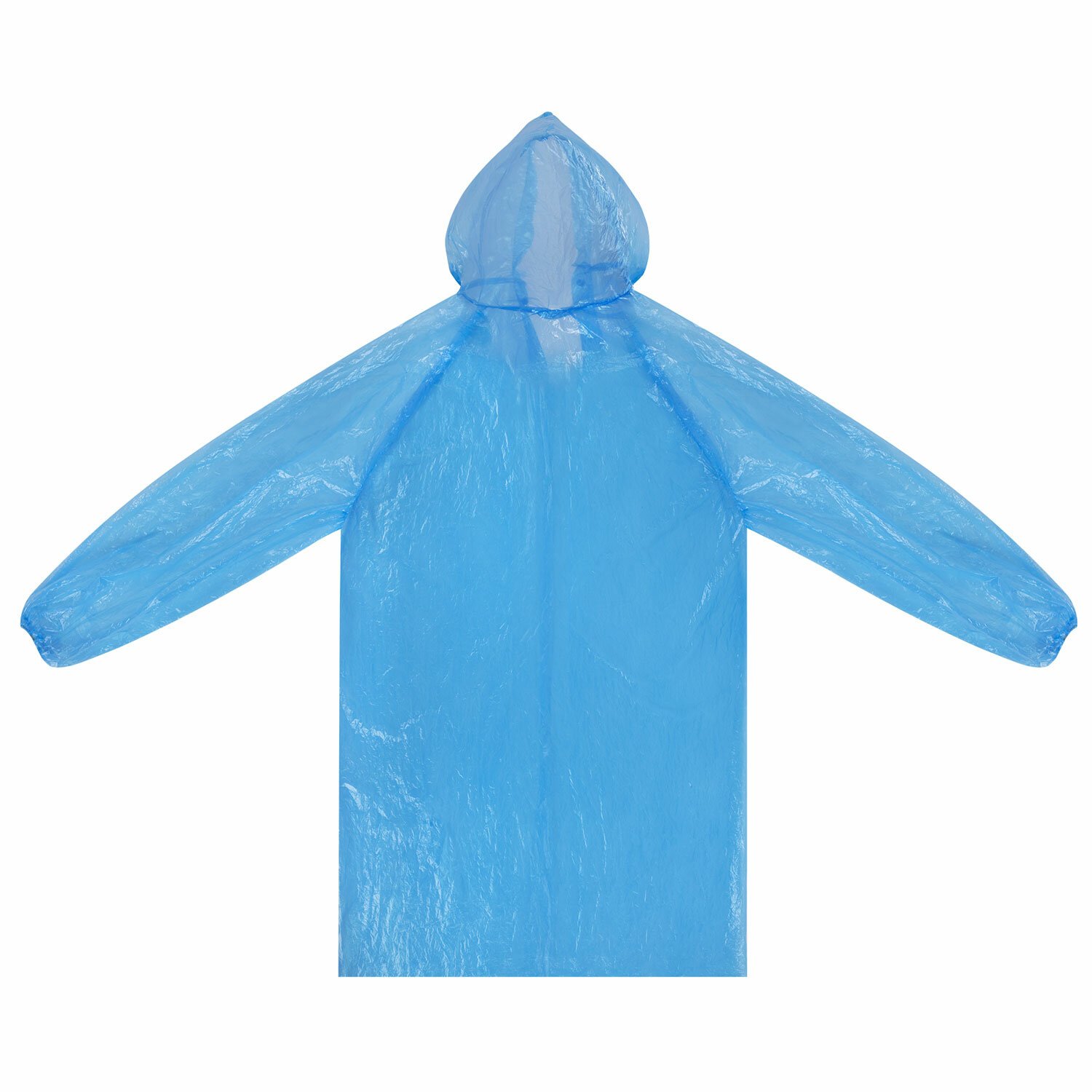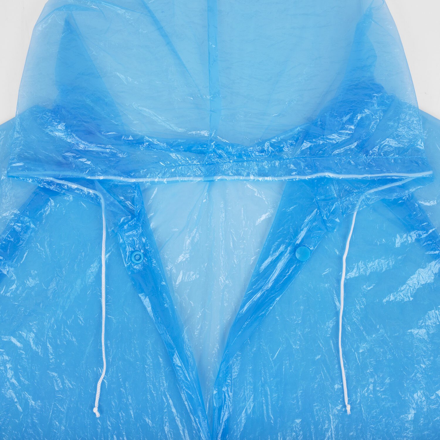 Дождевик-плащ универсального размера с капюшоном изготовлен из полиэтилена (PE). Застегивается на 4 пары кнопок из полипропилена (PP). В капюшоне есть кулиска с пластиковыми наконечниками. В рукава вставлены резинки для более плотного прилегания материала к запястью и предотвращения попадания влаги внутрь. Для многоразового использования.