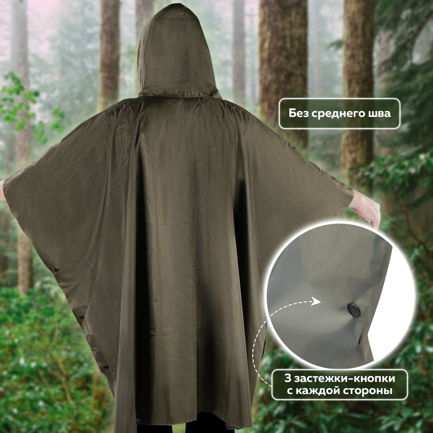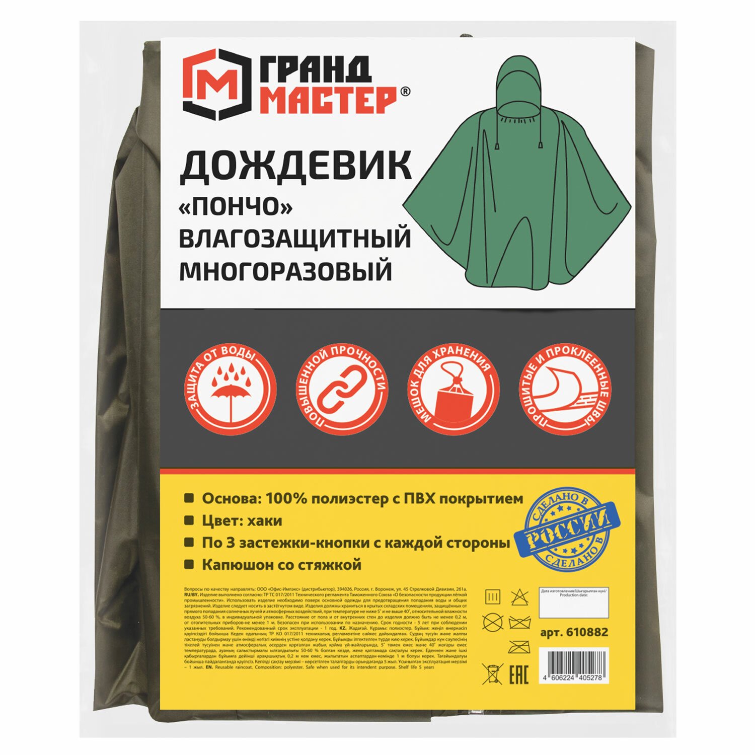 Дождевик-пончо хаки на кнопках многоразовый с ПВХ покрытием и мешком для хранения ГРАНДМАСТЕР, 610882