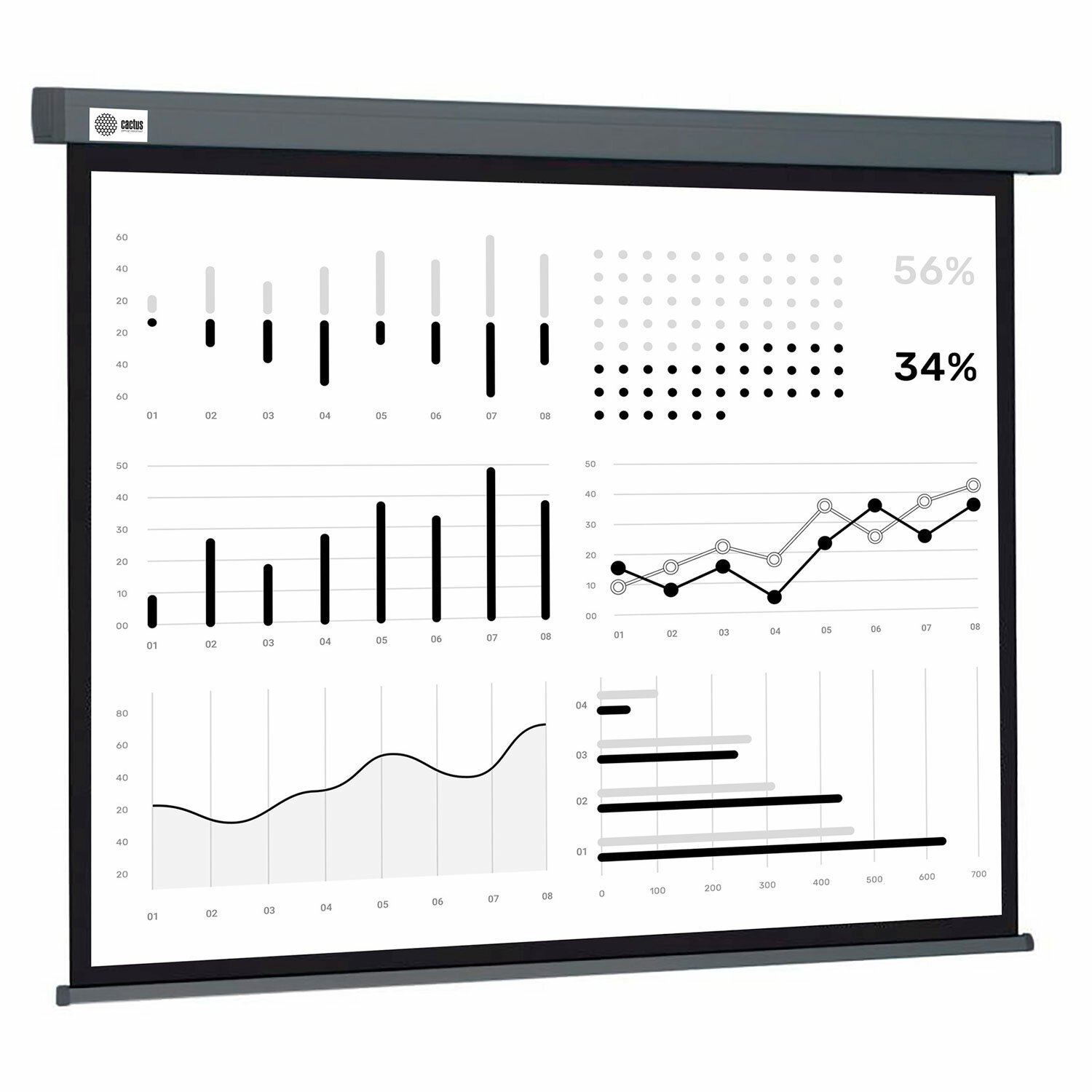 Удобный мобильный проекционный экран CACTUS настенно-потолочный рулонный. Предназначен для использования в качестве демонстрационного средства при проведении уроков, тренингов, занятий и презентаций.