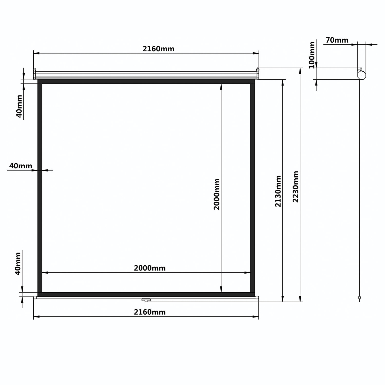 Экран с диагональю 114" и размером 200х200 см имеет черную кайму для улучшения восприятия яркости изображения. Коэффициент отражения составляет 1, угол обзора – 160°. Оснащен пружинным механизмом, благодаря которому полотно легко разворачивается и фиксируется на любой высоте. В комплекте инструкция и компактный многоразовый пузырьковый уровень для удобного монтирования на стену или потолок.