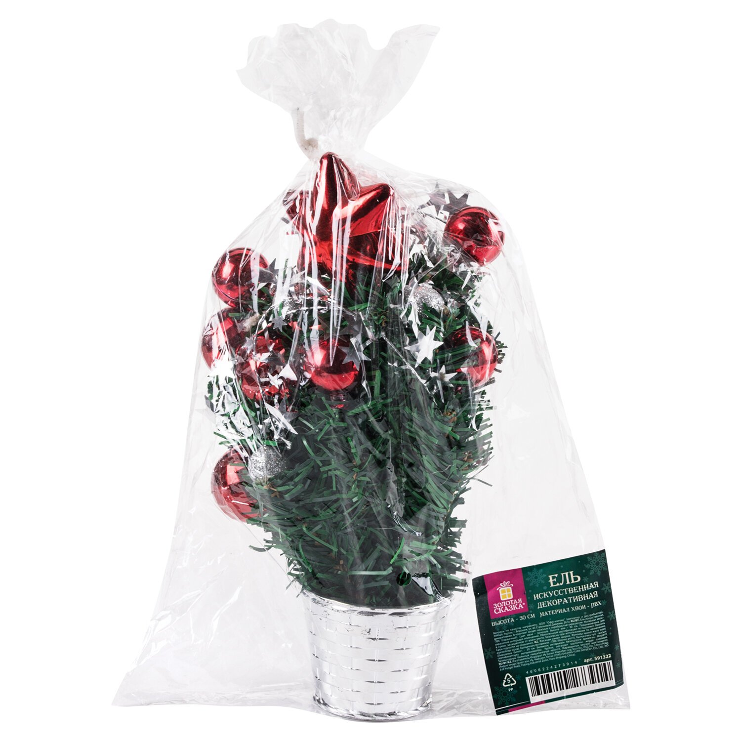 Ель искусственная новогодняя декоративная ЗОЛОТАЯ СКАЗКА 30 см, ПВХ, красные/серебристые украшения, 591322