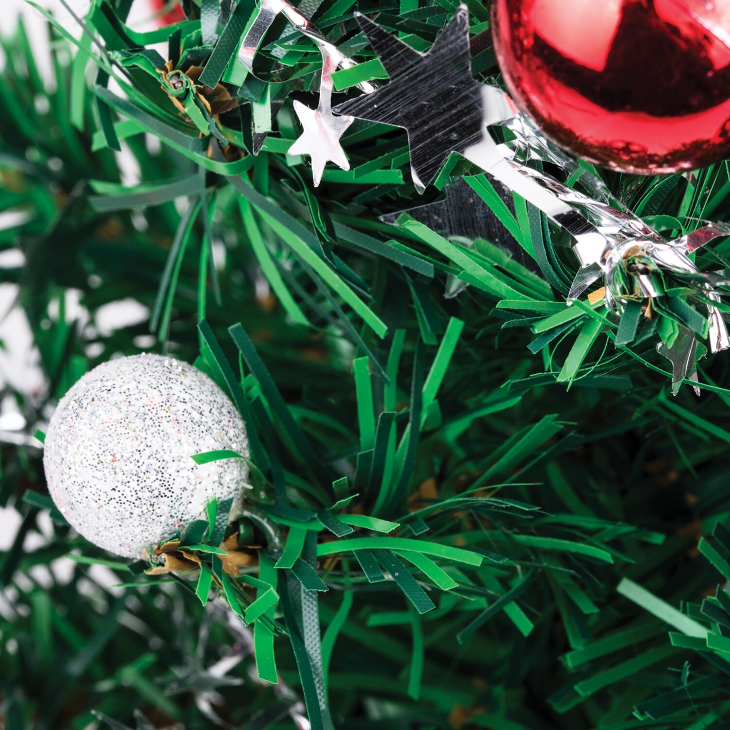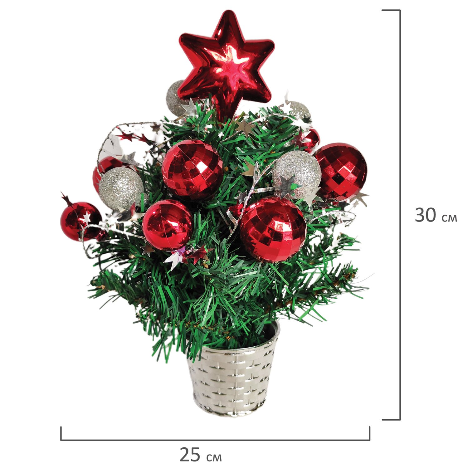 В комплект декоративной ели входят красные и серебристые украшения в форме елочных шаров, имитация серебристой гирлянды с декором в виде звезд, а также пластиковая красная звезда, закрепленная на макушке ели. Материал хвои - ПВХ. Тип крепления ветвей – примотка. Данный способ крепления предполагает, что после покупки ели необходимо самостоятельно расправить веточки для того, чтобы ель приобрела нужную форму. Высота ели - 30 см (включая подставку в форме декоративного горшка серебристого цвета), диаметр нижнего яруса - 25 см.