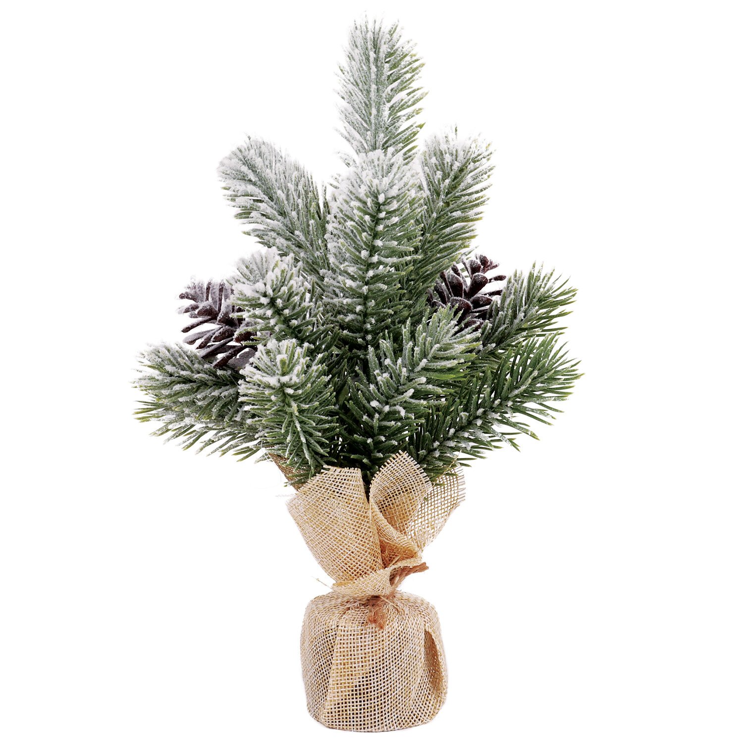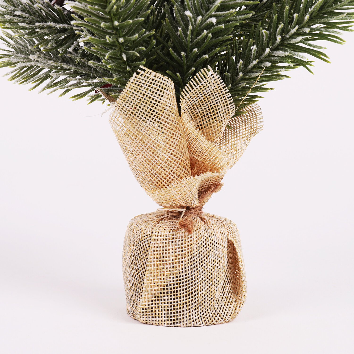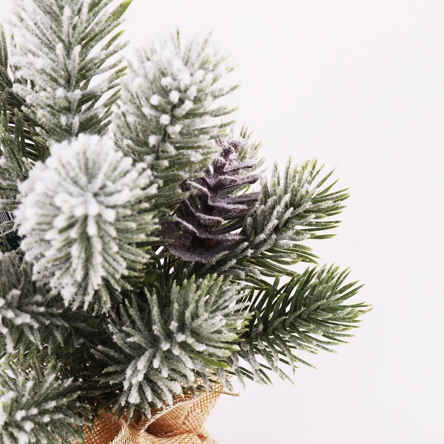 Ель искусственная настольная заснеженная с шишками высотой 25 см представляет собой конструкцию из металлического каркаса и закрепленных к нему ветвей.