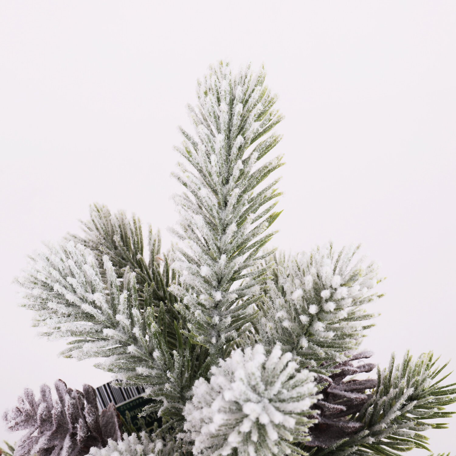 Материал – 100% литой ПЭТ. Цвет хвои – зелёный. Иголки украшены искусственным белым снегом и декоративными сосновыми шишками размером 3x4 см. Материал подставки – застывший цементный раствор, обёрнутый декоративной холщовой тканью.