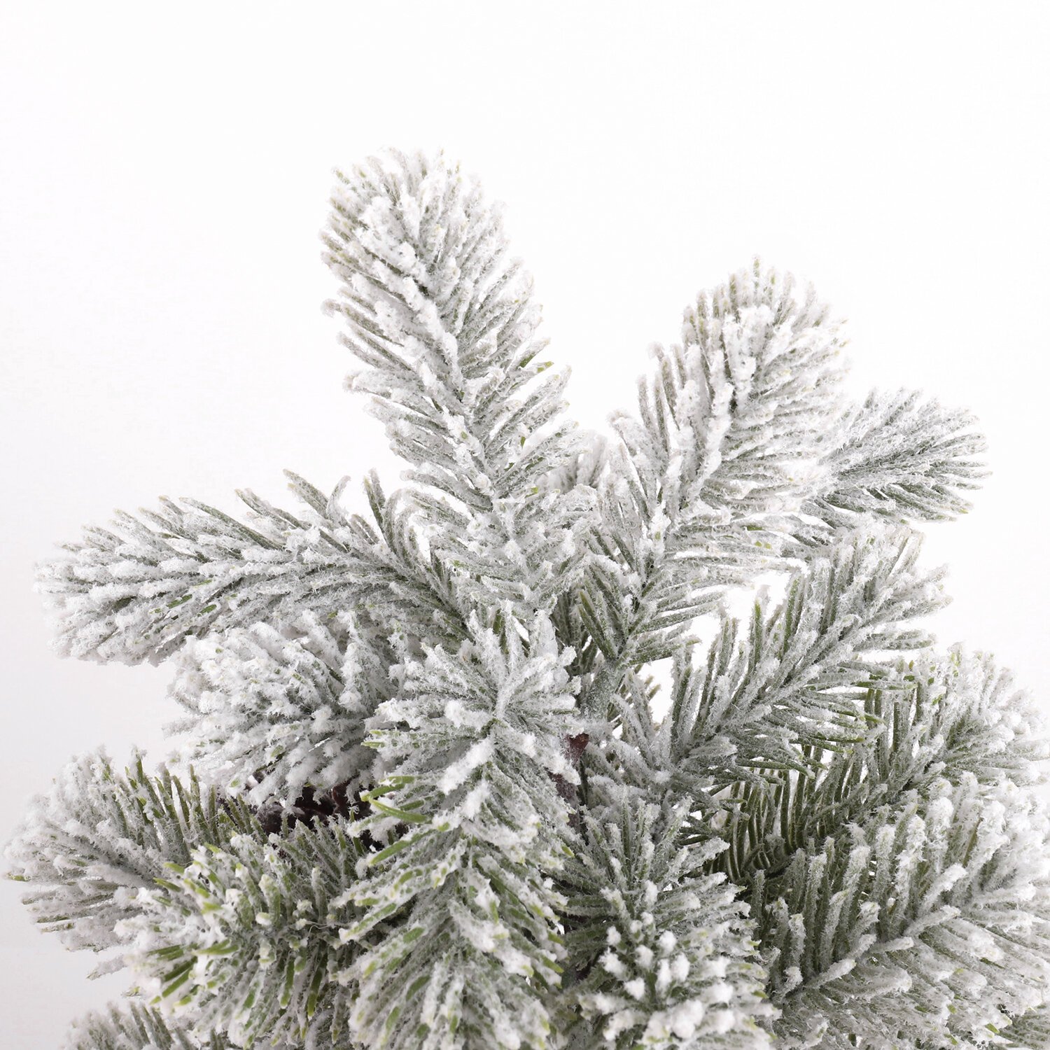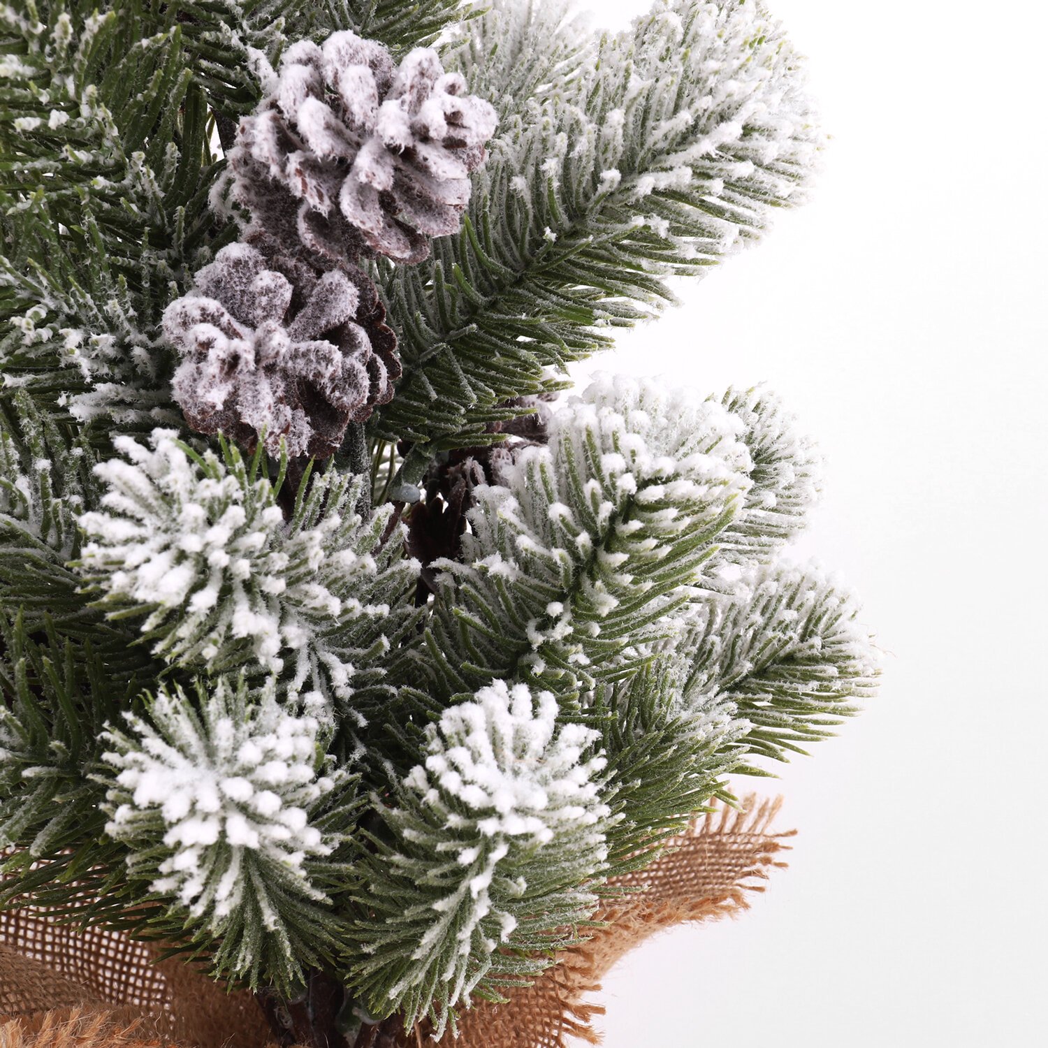 Материал – 100% литой ПЭТ. Цвет хвои – зелёный. Иголки украшены искусственным белым снегом и декоративными сосновыми шишками размером 3x4 см. Материал подставки – застывший цементный раствор, обёрнутый декоративной холщовой тканью.