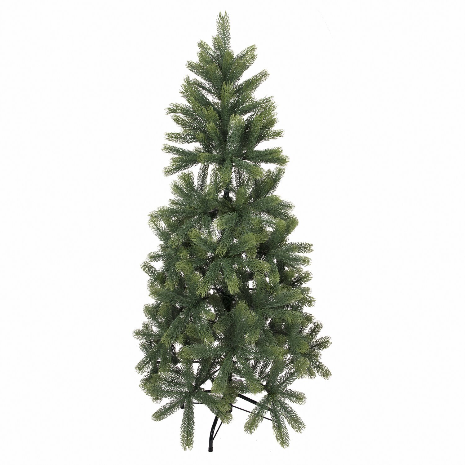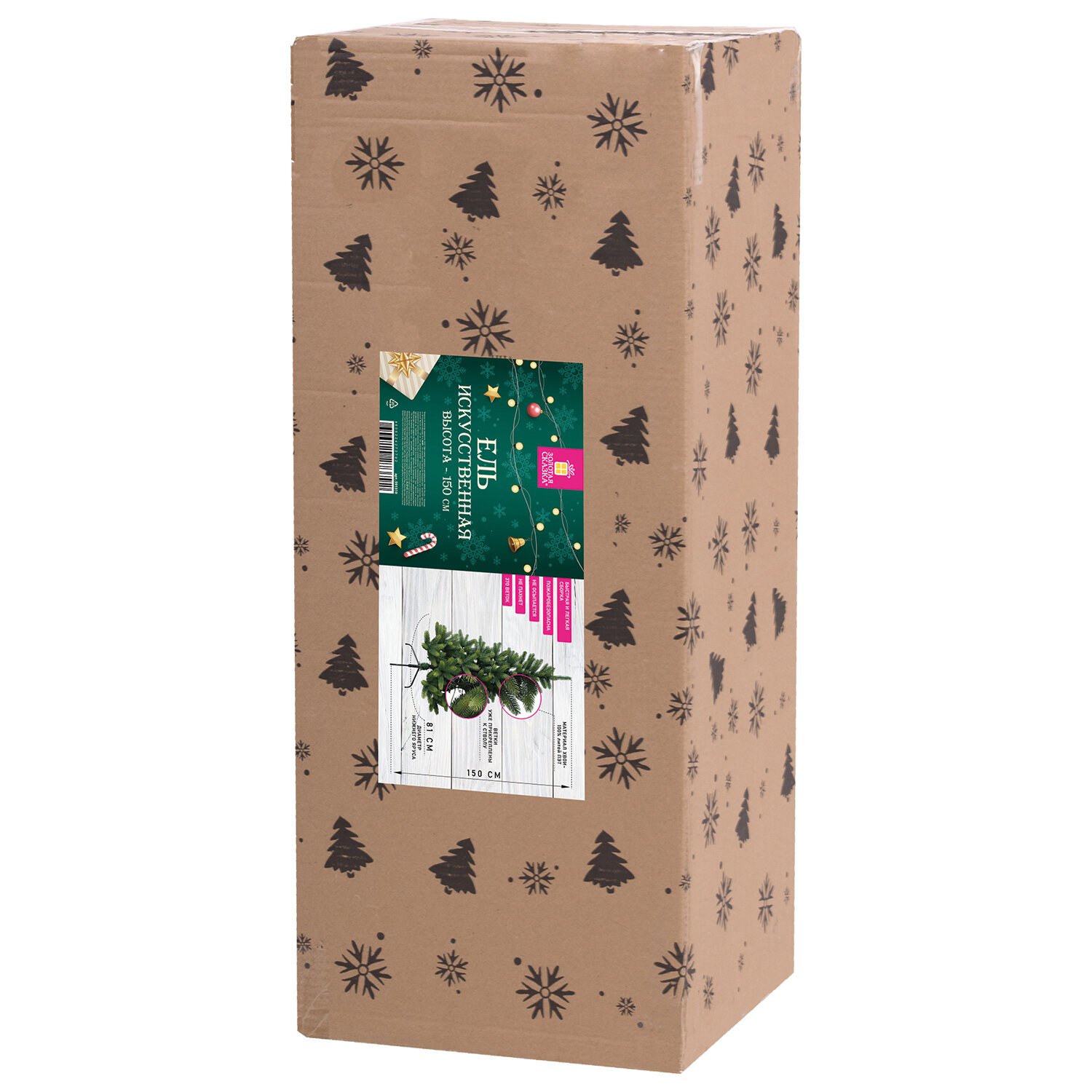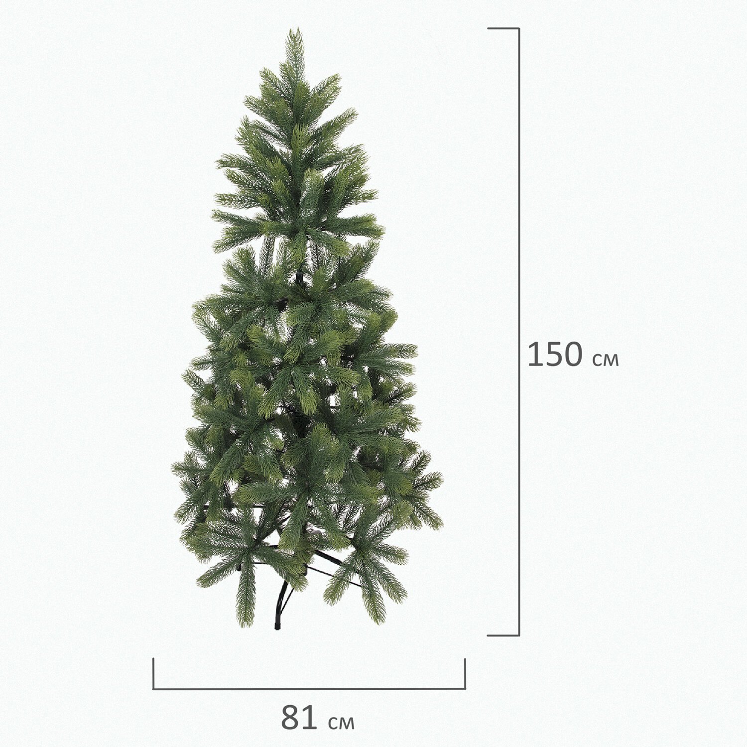 Ель искусственная напольная представляет собой конструкцию из металлического каркаса и закрепленных на нем ветвей. Материал хвои - литой ПЭТ. Цвет хвои - зеленый. Высота ели - 150 см. Диаметр нижнего яруса - 81 см. Количество веток - 370.
