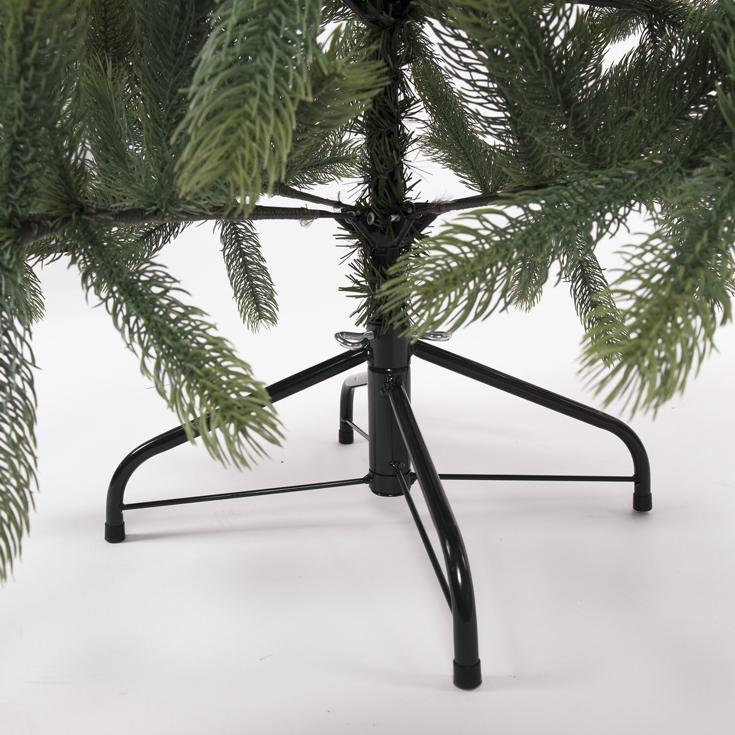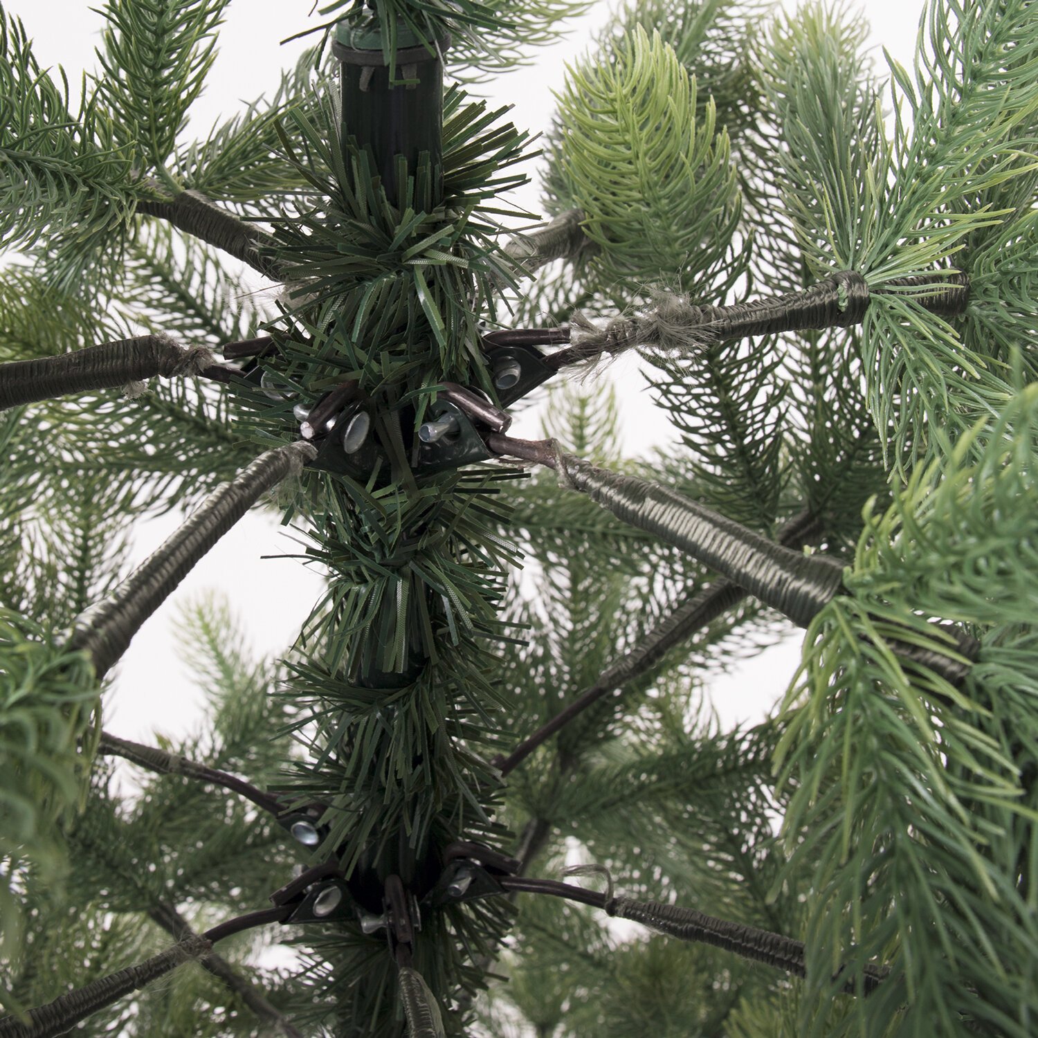 Тип крепления ветвей к нижней и средней части ствола - откидной. Данный тип крепления подразумевает, что ветви уже прикреплены к стволу посредством откидного механизма. Тип крепления ветвей к верхней части ствола - примотка. Данный тип крепления подразумевает, что ветви уже прикреплены к стволу посредством полипропиленовой нити, плотно обмотанной вокруг основания ветви. Ствол состоит из трех разборных частей.