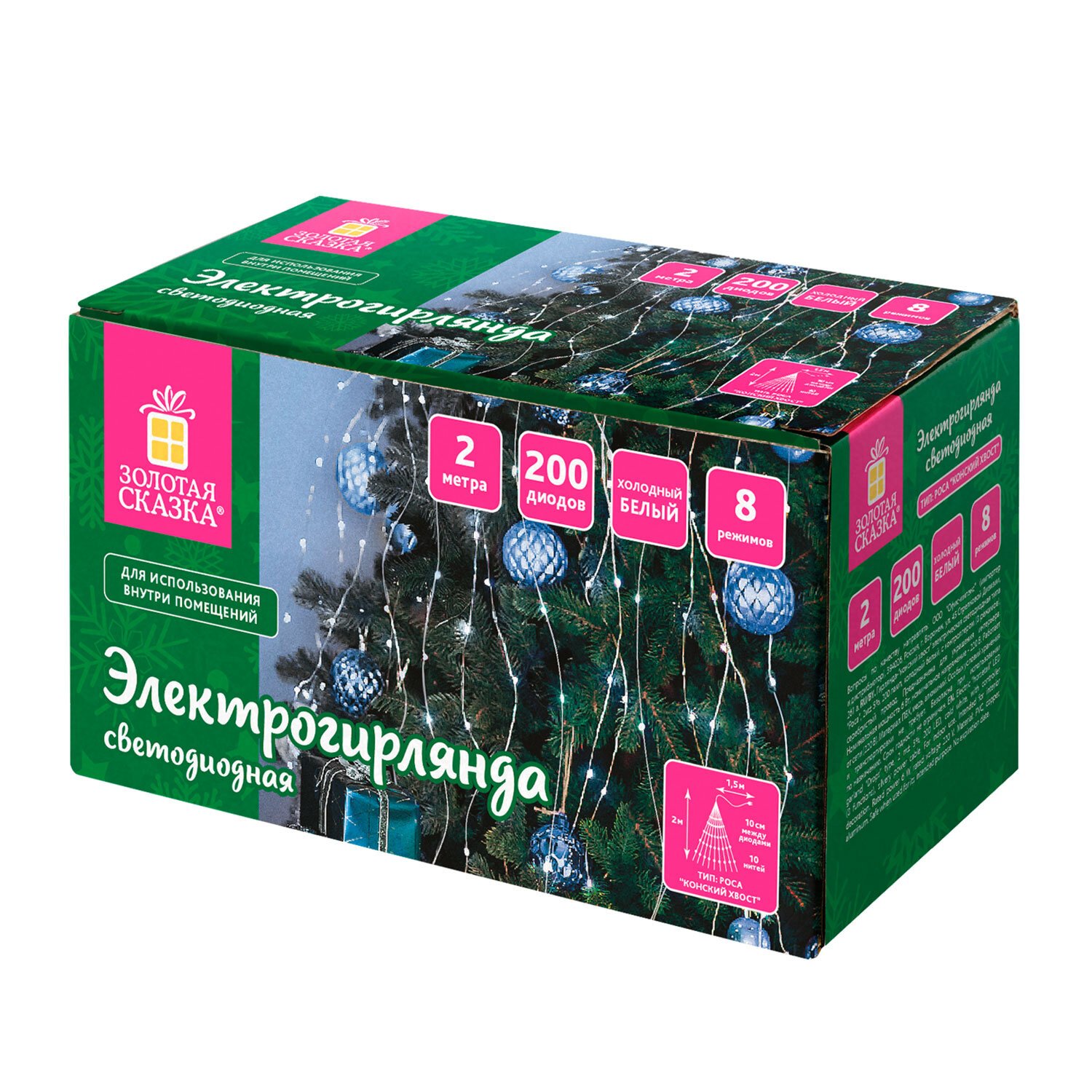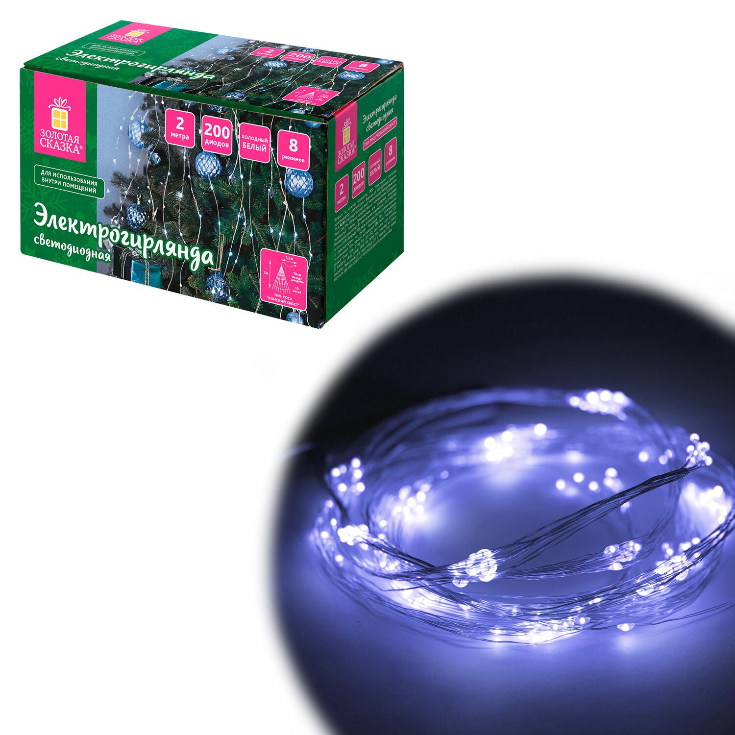 Цвет свечения гирлянды – холодный белый. Конструкцией гирлянды предусмотрено наличие контроллера для принудительного переключения между режимами свечения. Количество режимов свечения – 8 шт.